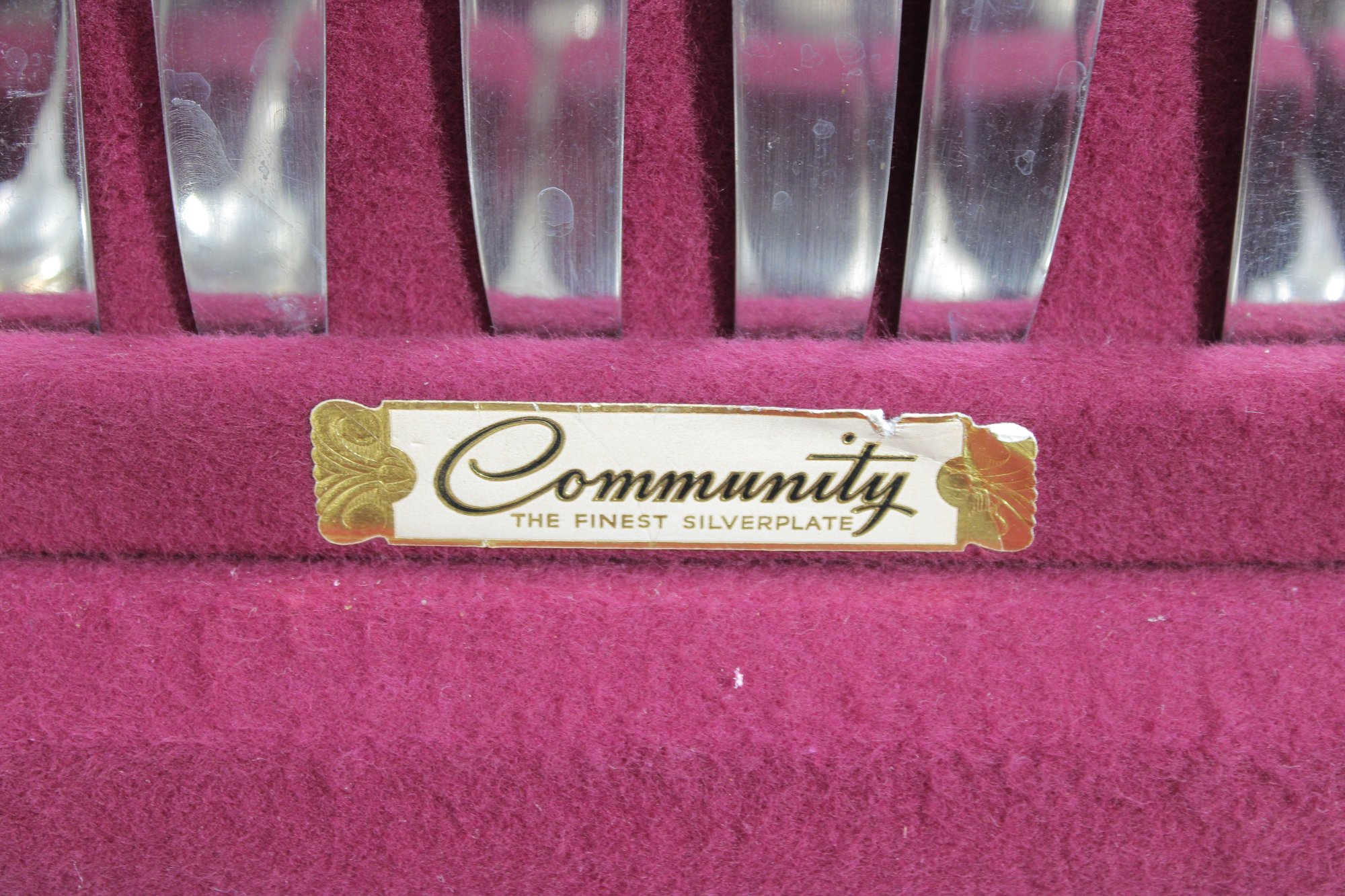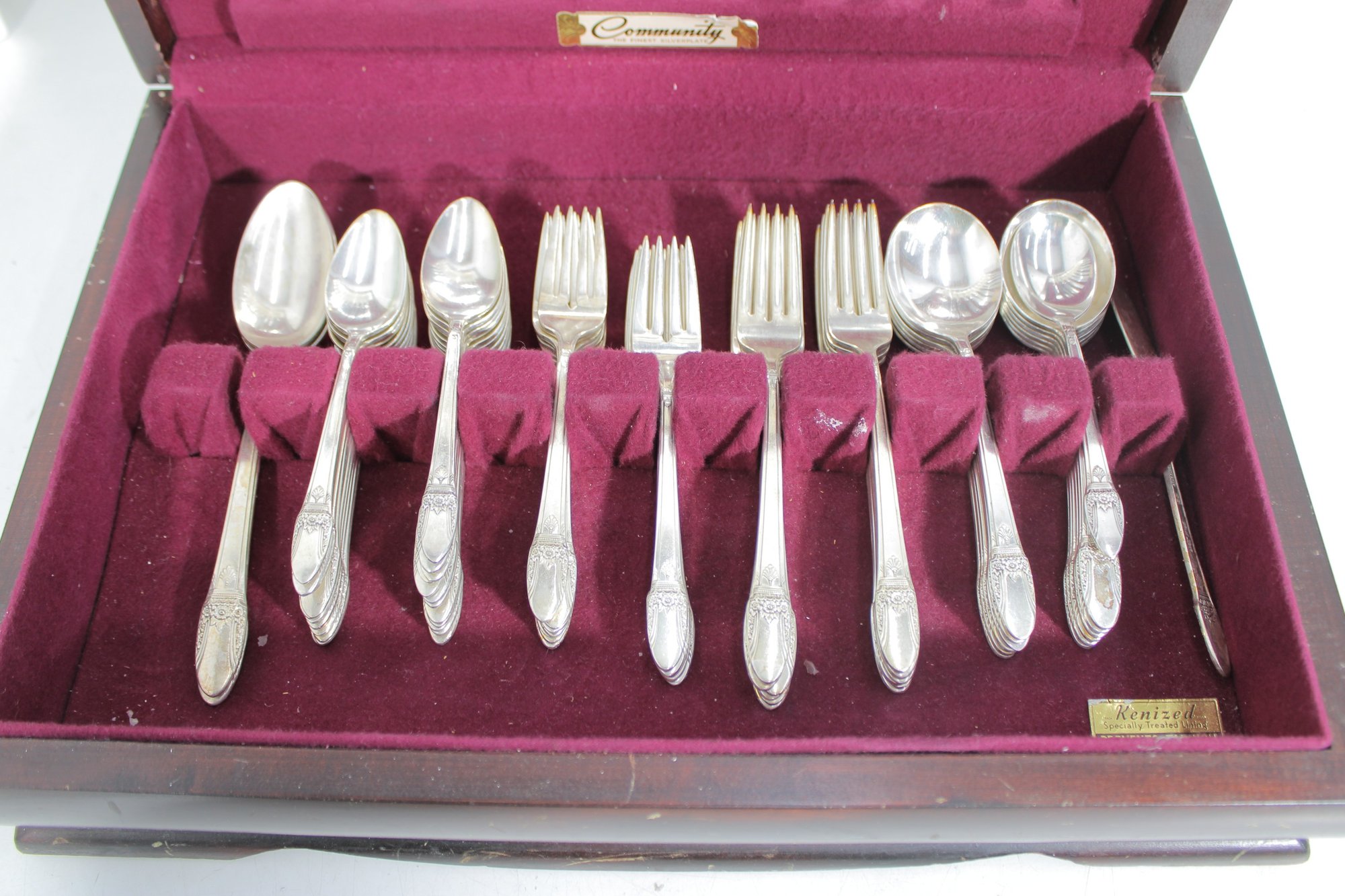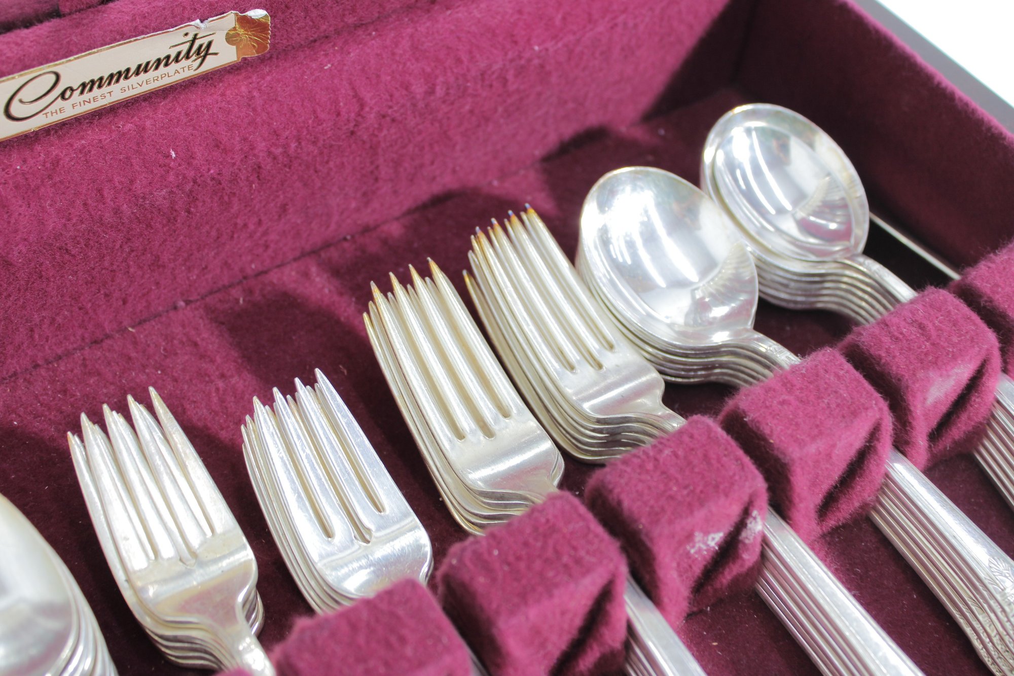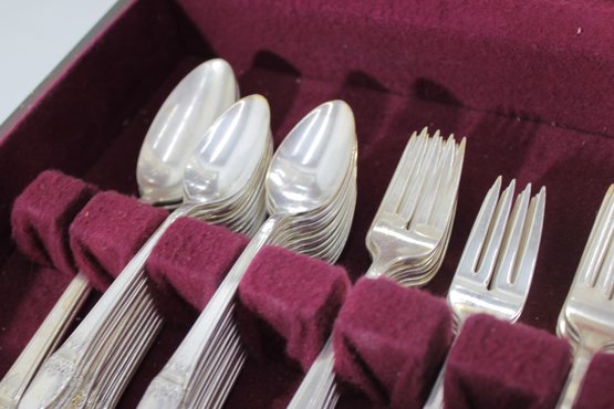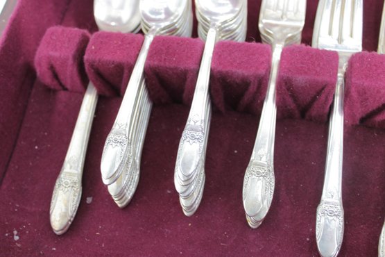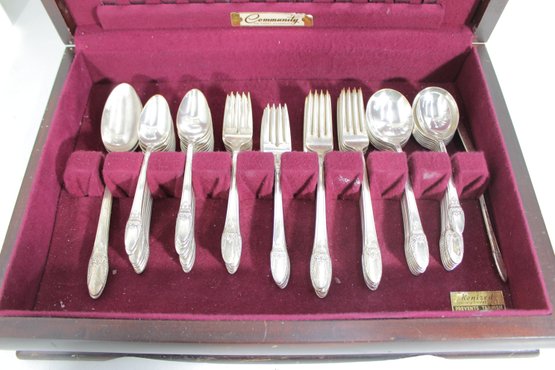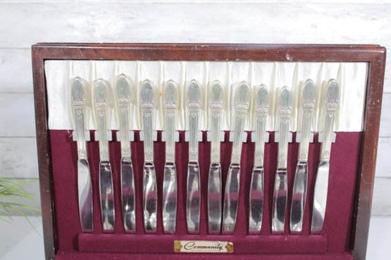 Vintage Community silverplate flatware set offered as a partial service, housed in its original storage chest with burgundy lining. This elegant set features a classic pattern with detailed handles, perfect for adding to an existing collection or starting a vintage table setting.