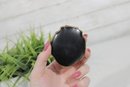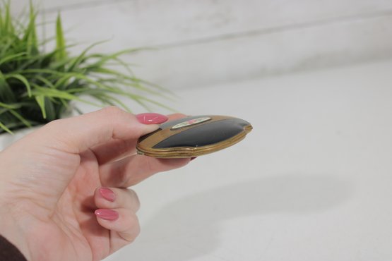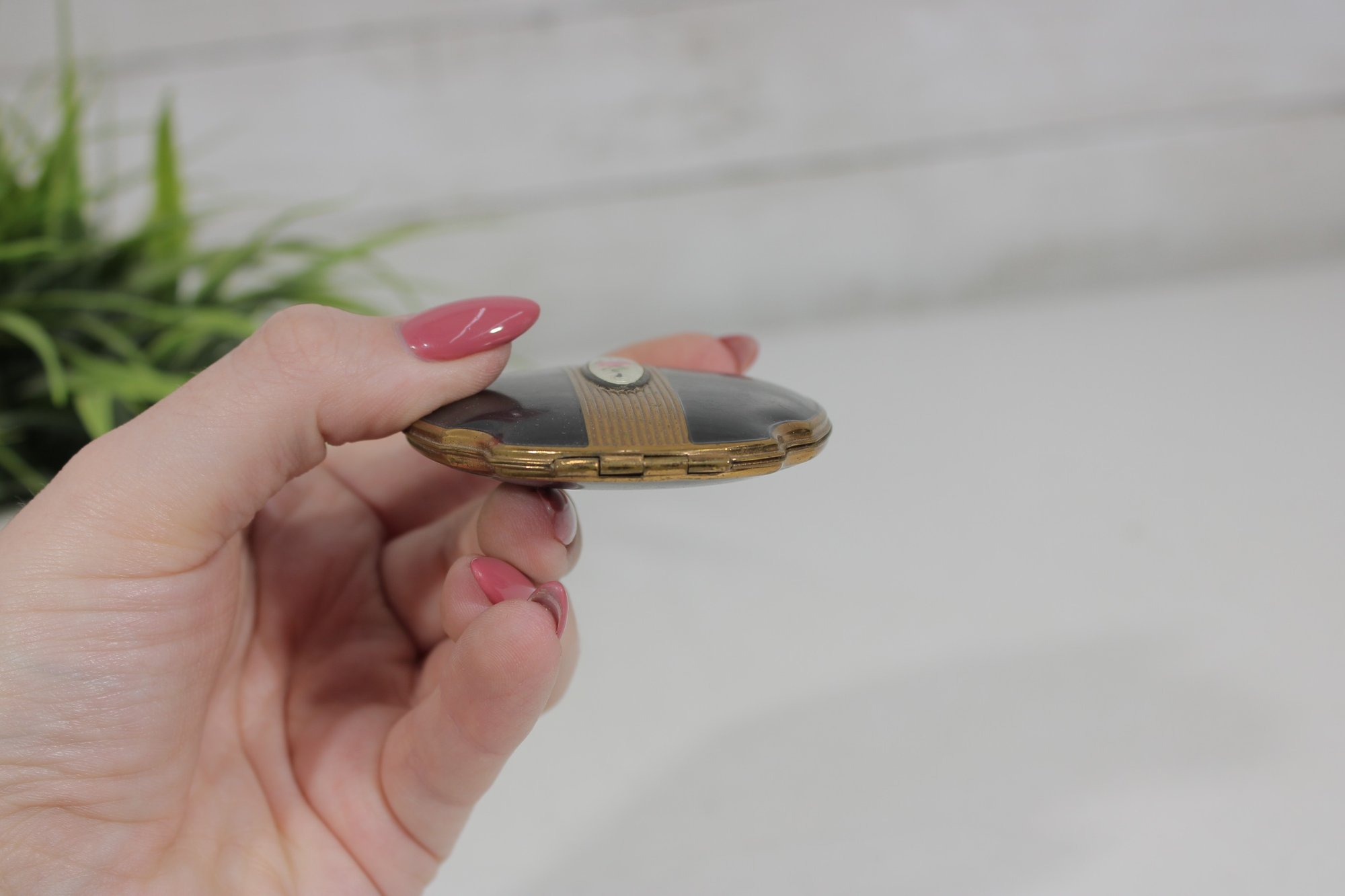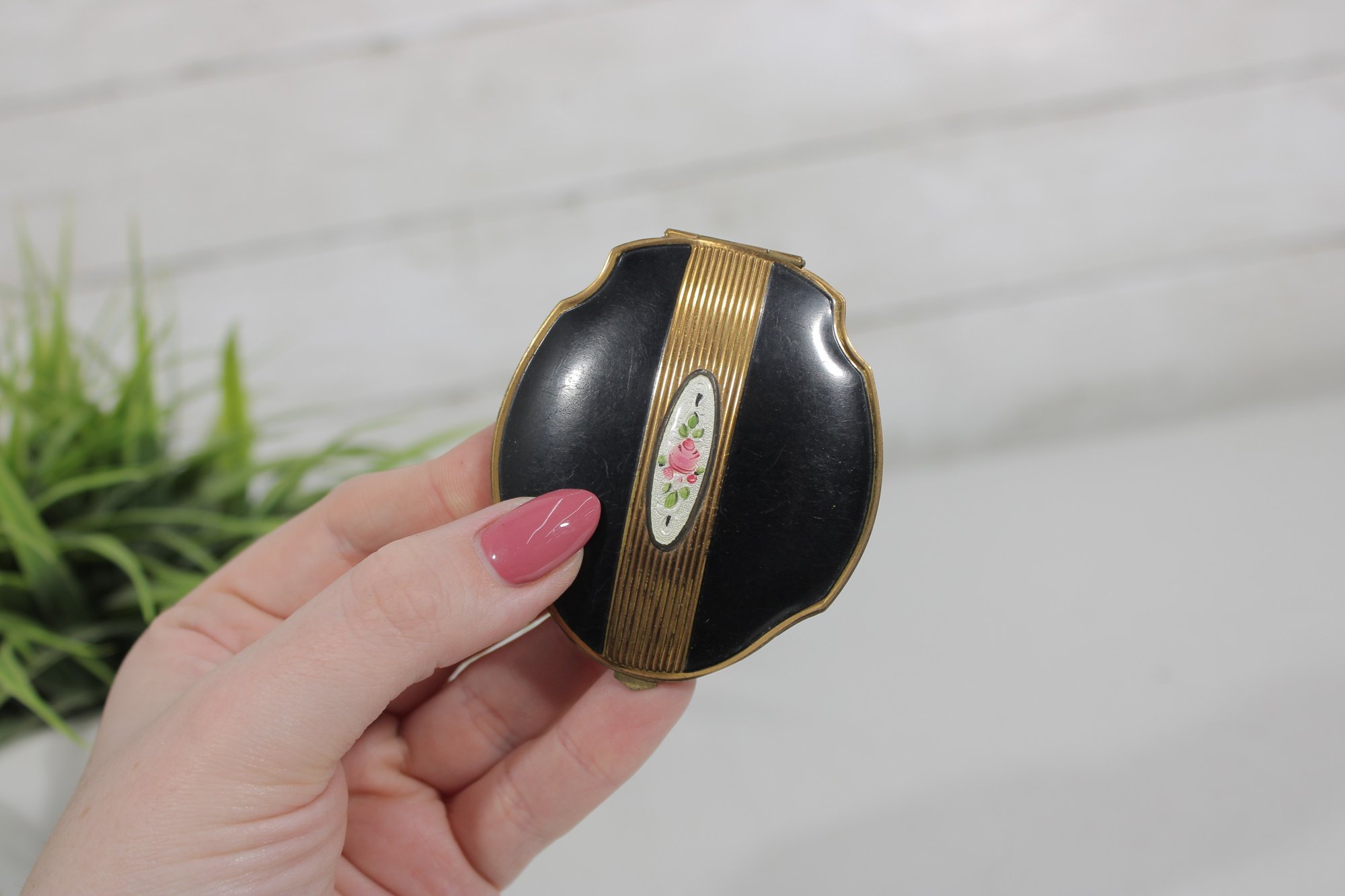 vintage powder compact featuring a classic black enamel top accented with gold-tone trim and a small oval floral inset design at the center. The compact has a graceful scalloped shape and a decorative ribbed gold-tone band across the lid, giving it a refined vintage vanity look.