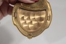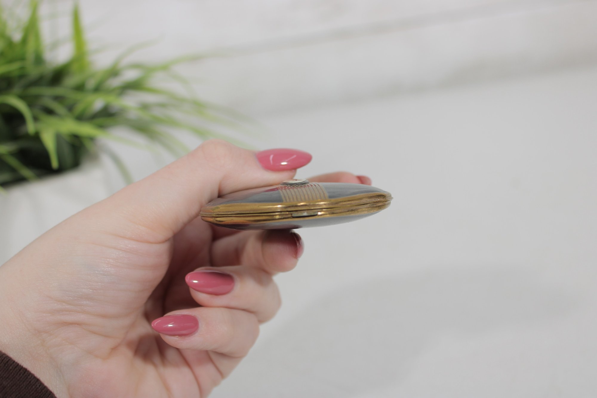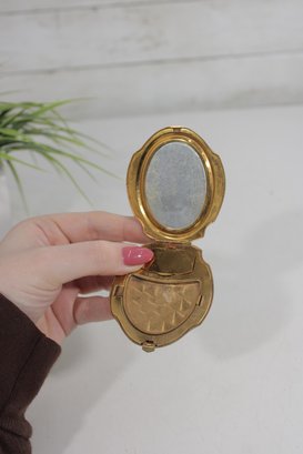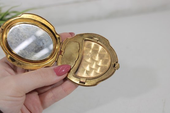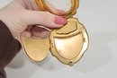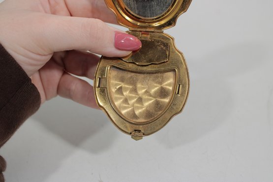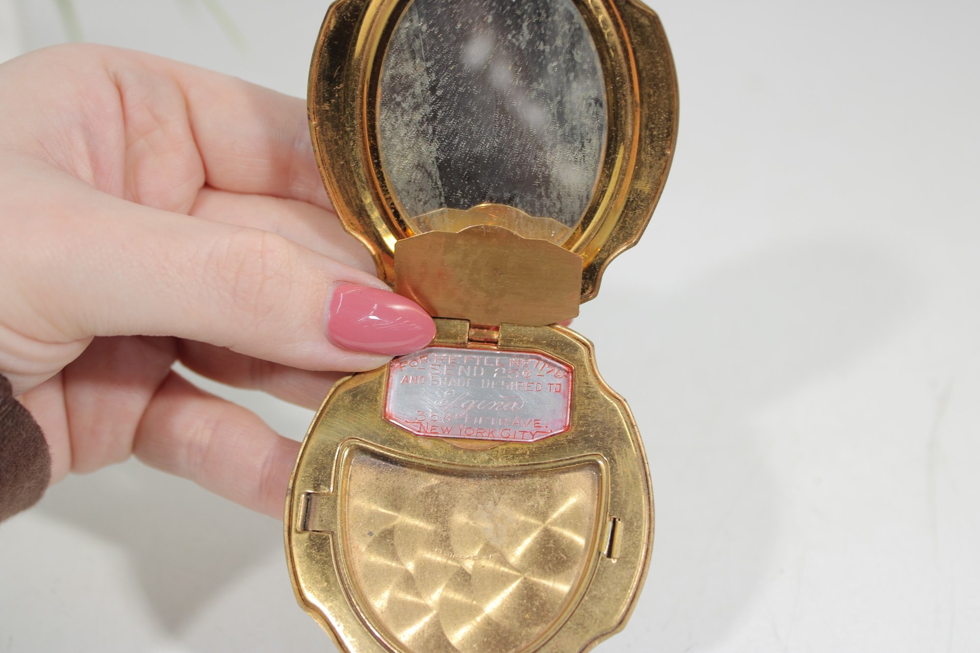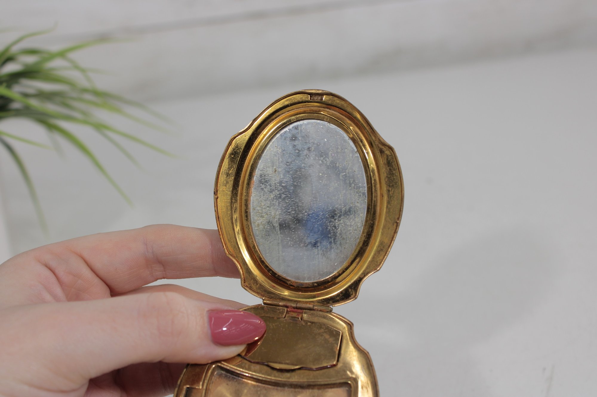 The compact opens to reveal a mirror on the inside lid and a compartment for powder. The interior still retains the metal powder plate, making it a lovely display piece for collectors of vintage vanity accessories.