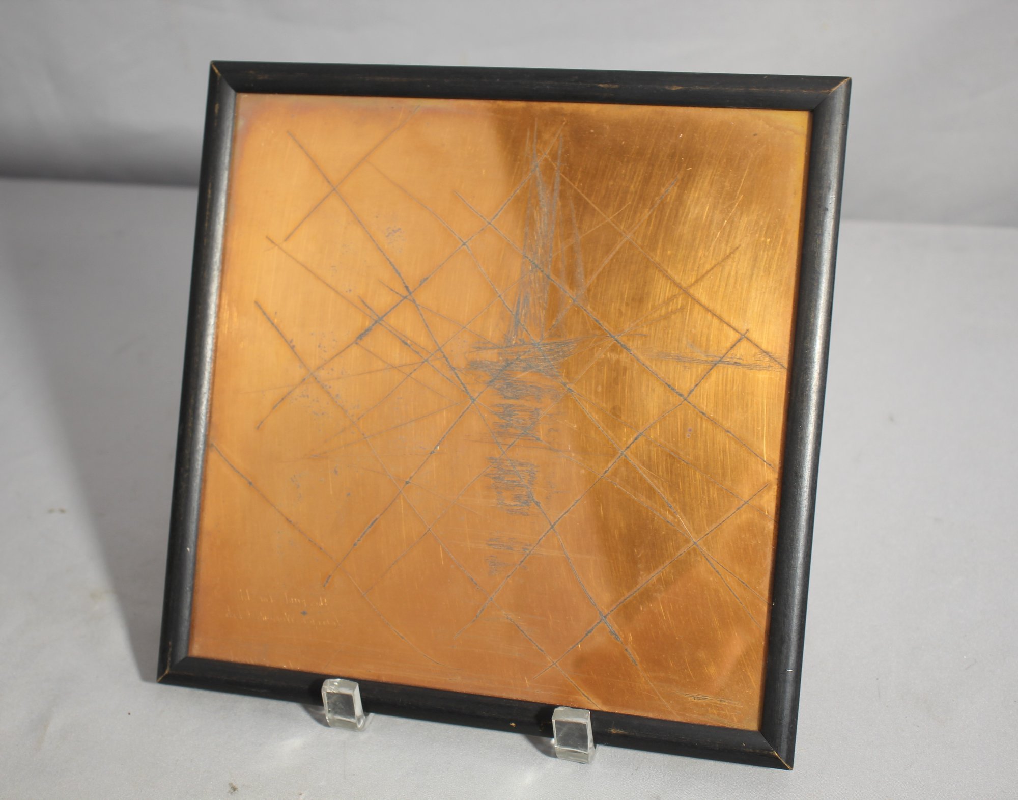 This plate showcases a richly textured surface highlighted by an intriguing etched crosshatch pattern that draws the eye to a central abstract form, creating a dynamic visual effect. Encased in a simple black frame, this artwork exudes a rustic charm that will add a touch of historical elegance to any room. The copper surface has aged gracefully, exhibiting a warm patina and some signs of wear that enhance its vintage appeal.