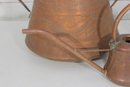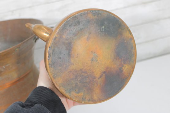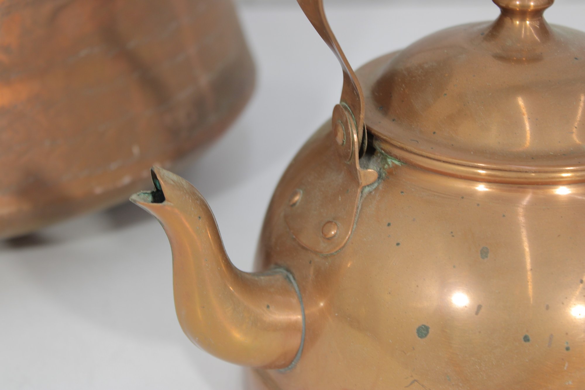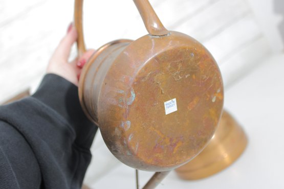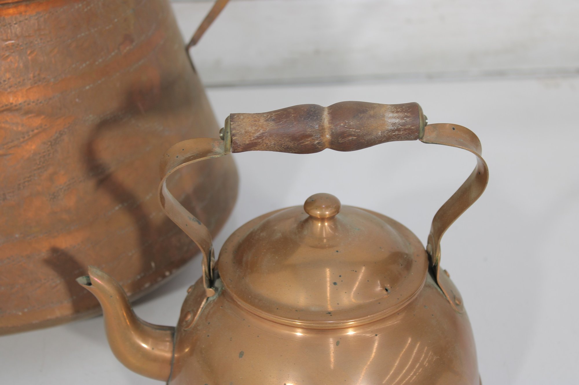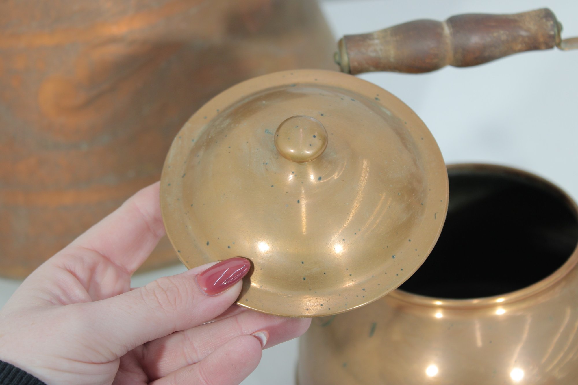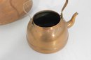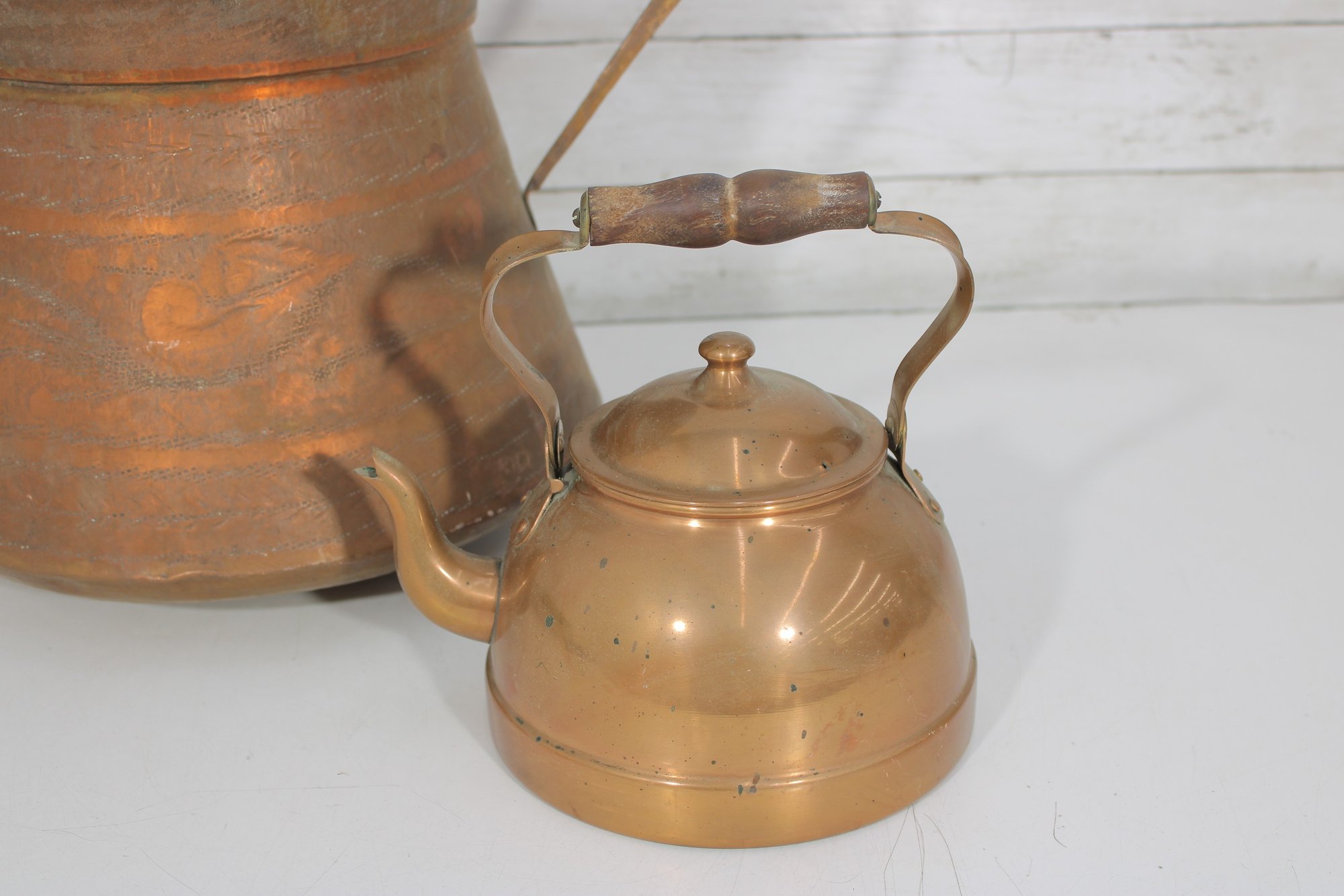 • Vintage Copper Tea Kettle – Traditional form with hinged lid and wooden handle grip. Smooth copper body with natural aging consistent with vintage use.
