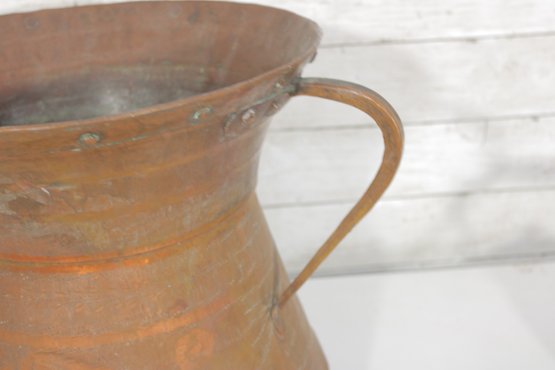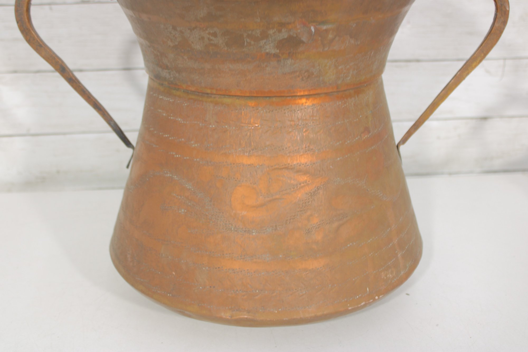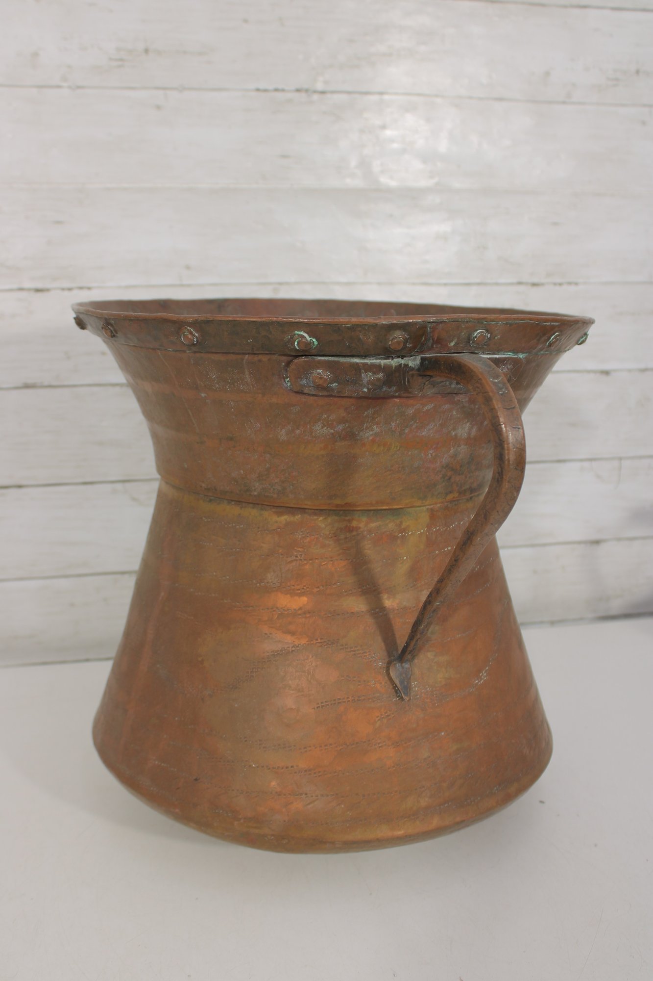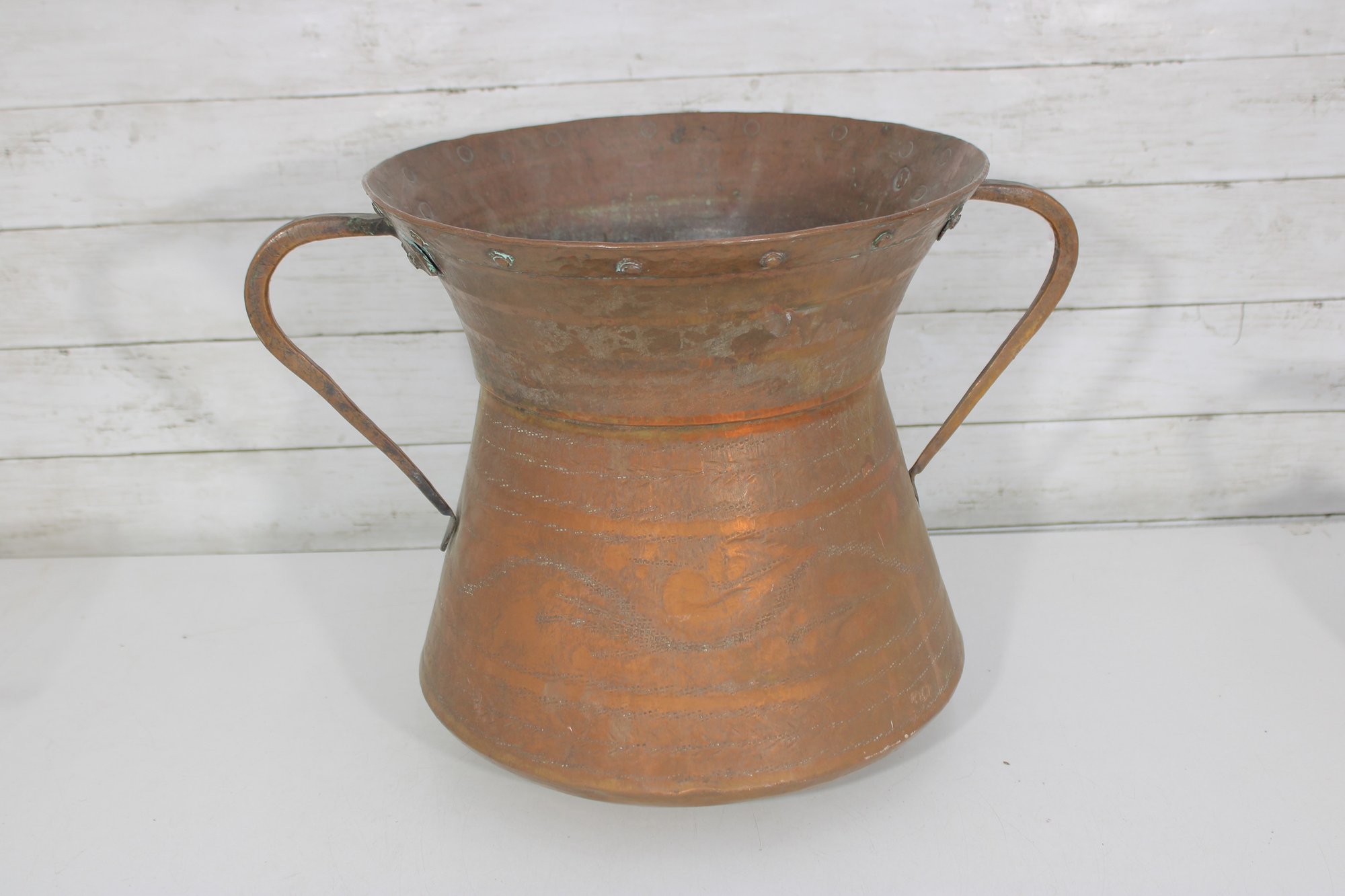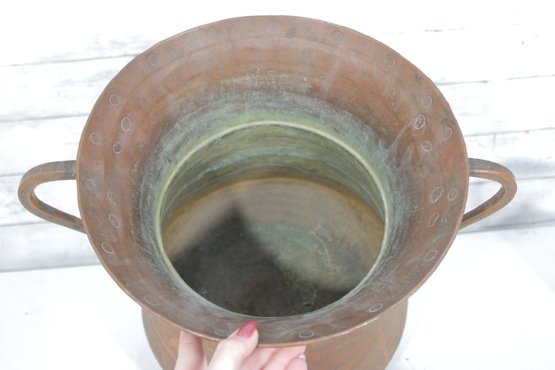 • Large Hammered Copper Jardiniere / Cachepot – Beautifully shaped with flared rim and dual side handles. Features an embossed and hammered finish with warm aged patina. Ideal for use as a planter, umbrella stand, or decorative floor vessel.