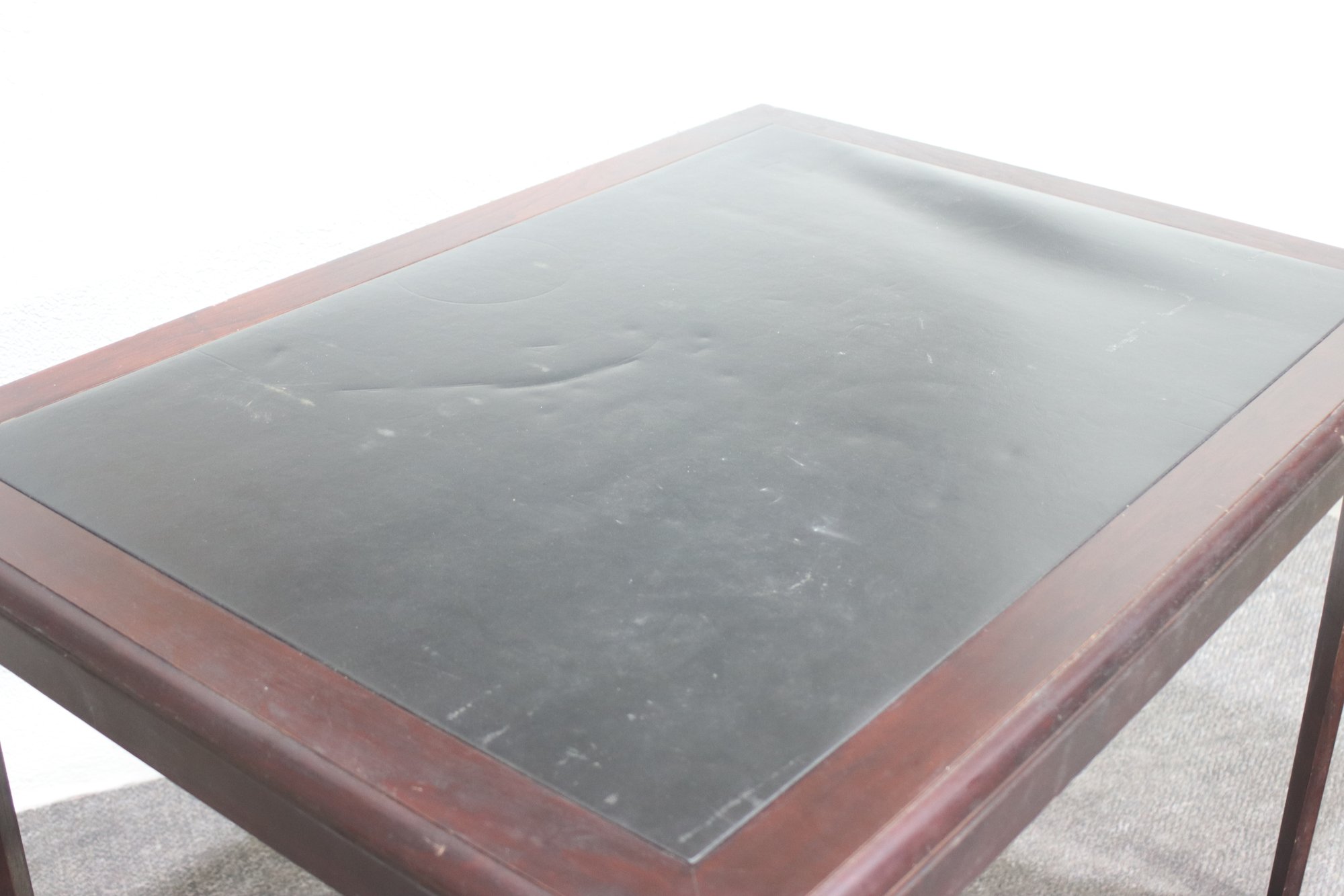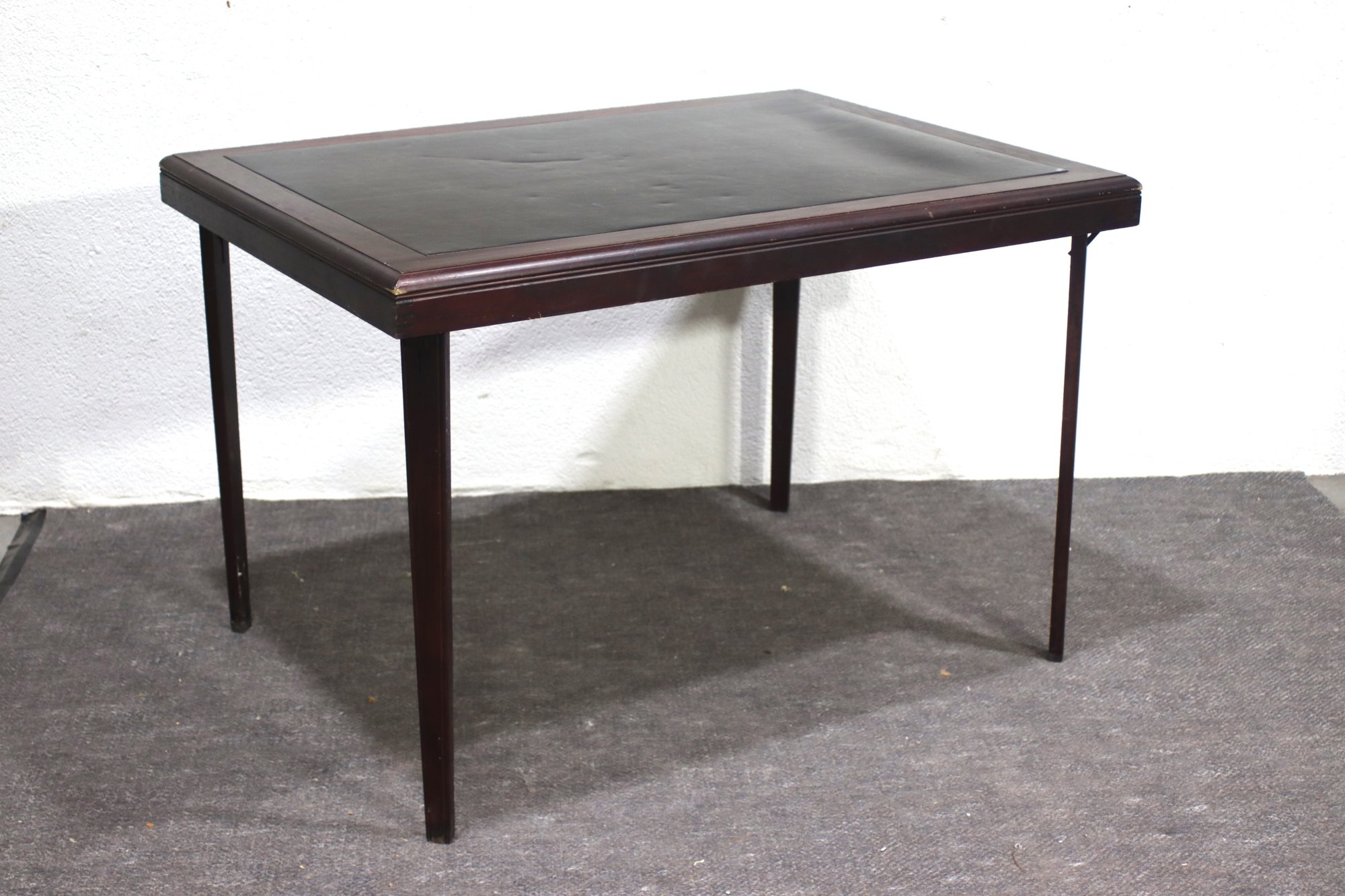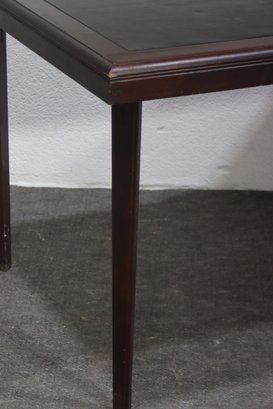 This vintage Cosco folding table combines functionality with a classic design, featuring a wood-trimmed frame, a black vinyl top, and a sturdy foldable metal base for easy storage and portability. Perfect for workspaces, crafting, or additional dining space, this table offers versatility in any setting.