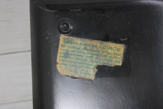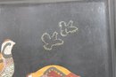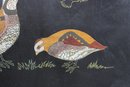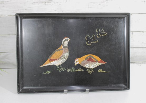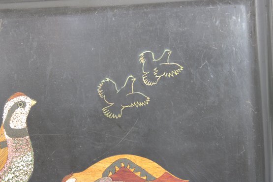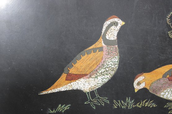Classic vintage Couroc of Monterey serving tray featuring a beautifully detailed inlay design of pheasant birds with flying silhouettes above. The intricate craftsmanship combines natural materials set into a sleek black background—an iconic style of mid-century Couroc pieces.