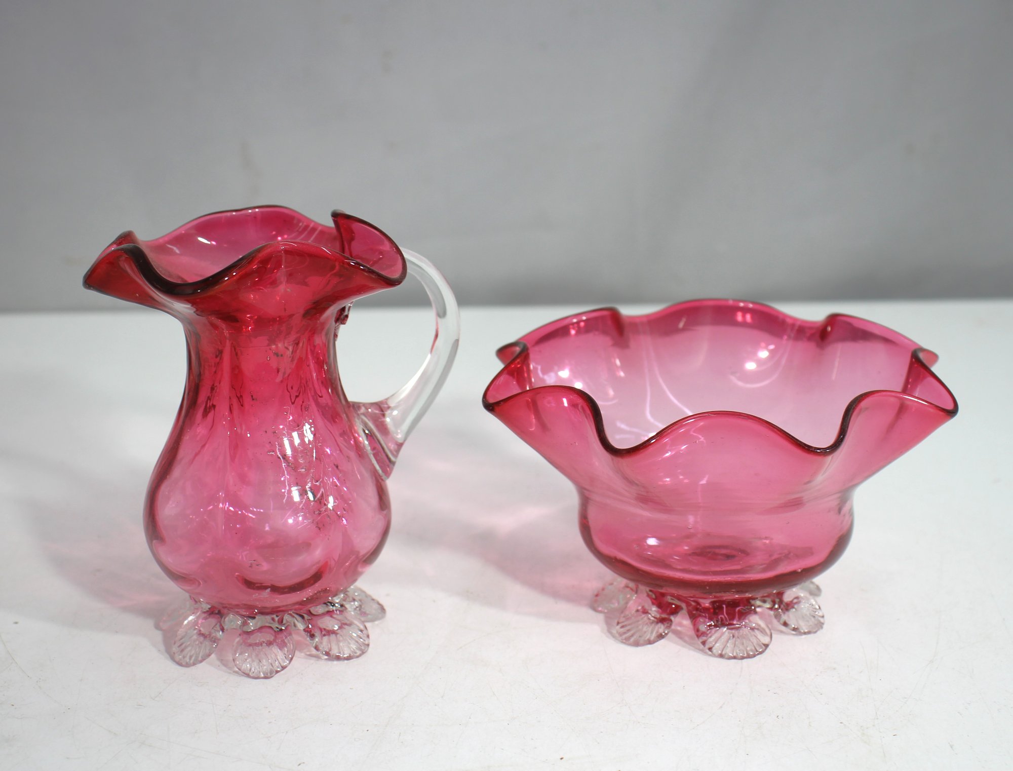 Both pieces feature a rich cranberry pink hue with intricate details, making them perfect for collectors, Victorian-style décor, or elegant table settings.