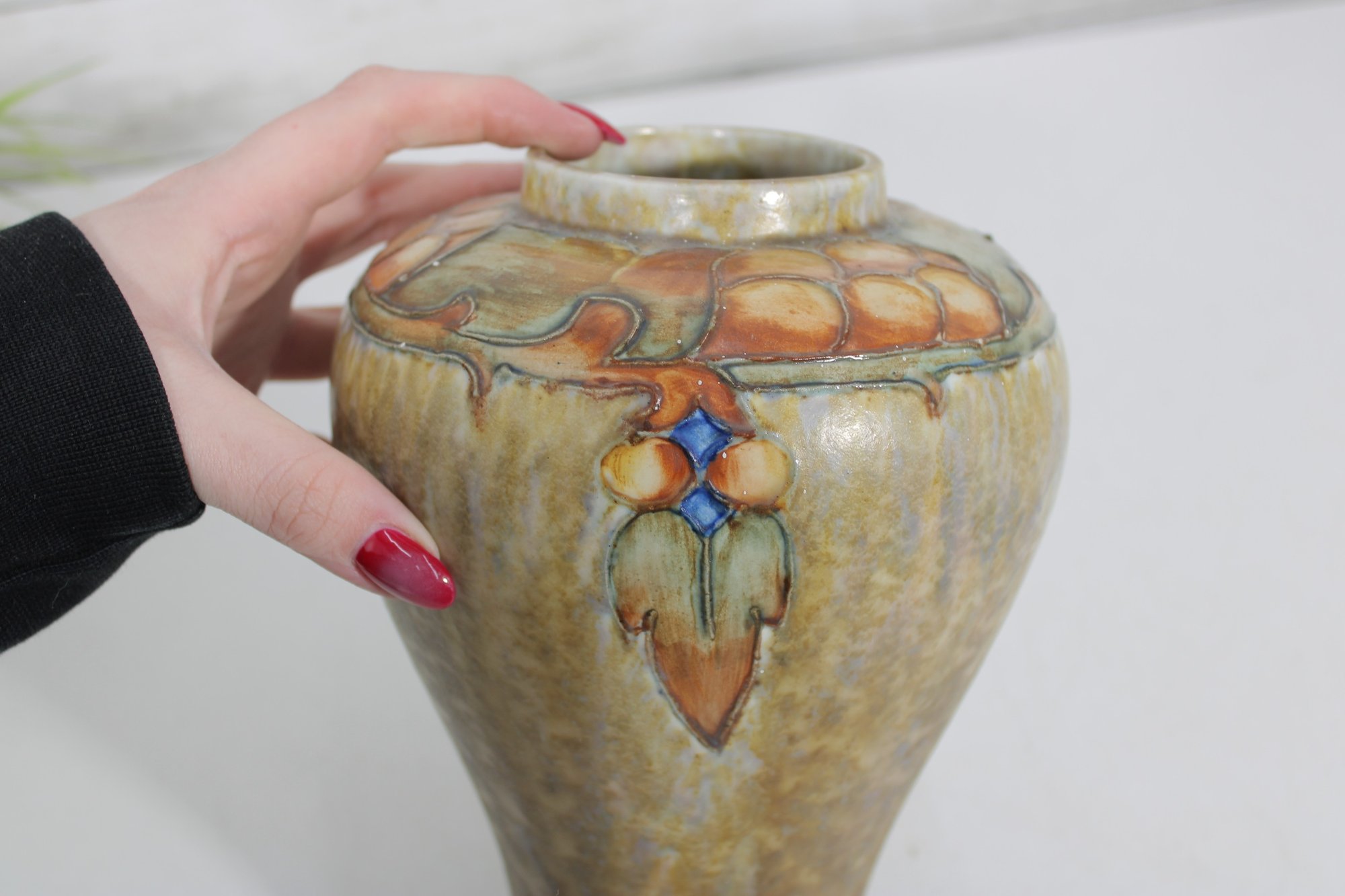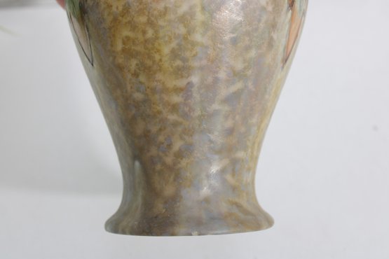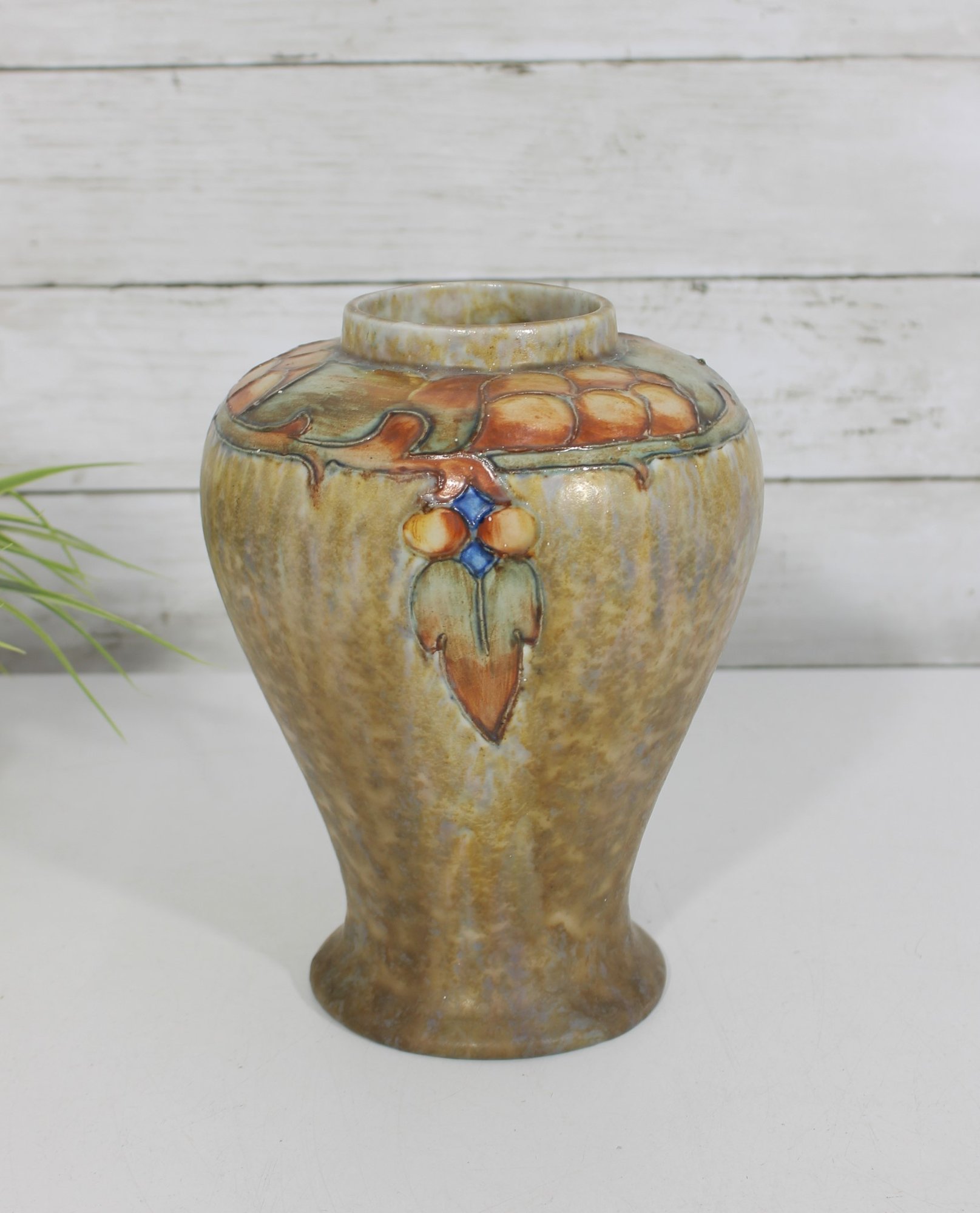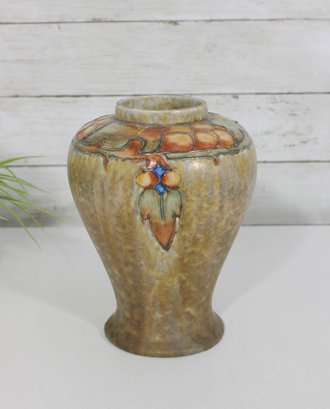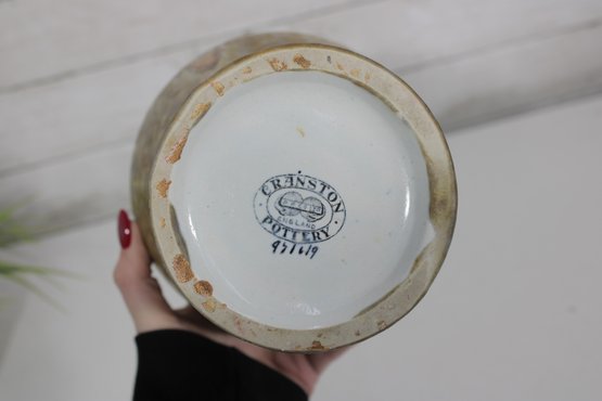 a stunning vintage Cranston Pottery vase, featuring a beautifully hand-decorated floral motif with rich, earthy glaze tones. This piece showcases a classic art pottery style with a raised, dimensional design around the shoulder, highlighted by warm hues of tan, amber, green, and soft blue accents.