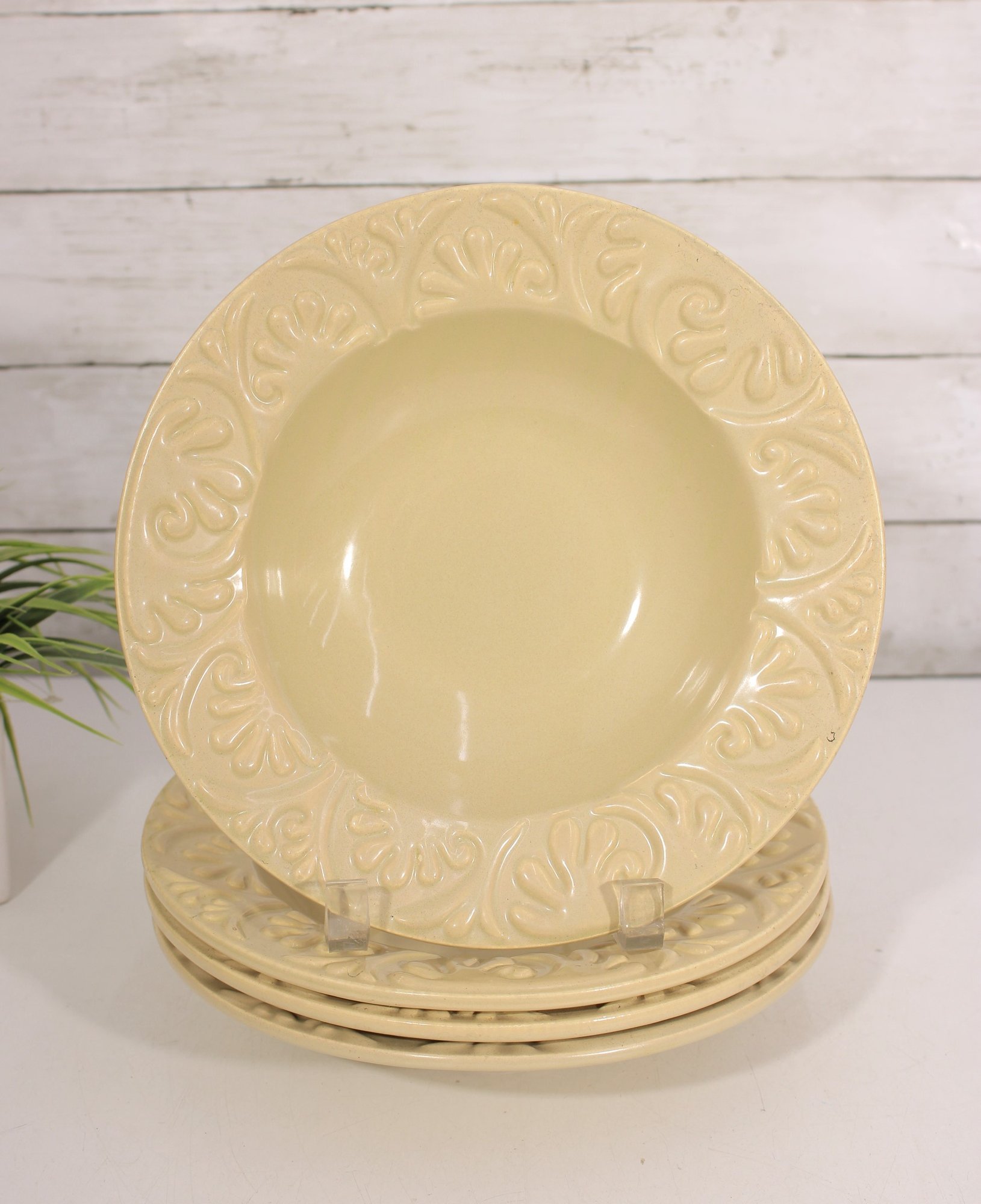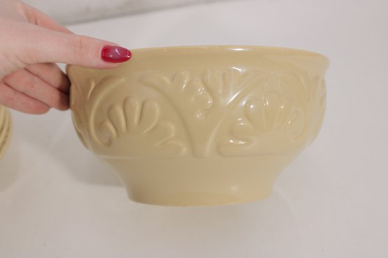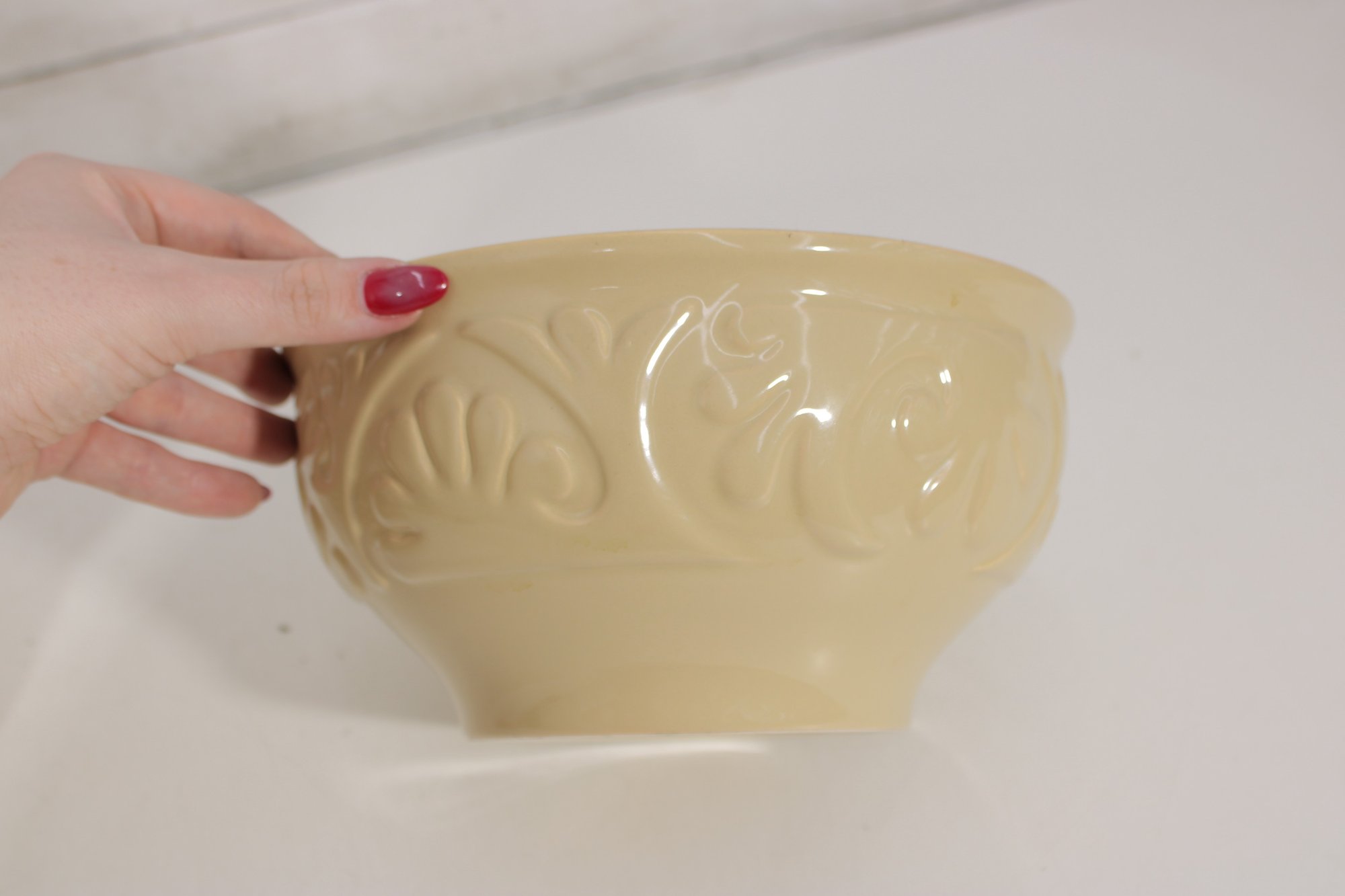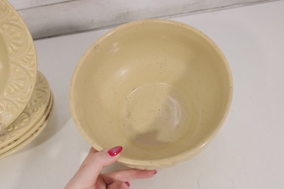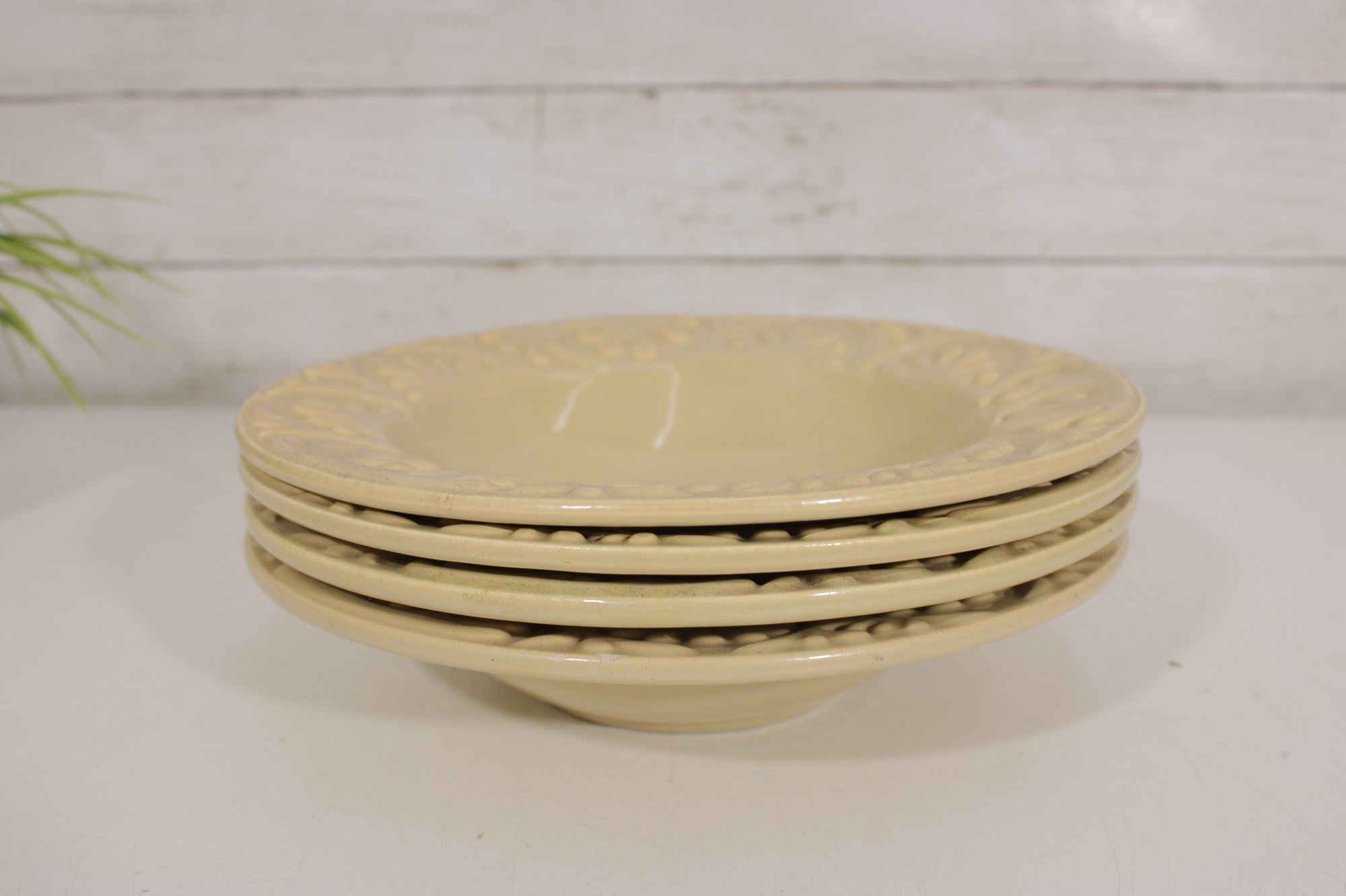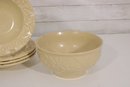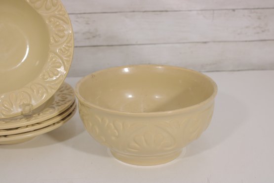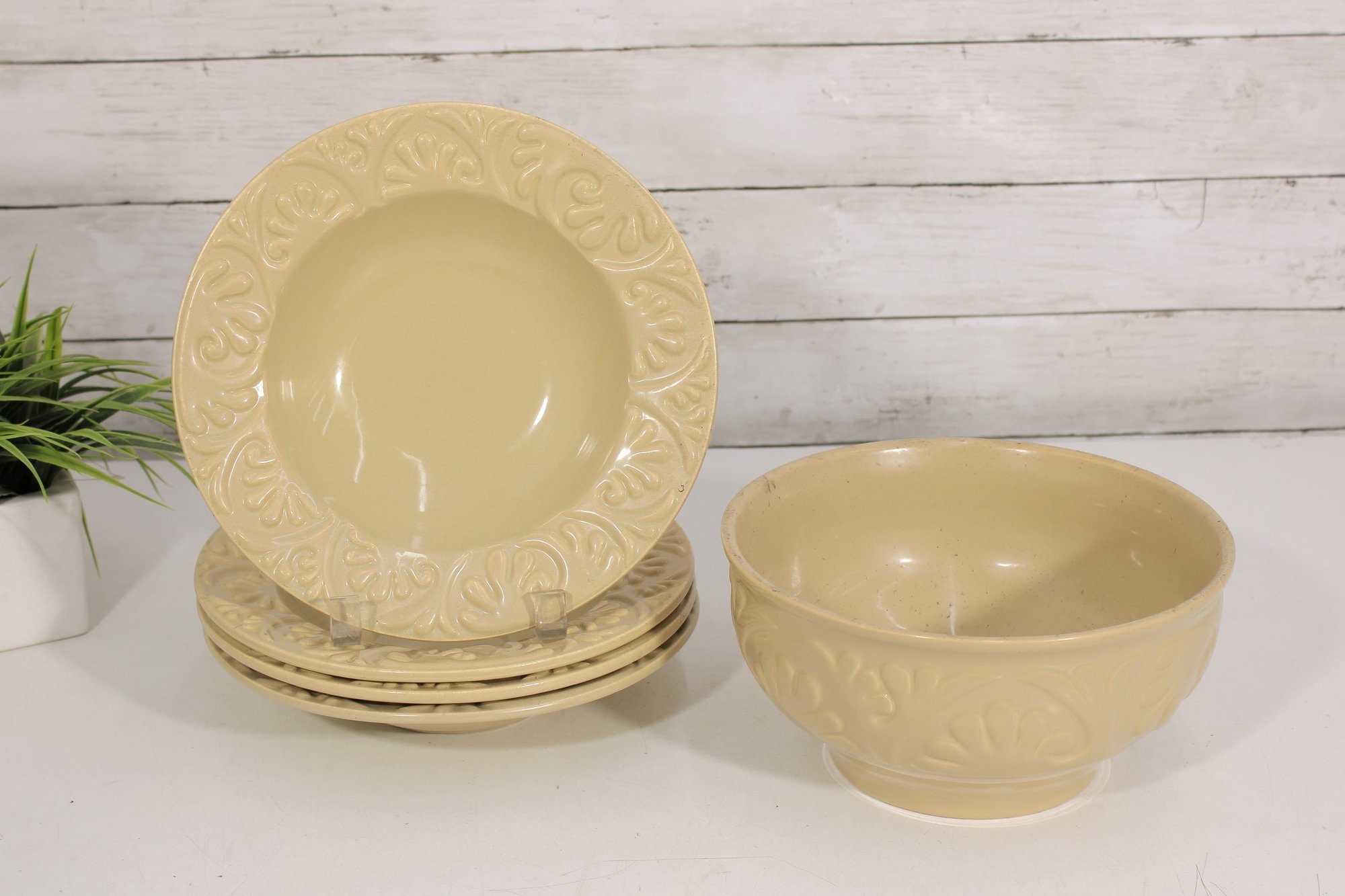 Beautiful vintage ceramic serving set featuring a warm cream glaze with an elegant embossed floral and scroll pattern. This charming set includes one large serving bowl and four matching plates, all crafted with a classic, timeless design that complements both traditional and farmhouse-style table settings.