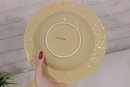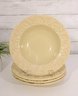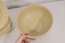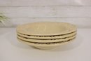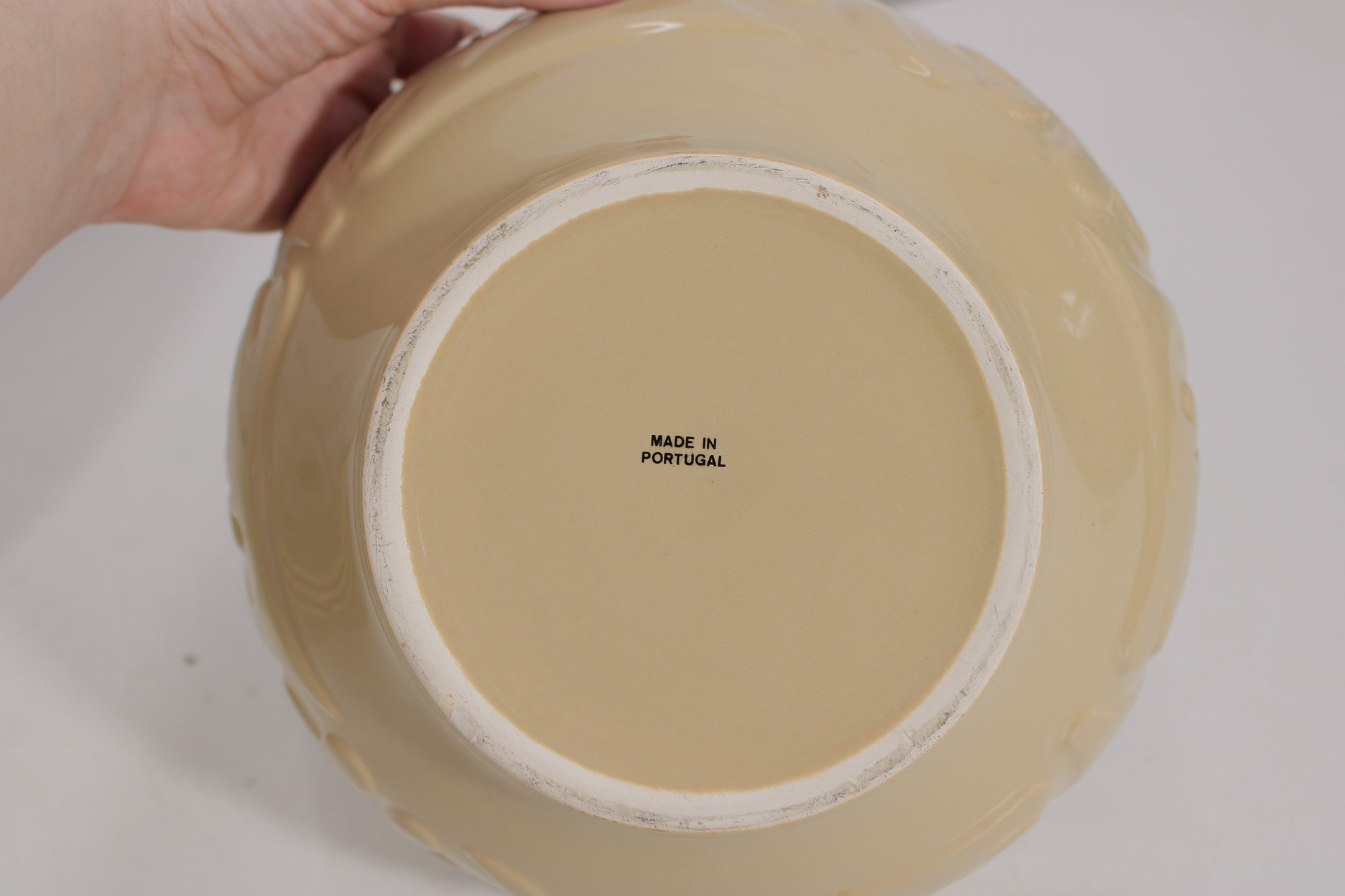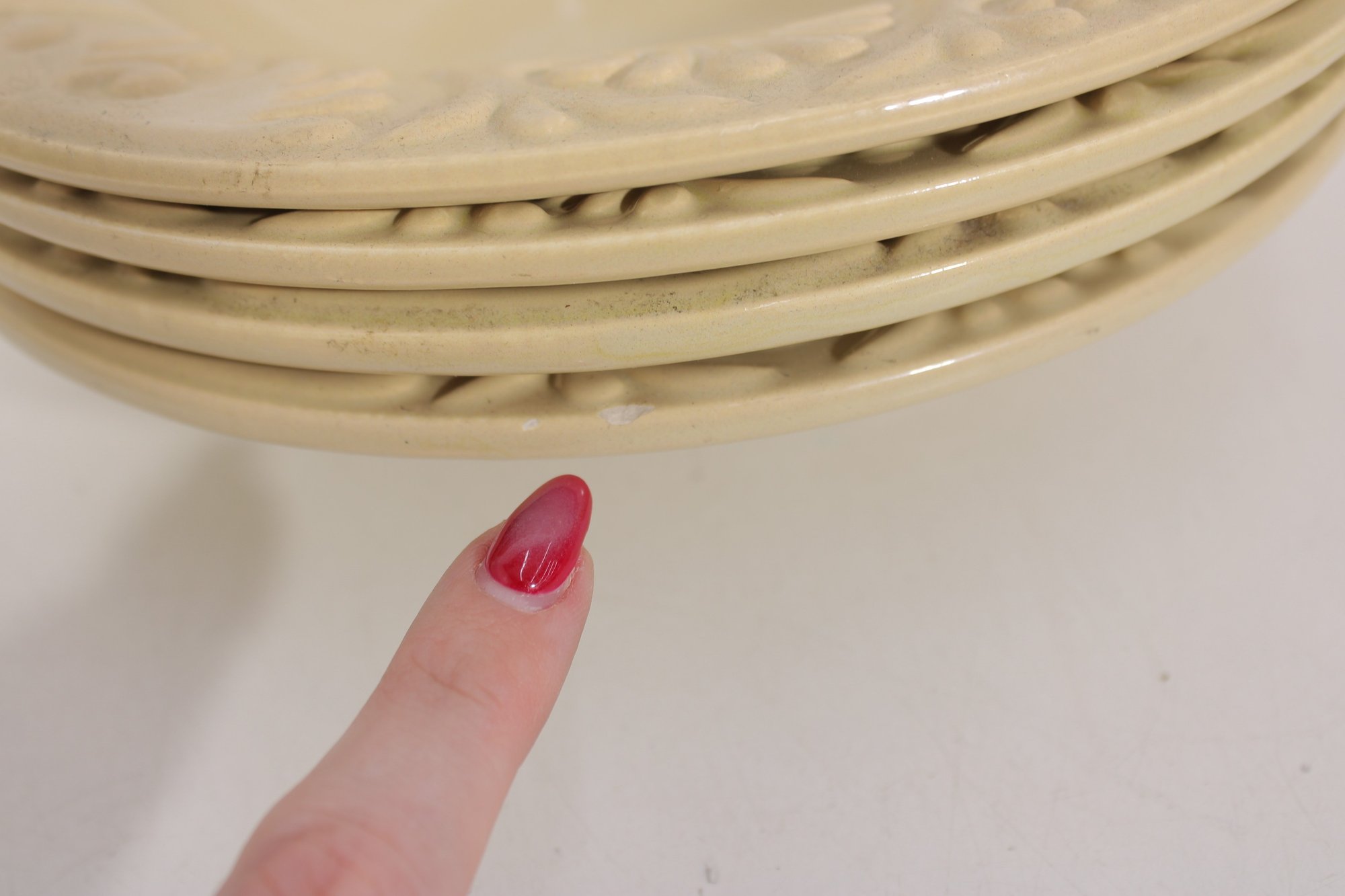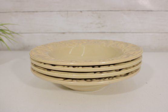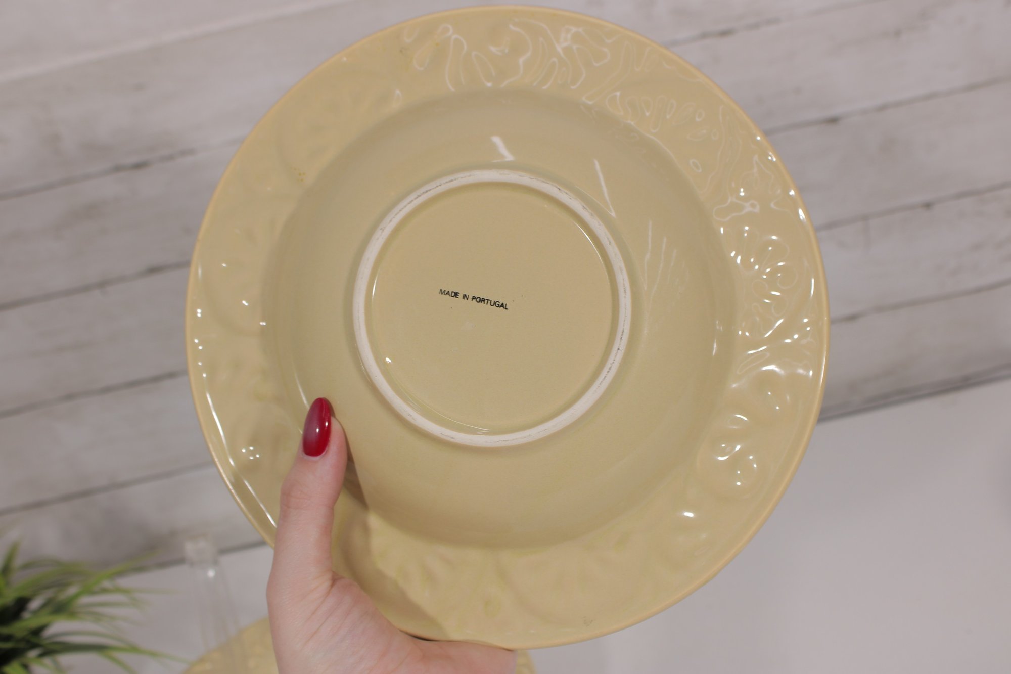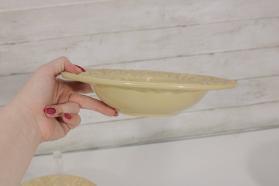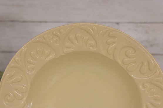 Beautiful vintage ceramic serving set featuring a warm cream glaze with an elegant embossed floral and scroll pattern. This charming set includes one large serving bowl and four matching plates, all crafted with a classic, timeless design that complements both traditional and farmhouse-style table settings.