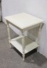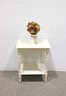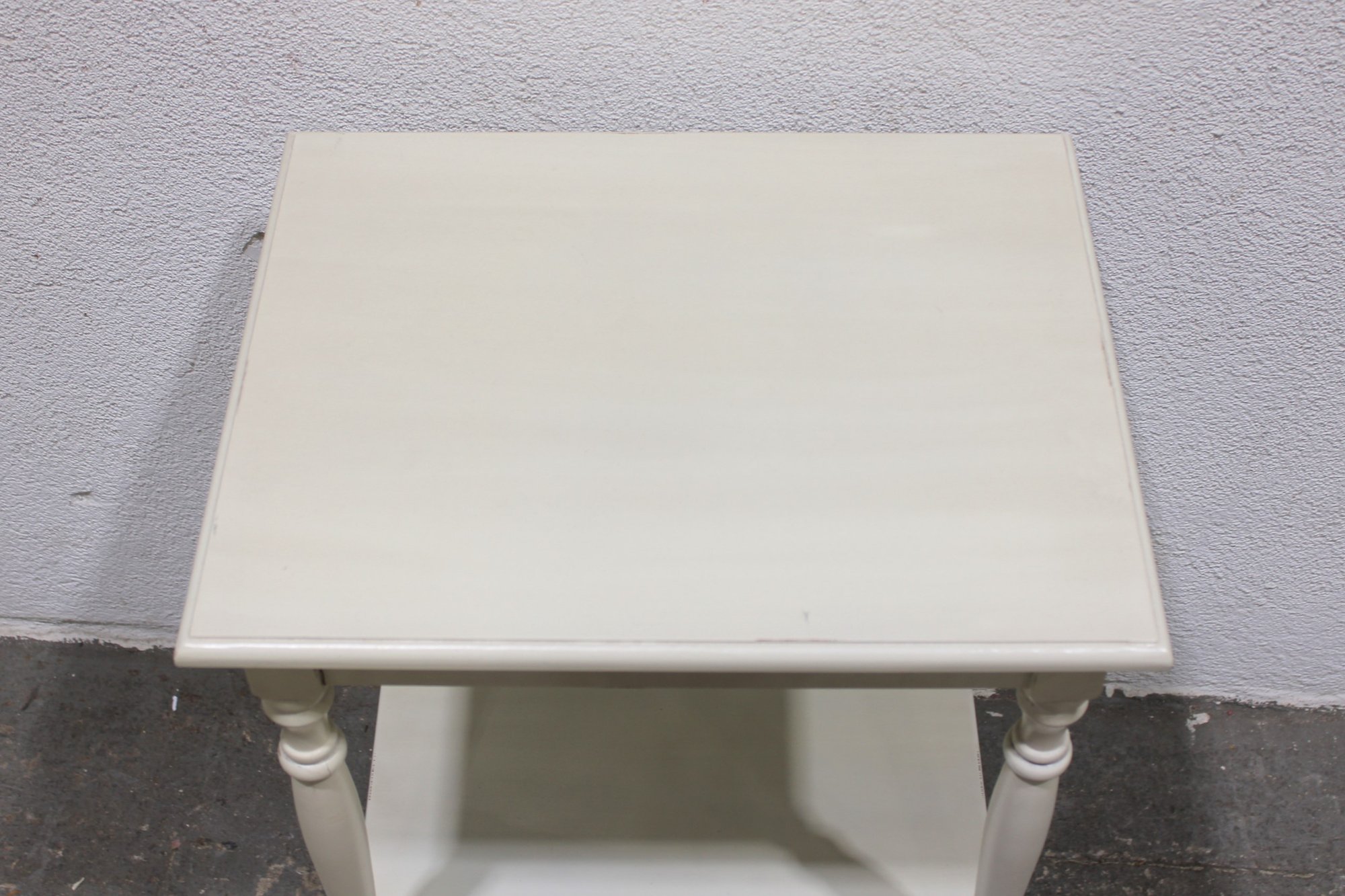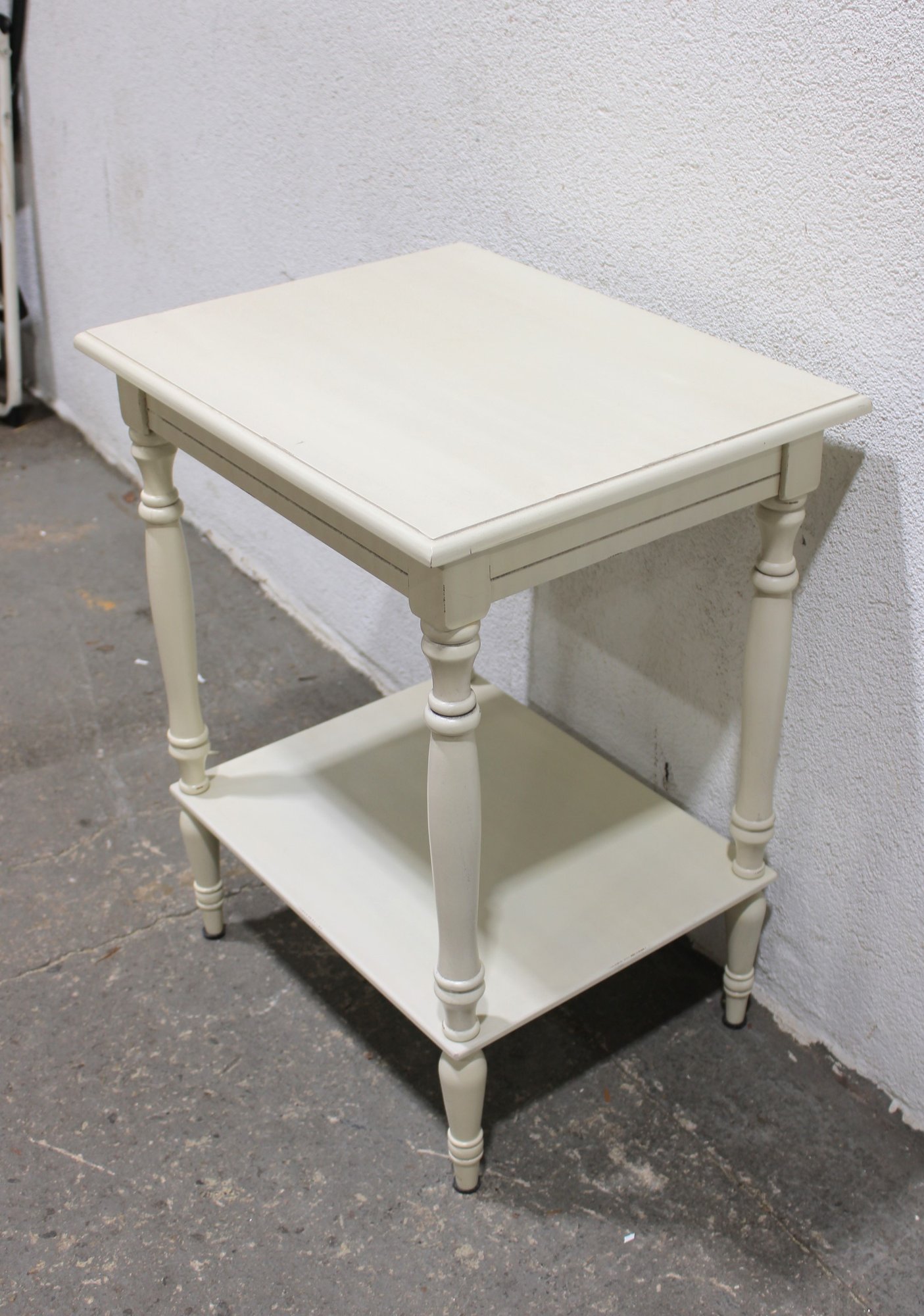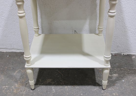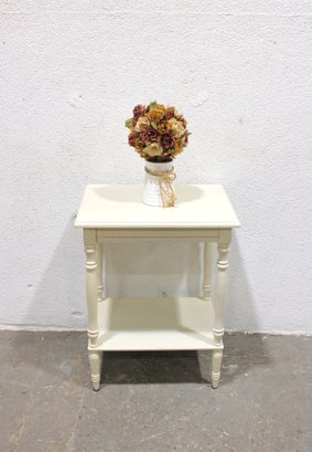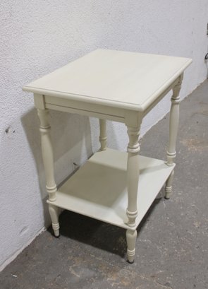 Charming vintage painted wood side table featuring a classic design with turned legs and a convenient lower shelf for additional storage or display. Finished in a soft cream/ivory paint, this versatile piece works well as a bedside table, accent table, or small end table in a living room, bedroom, or hallway.