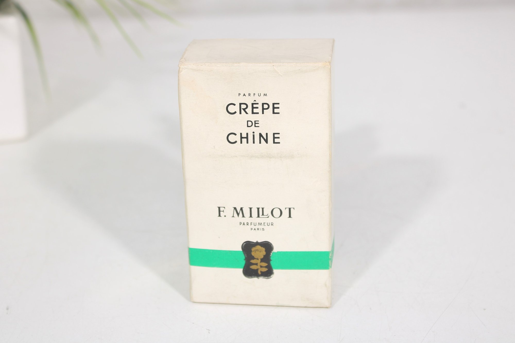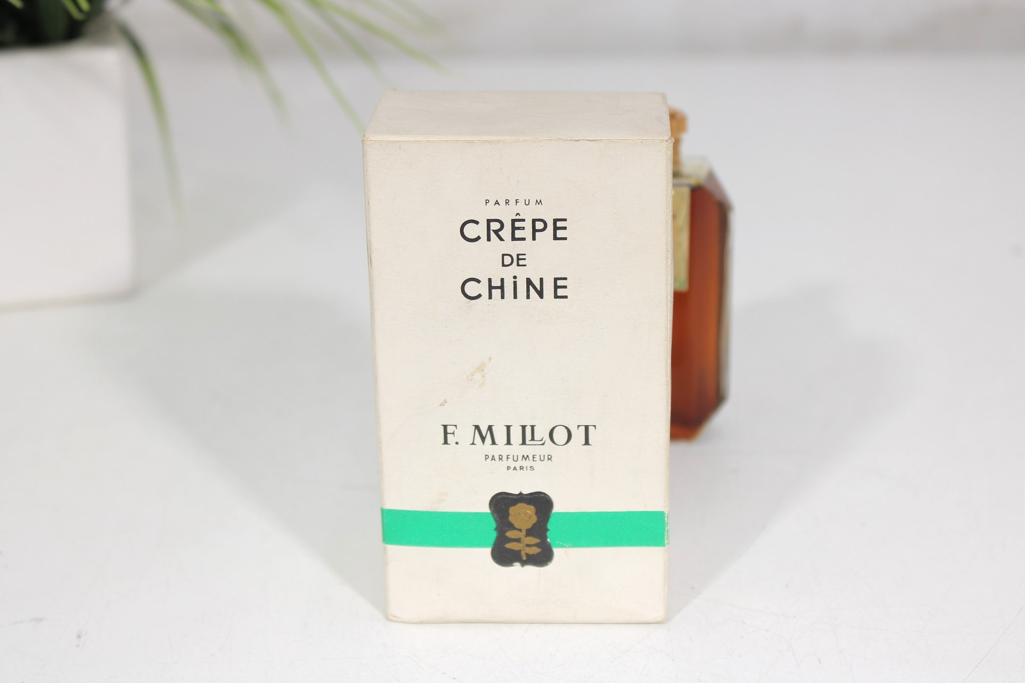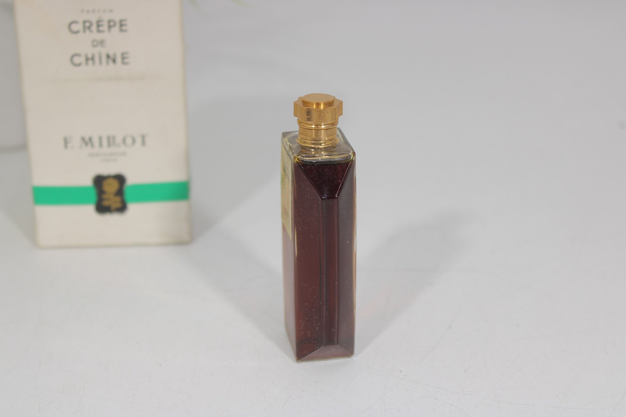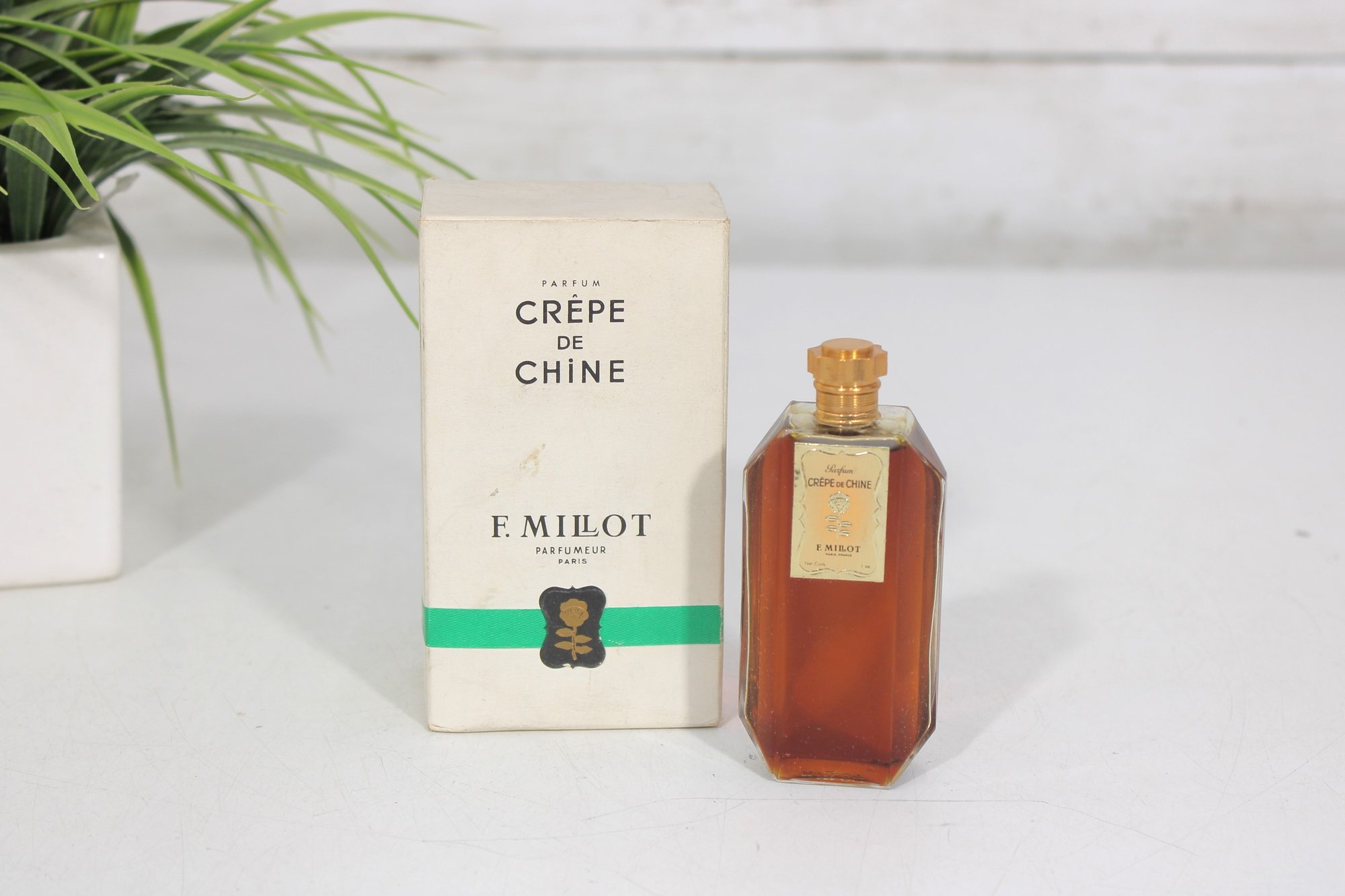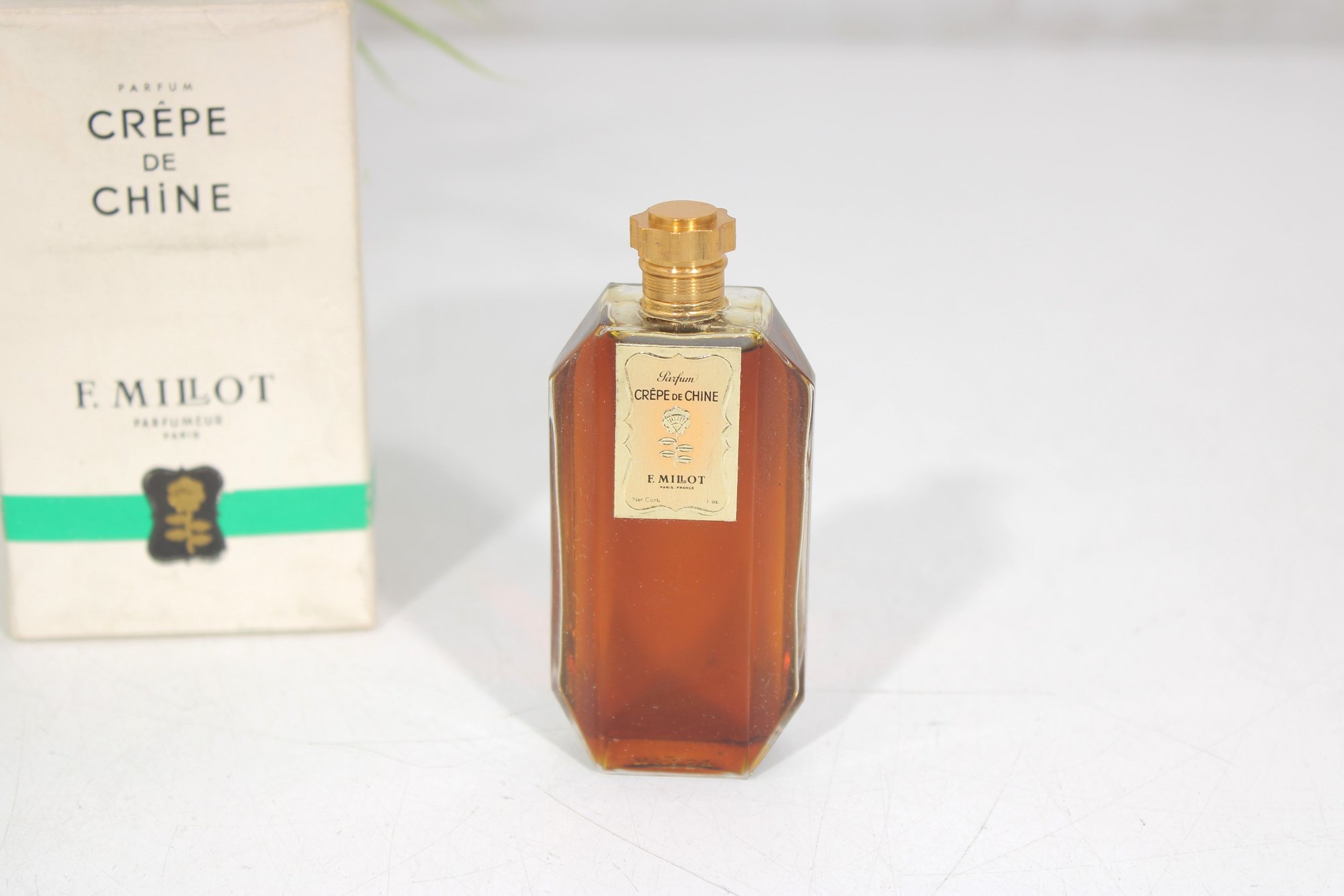 vintage Crêpe de Chine Parfum by F. Millot, originally introduced in 1925. This offering is the 1 oz miniature splash bottle, presented with its original box.