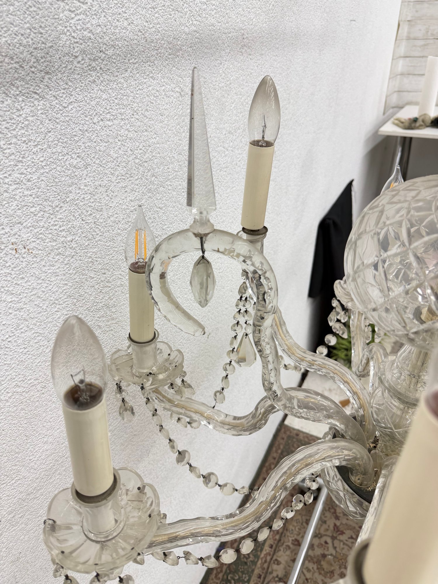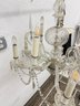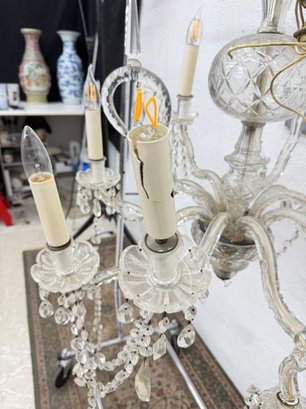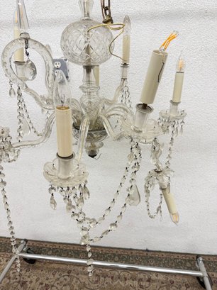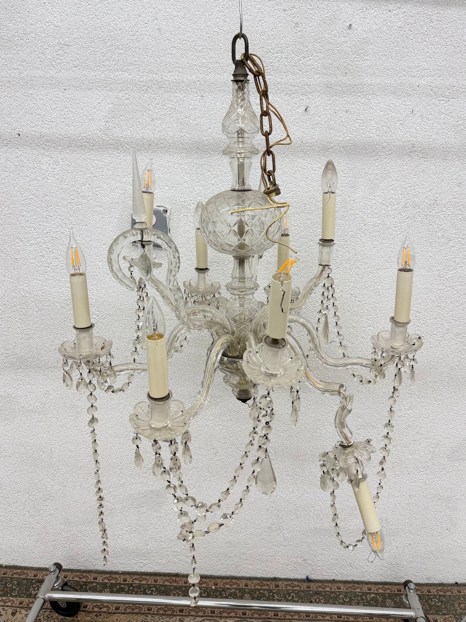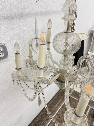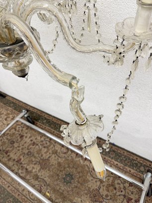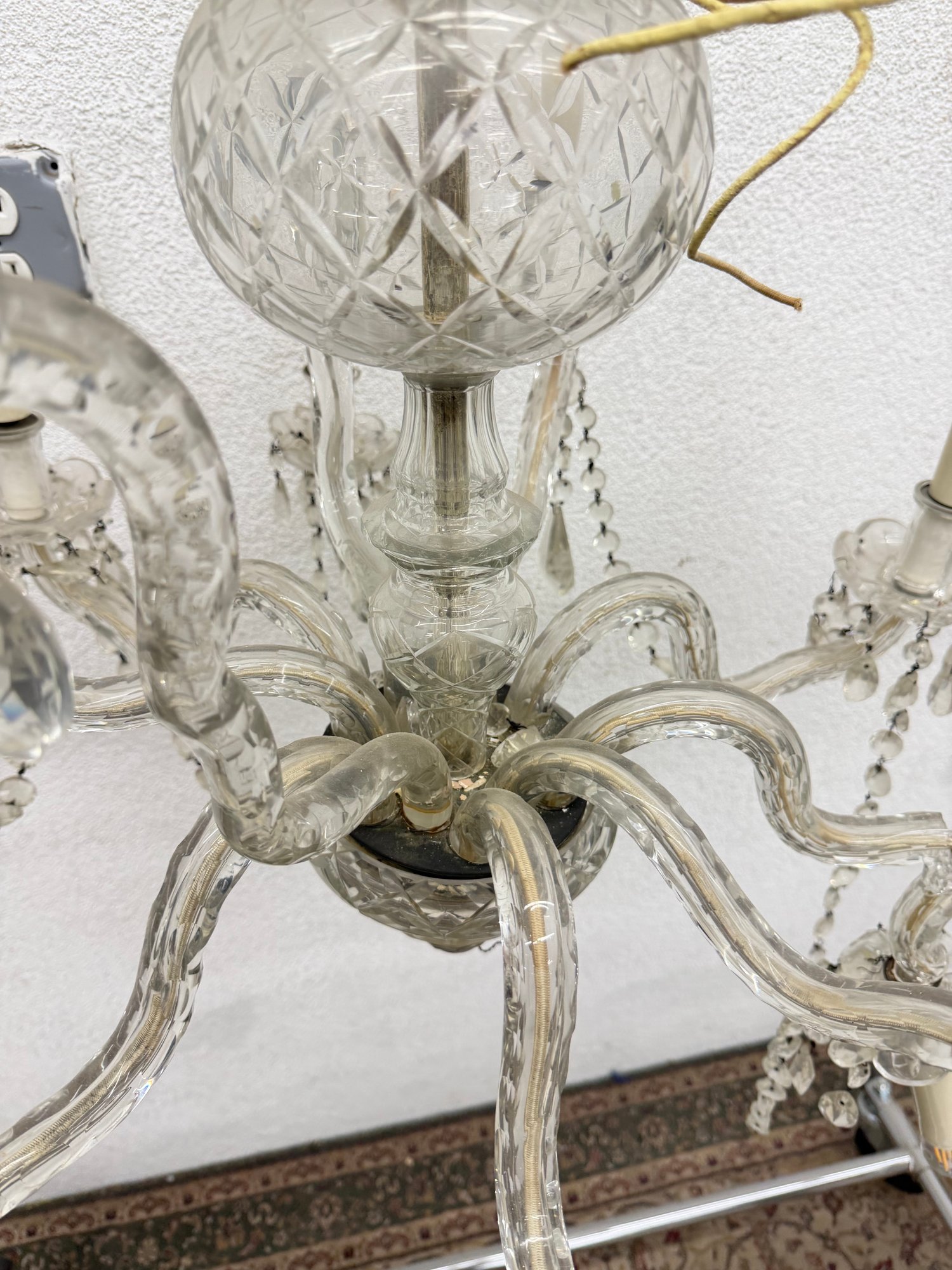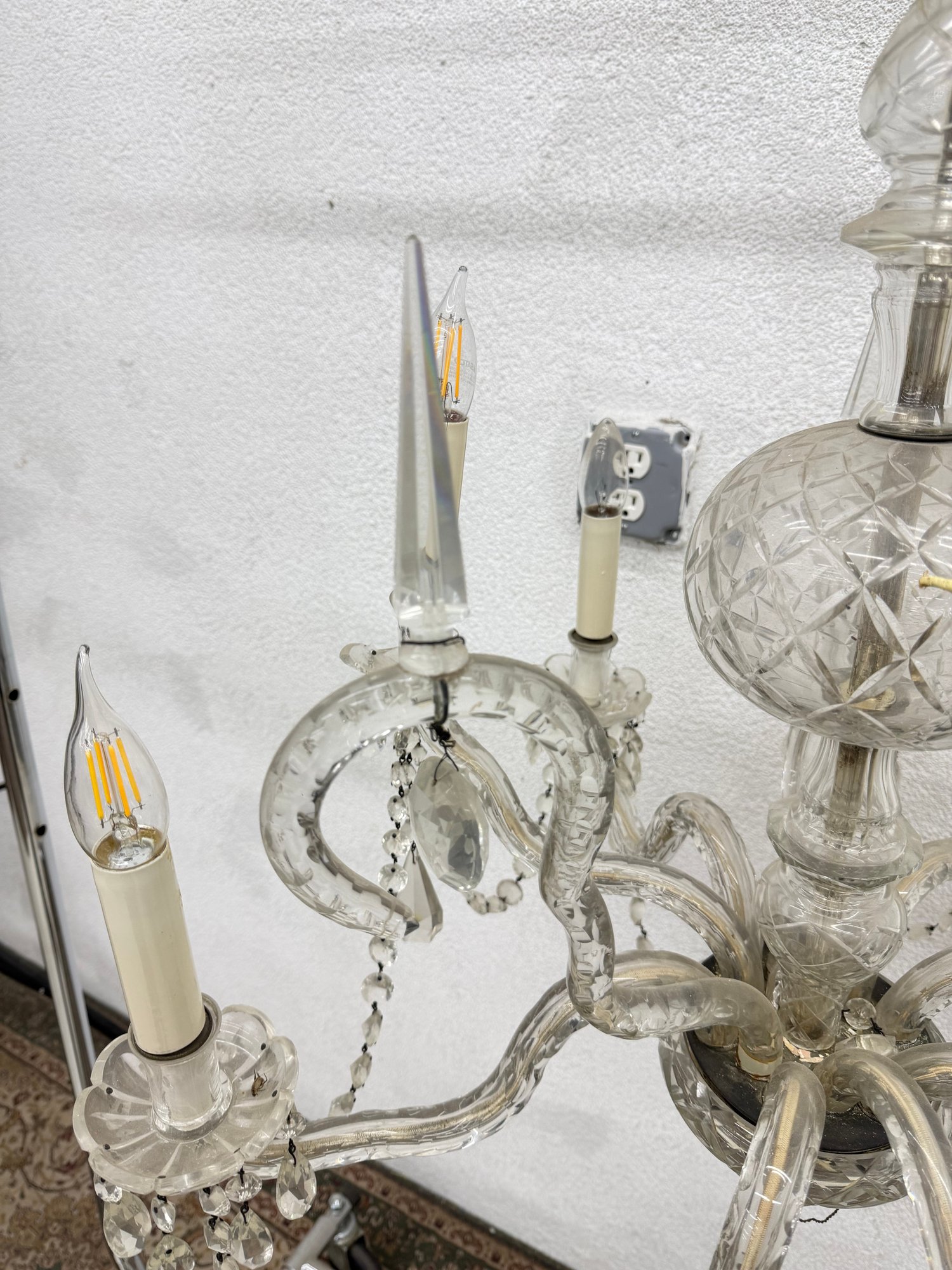 crystal and glass chandelier featuring a beautifully faceted central column, graceful curved glass arms, and hanging crystal prisms throughout. This classic chandelier offers timeless charm and dramatic presence, perfect for restoration, décor display, or repurposing.