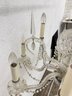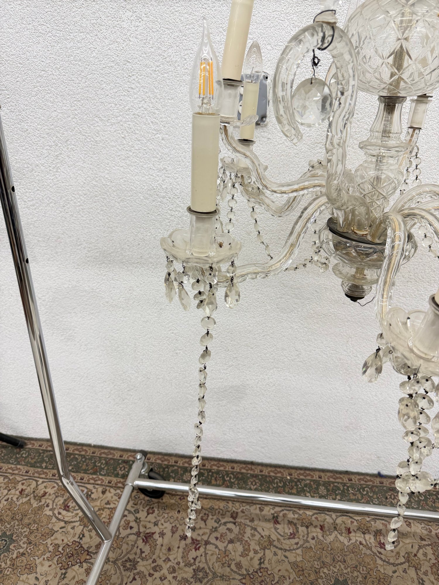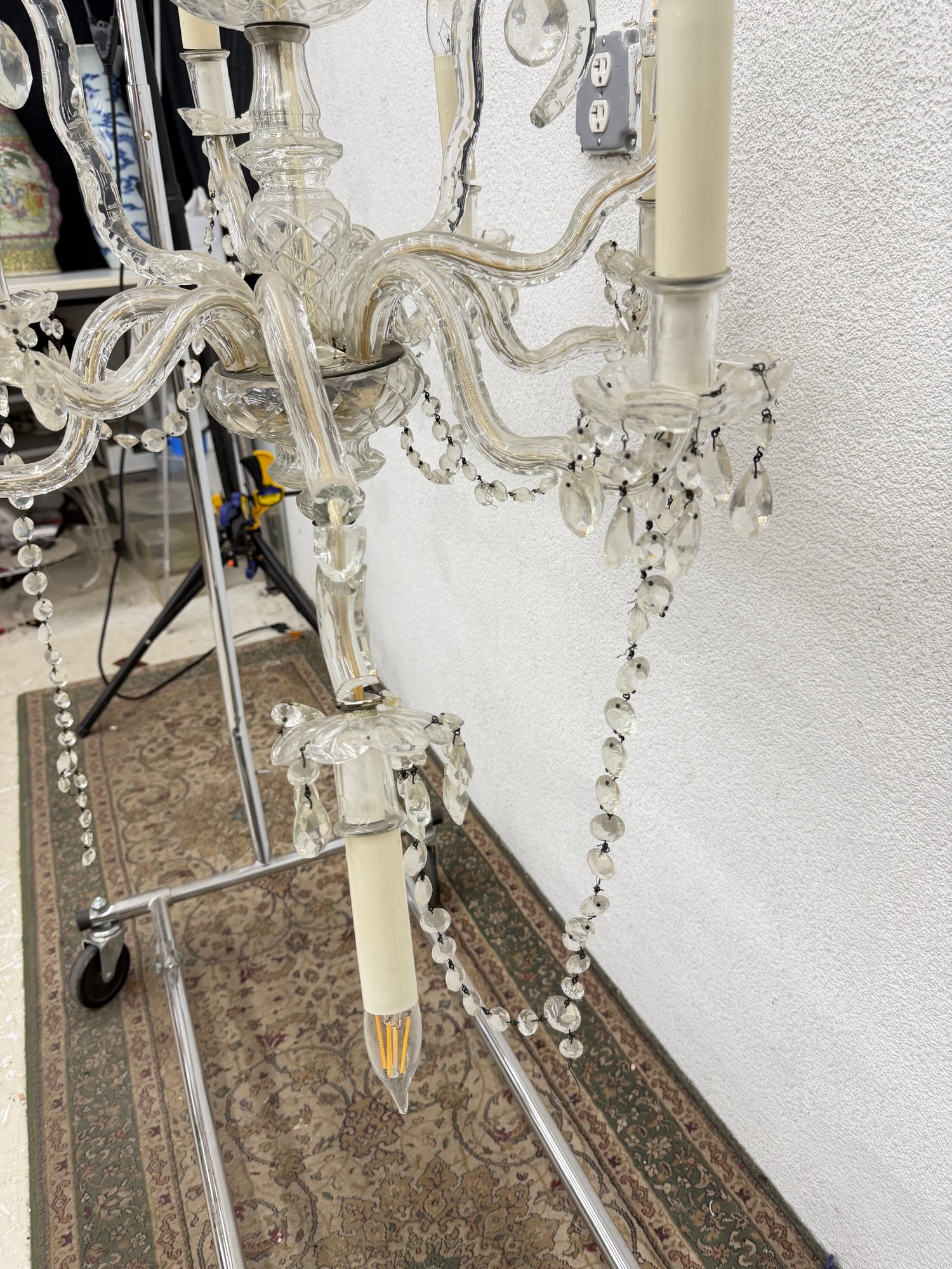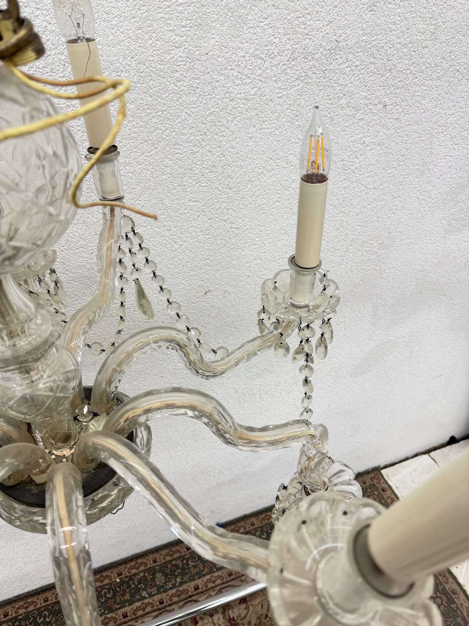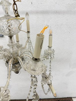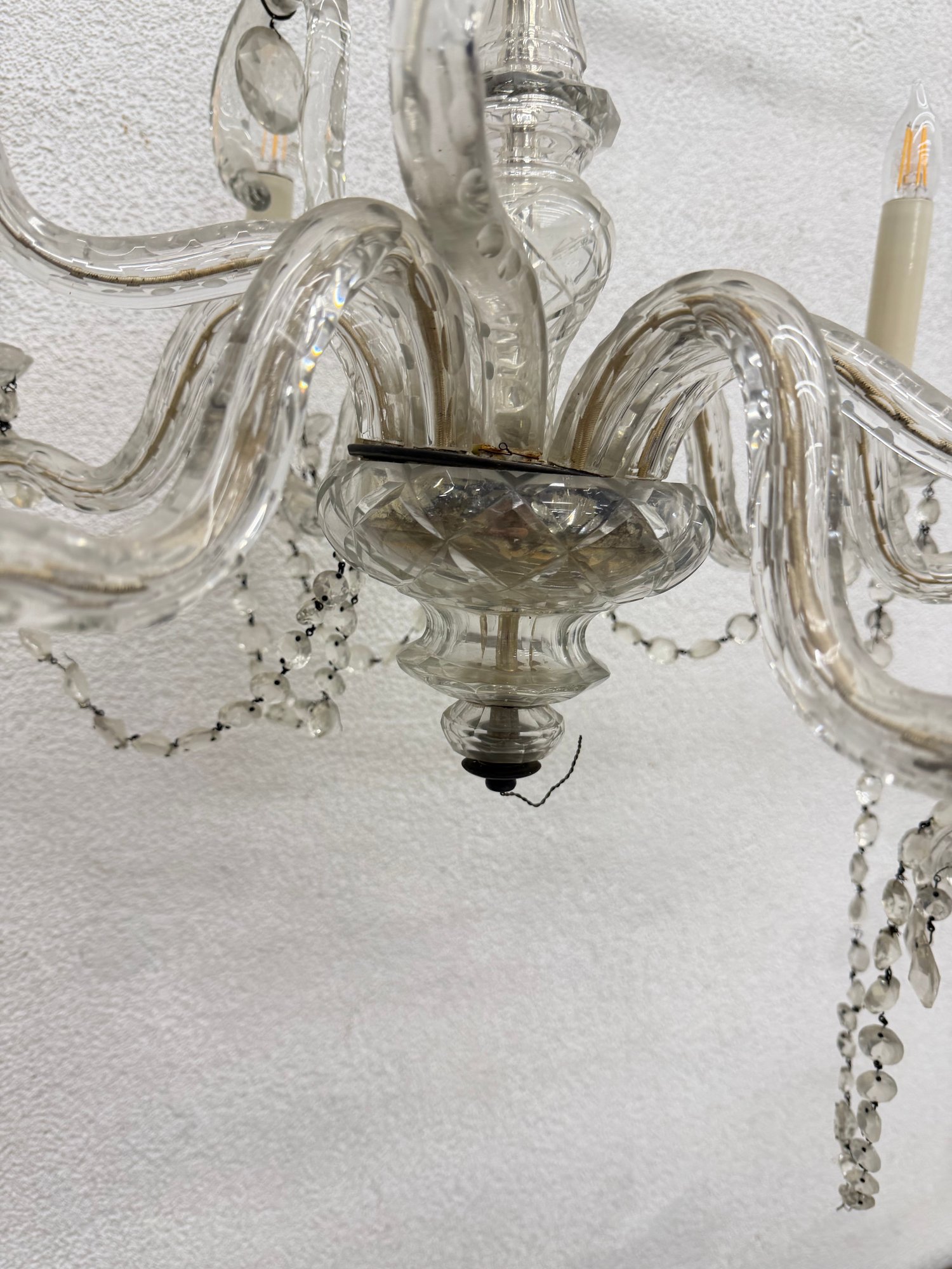 crystal and glass chandelier featuring a beautifully faceted central column, graceful curved glass arms, and hanging crystal prisms throughout. This classic chandelier offers timeless charm and dramatic presence, perfect for restoration, décor display, or repurposing.