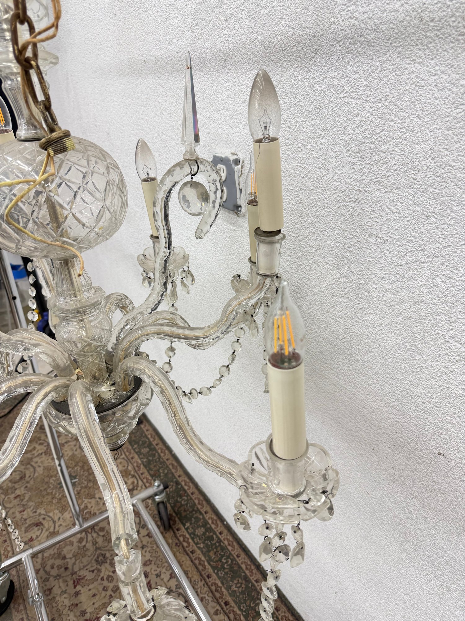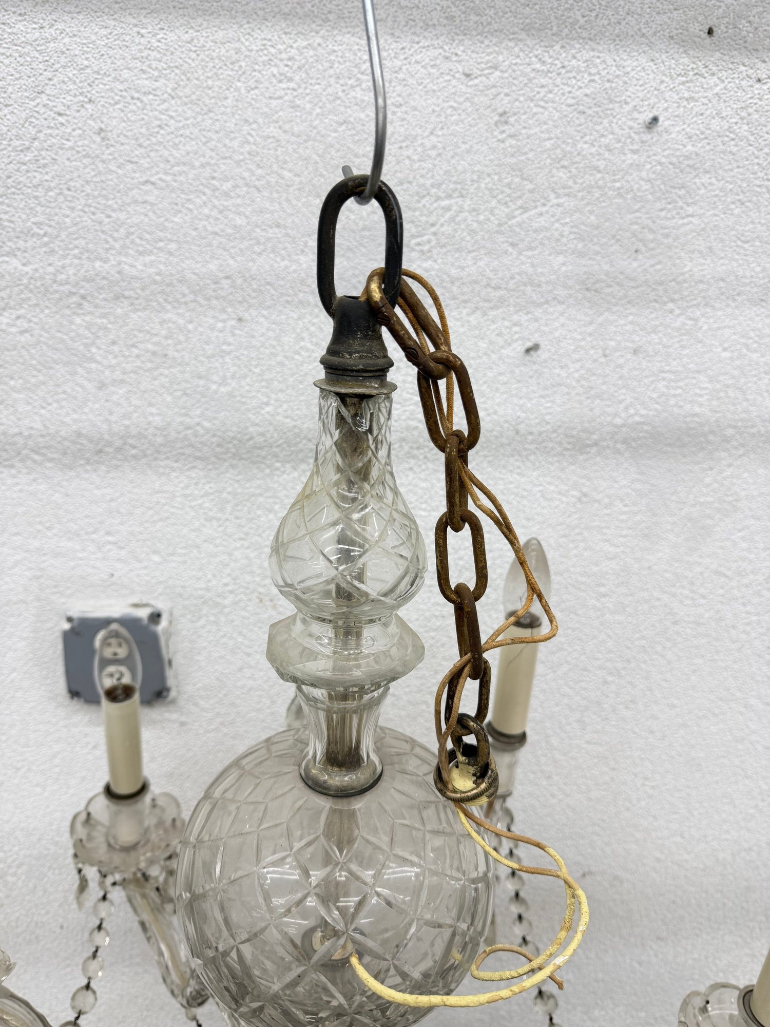 This chandelier is being sold AS IS. It shows age-related wear consistent with vintage pieces. Some prisms may be missing or detached, wiring condition is untested, and minor imperfections, chips, or repairs may be present.
