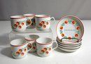 A charming set of vintage espresso cups and saucers featuring a colorful floral design from Csongrád, Hungary. The set includes 6 espresso cups and 6 matching saucers, each adorned with a pixelated floral motif in shades of red, yellow, and green, along with a delicate red trim. The saucers proudly display the name "Csongrád" at the center. Made from fine porcelain, this set would make a delightful addition to any kitchen or porcelain collection. The undersides of each piece are marked with a traditional Hungarian manufacturer stamp.