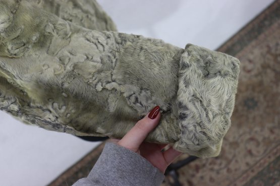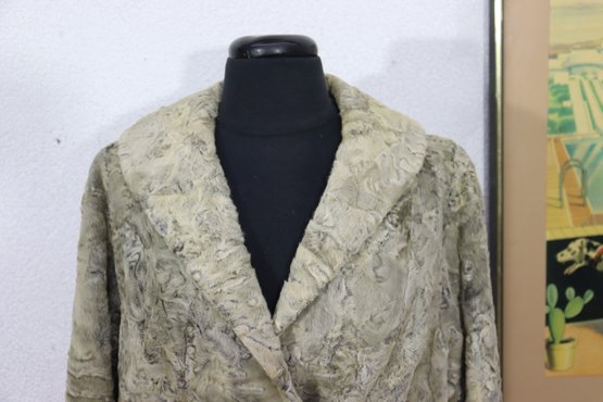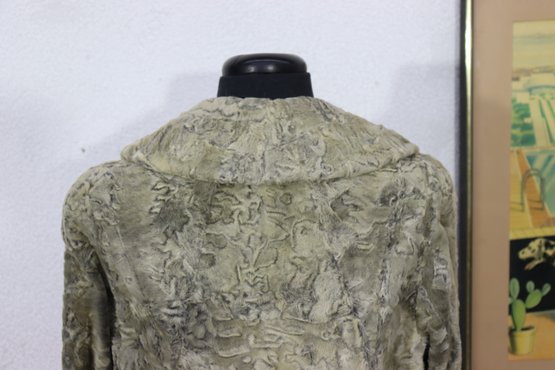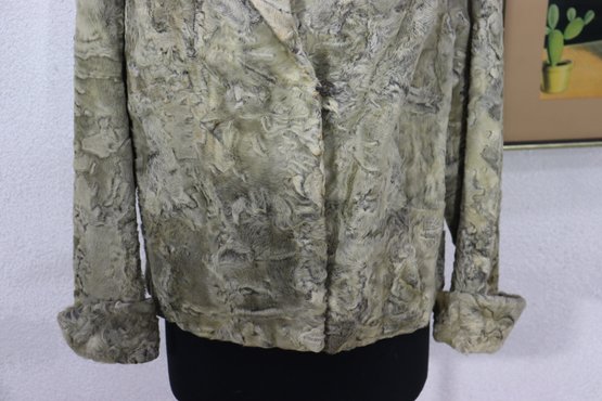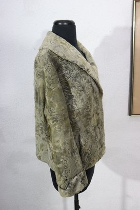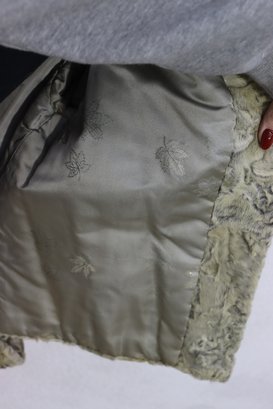 Beautiful vintage curly lamb style fur jacket in a light gray / taupe tone with a gorgeous textured pattern throughout. Classic mid-century look, soft fur feel, cuffed sleeves, and wide notched collar. Perfect piece for vintage fashion, retro winter looks, styling, wardrobe, theater, or photo shoots.