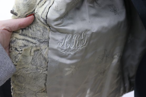 Interior satin liner is monogrammed “MRS” and has floral/leaf stitched pattern throughout.