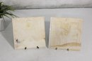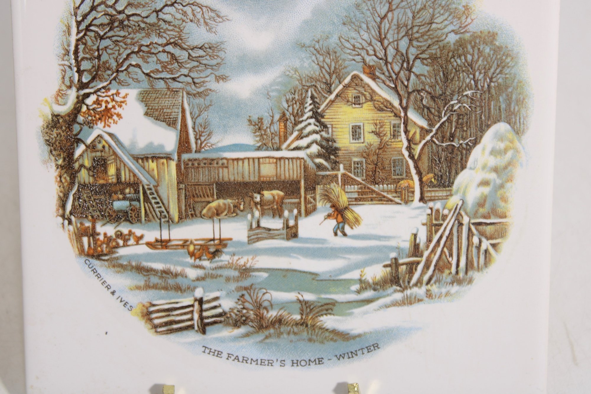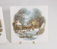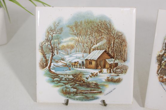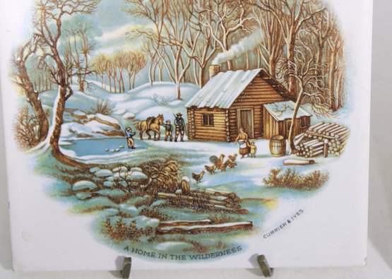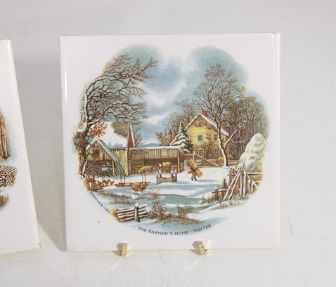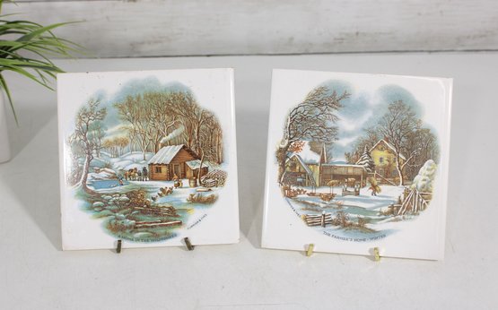 Charming set of two vintage Currier & Ives ceramic tile trivets featuring the classic “The Homestead in Winter” scene. Each tile showcases a beautifully detailed winter countryside illustration with rustic homes, snow-covered landscapes, and serene pastoral charm.