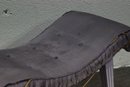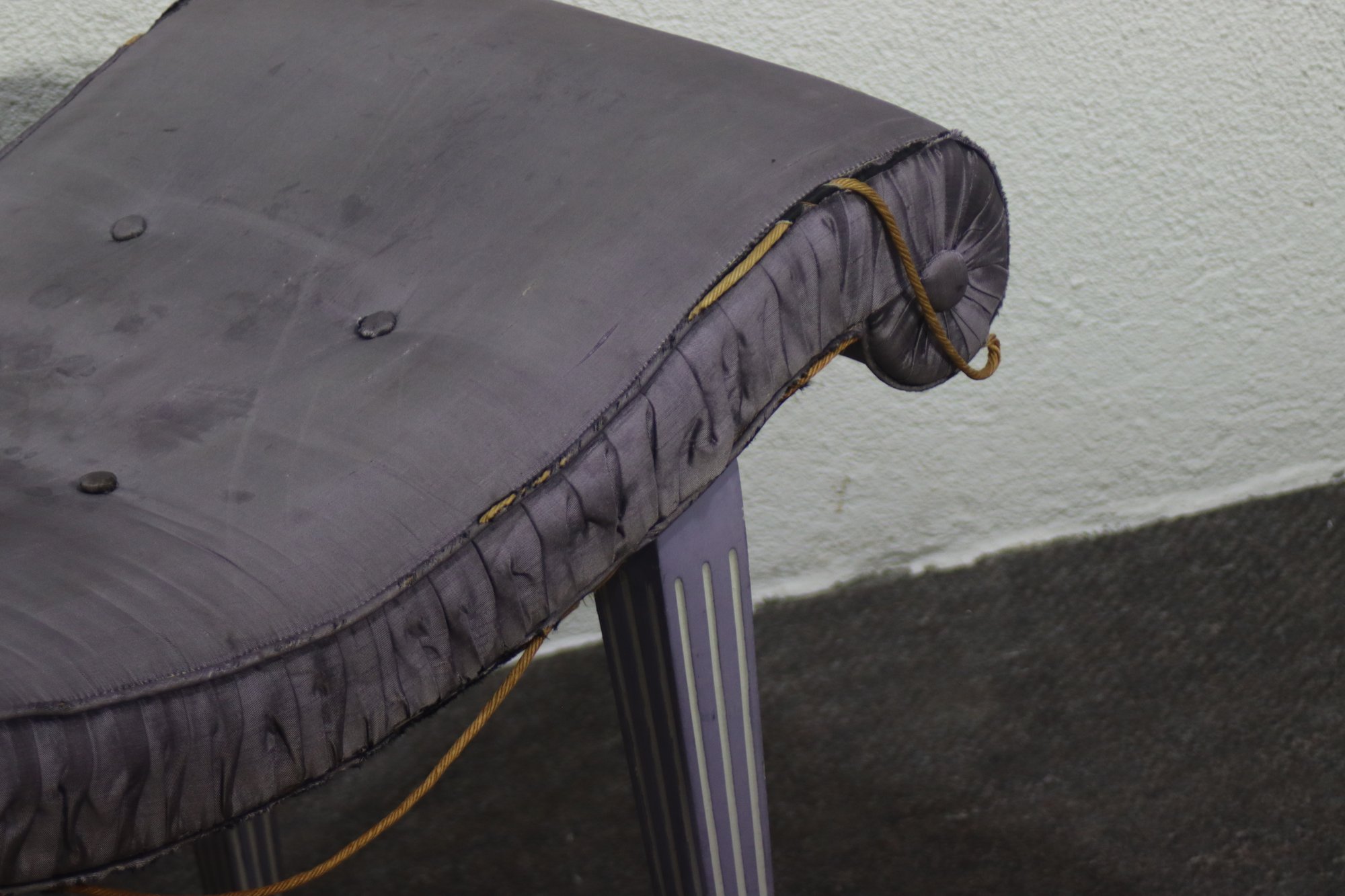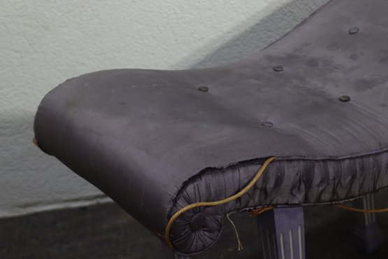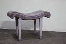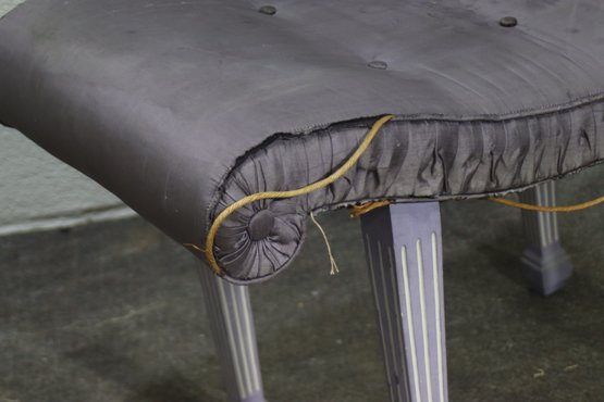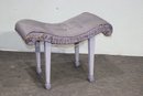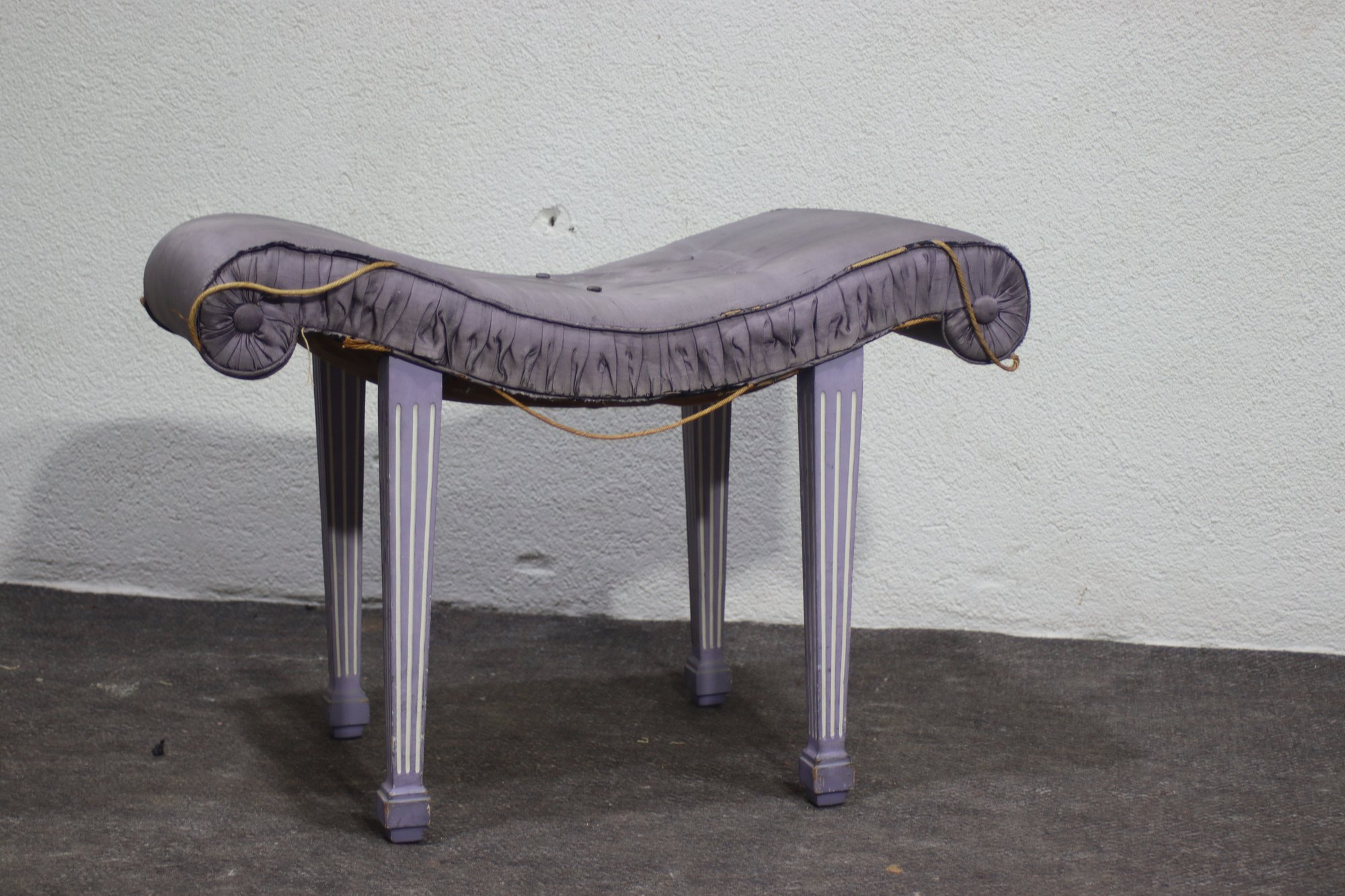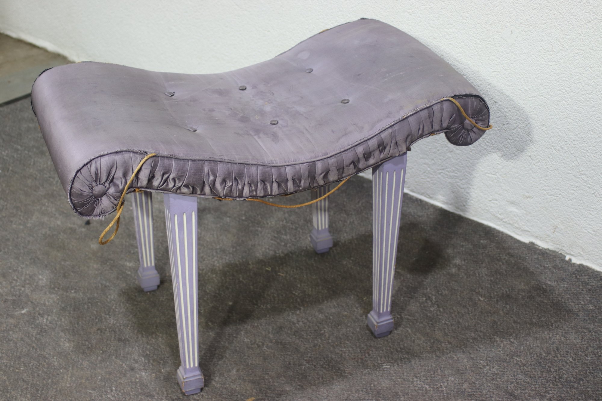 vintage vanity bench features a graceful curved seat and fluted legs, embodying a timeless classic style. The ornate scroll details and decorative trim add a touch of sophistication, making it a great restoration project for someone looking to bring new life to a well-crafted piece.