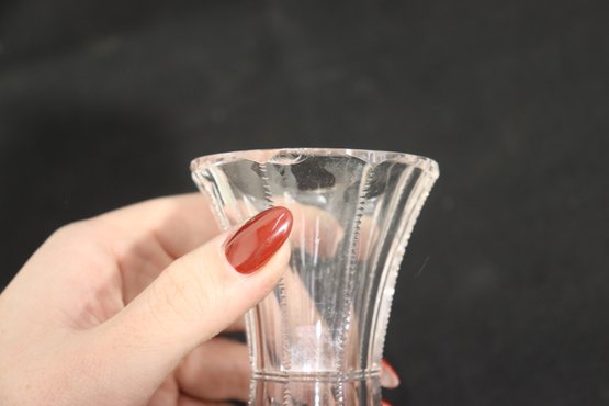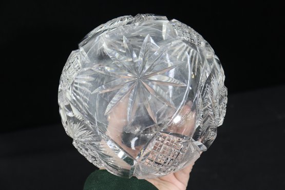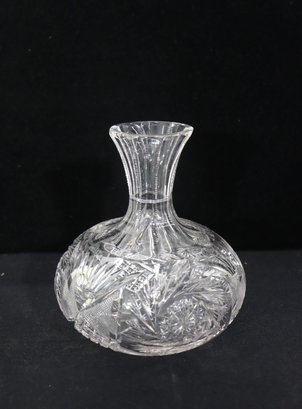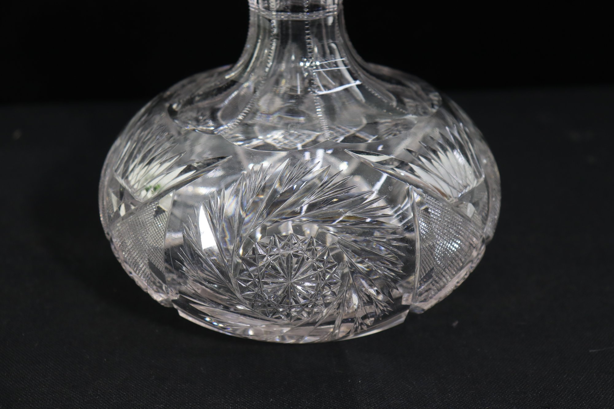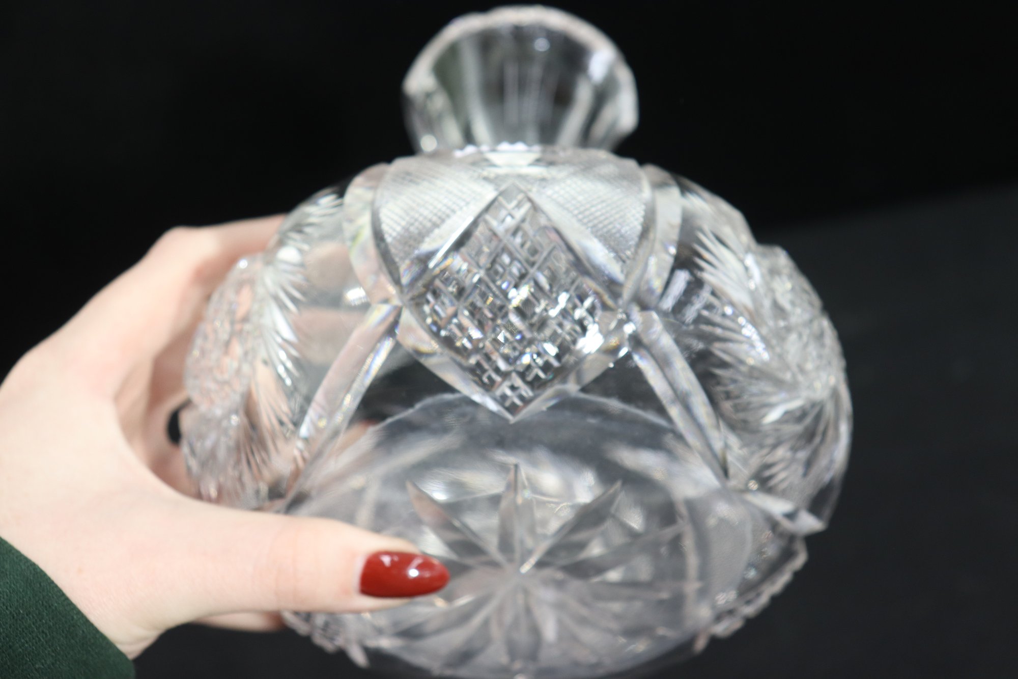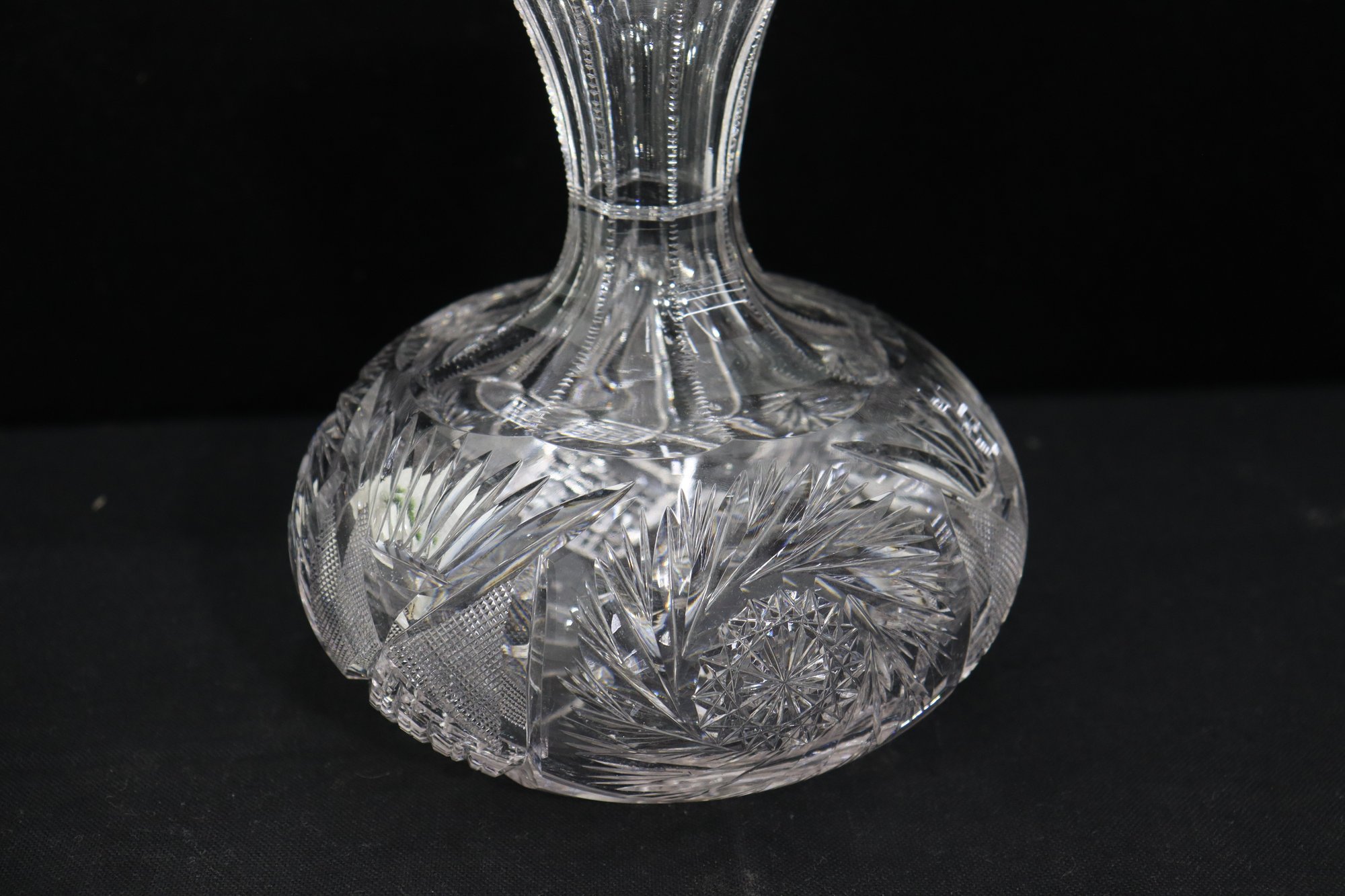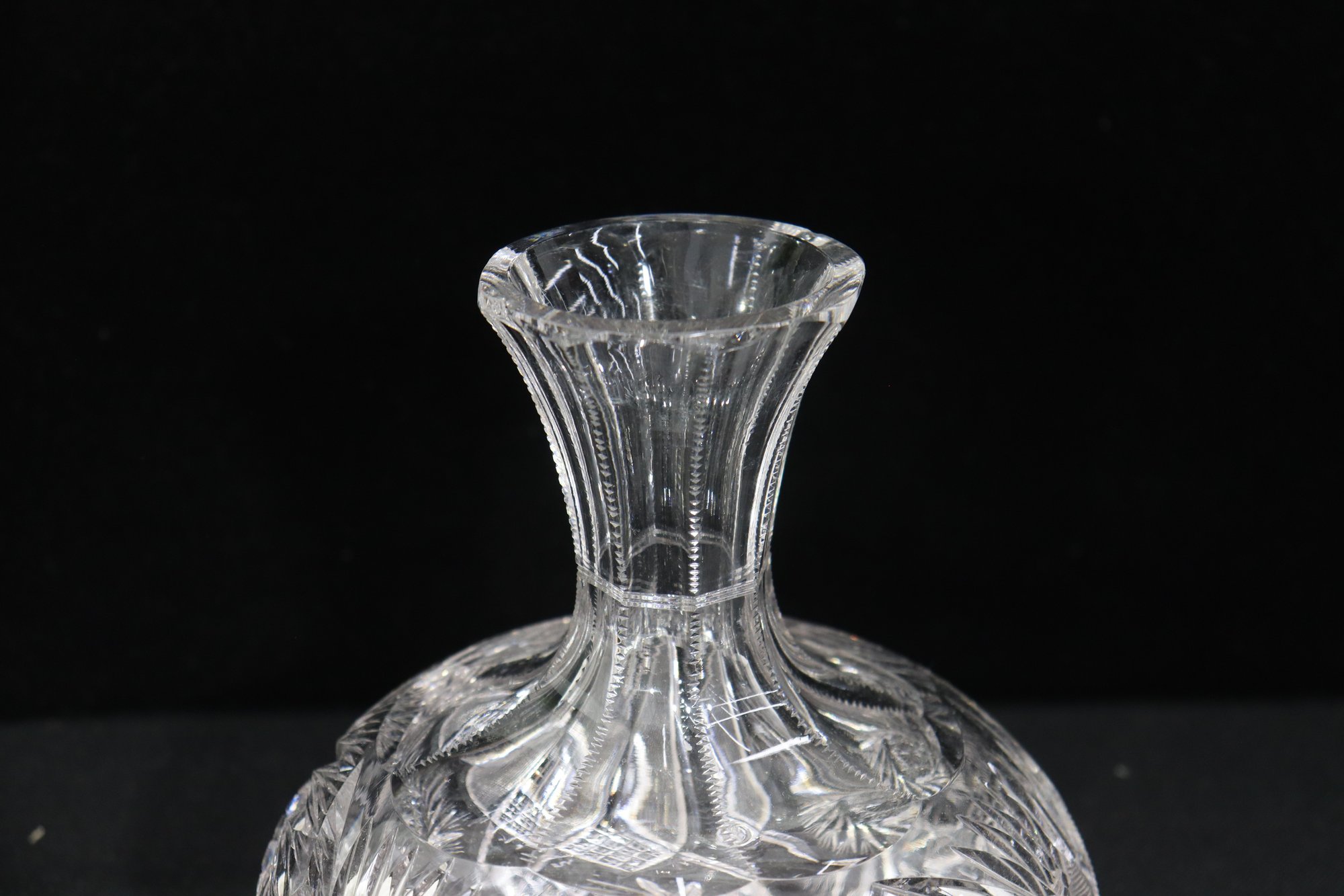 a beautiful vintage cut crystal decanter, featuring classic starburst and fan-cut patterns that catch and reflect the light beautifully. The rounded body and flared neck give this piece an elegant, timeless silhouette, making it suitable for use as a decanter or decorative vase.