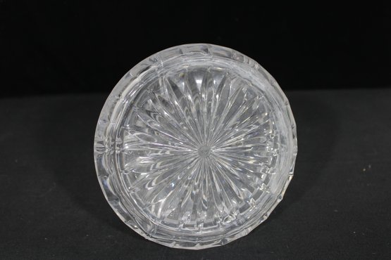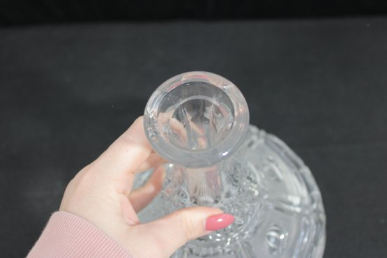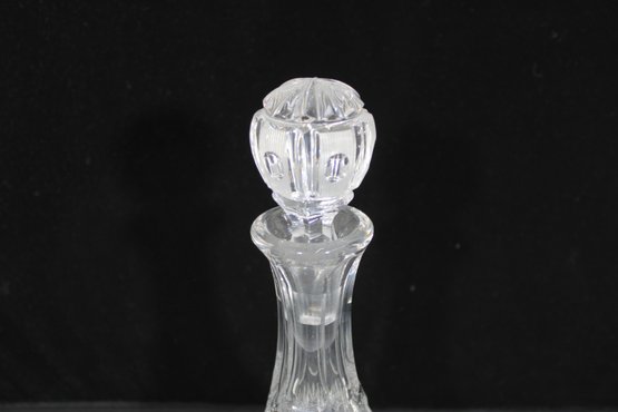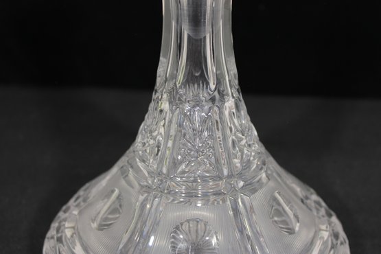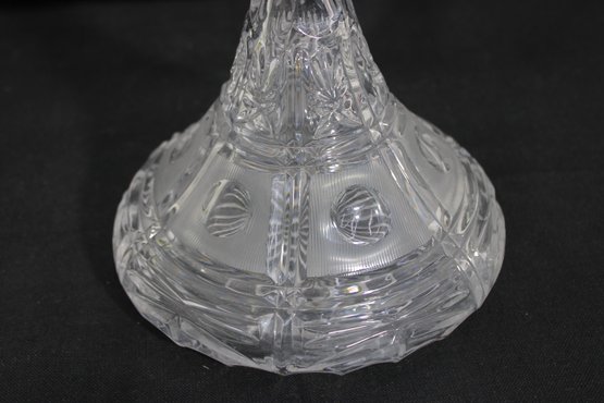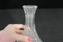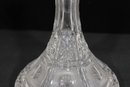 vintage cut crystal decanter featuring a beautifully faceted design and classic silhouette. The piece showcases intricate cut patterns throughout the body, with a flared base and a tall, tapered neck topped by a matching faceted stopper.