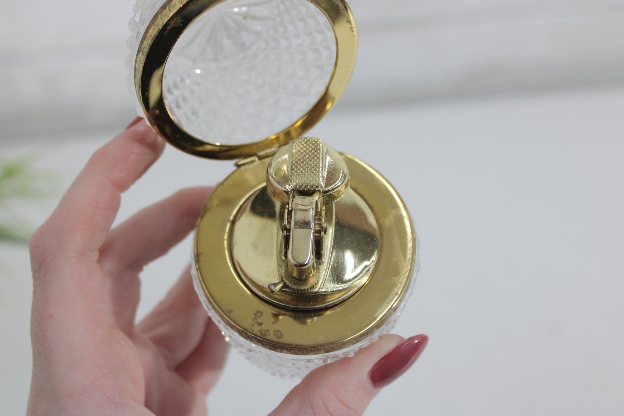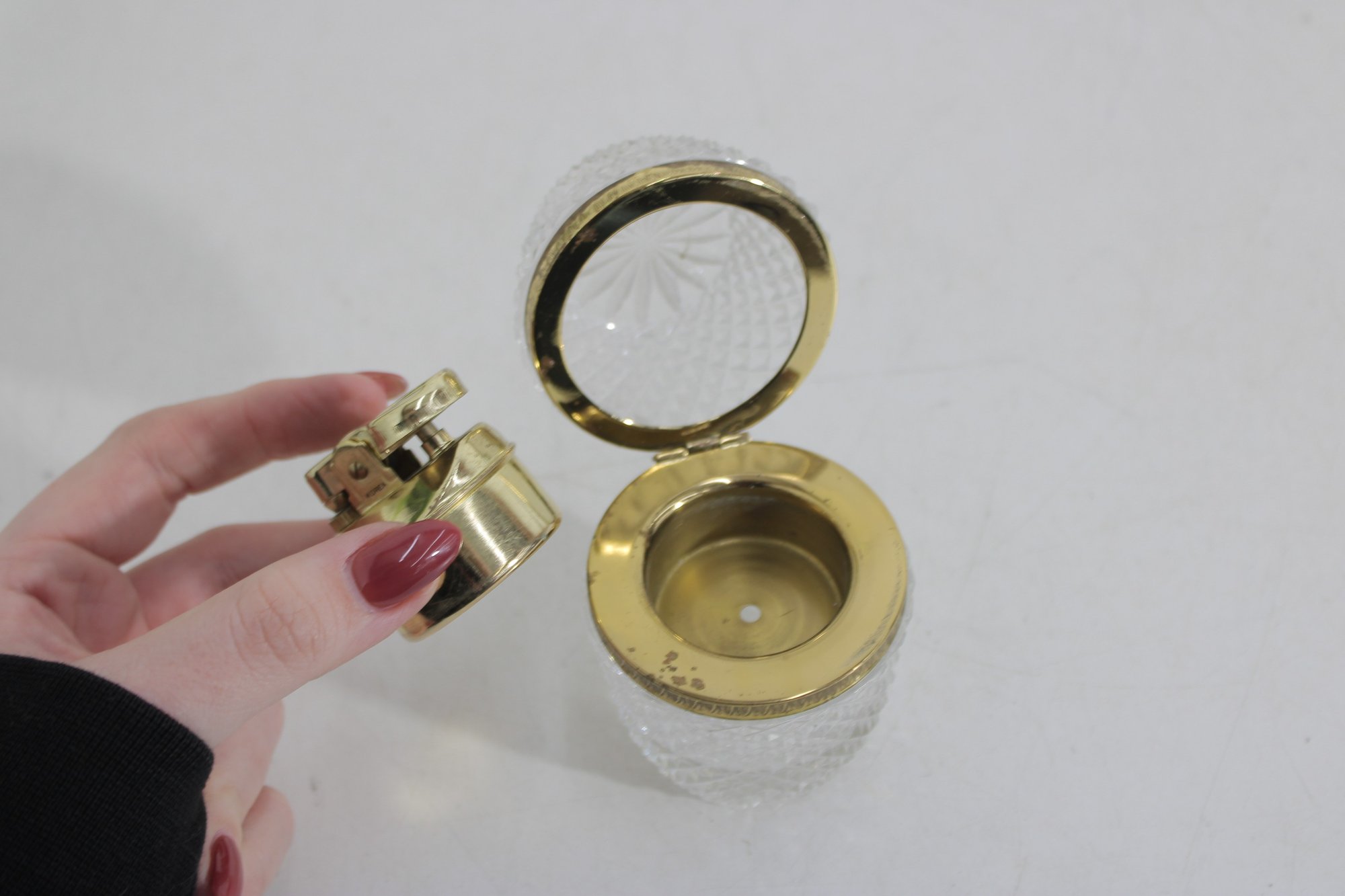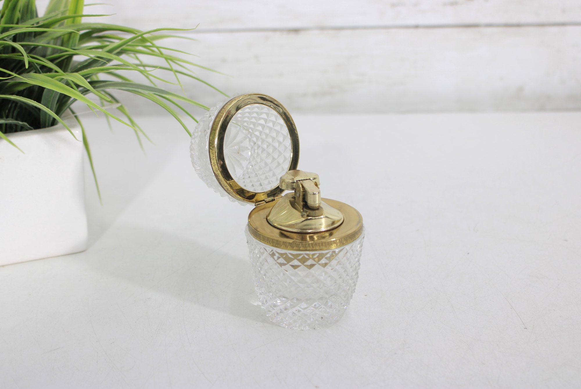 The clear glass body displays a classic cut diamond design that reflects light beautifully. The hinged flip-top lid opens to reveal the lighter mechanism and fuel reservoir inside. The brass tone hardware provides a striking contrast to the crystal and adds a sophisticated mid-century aesthetic.
