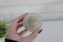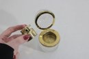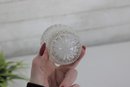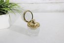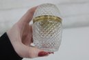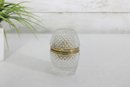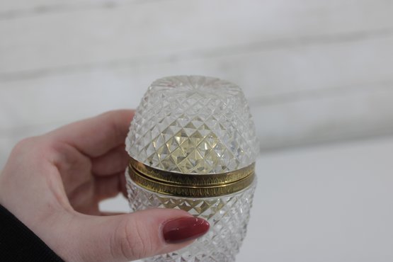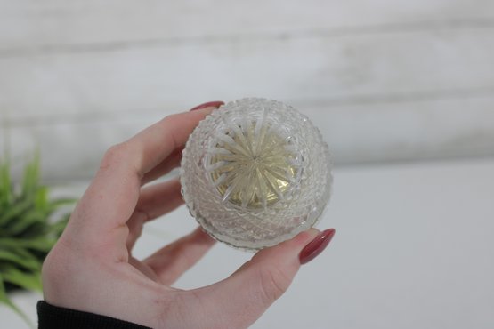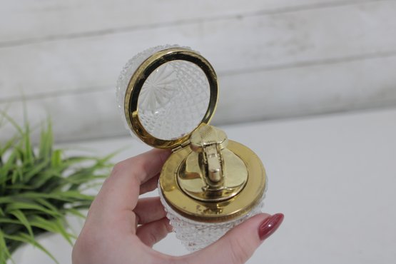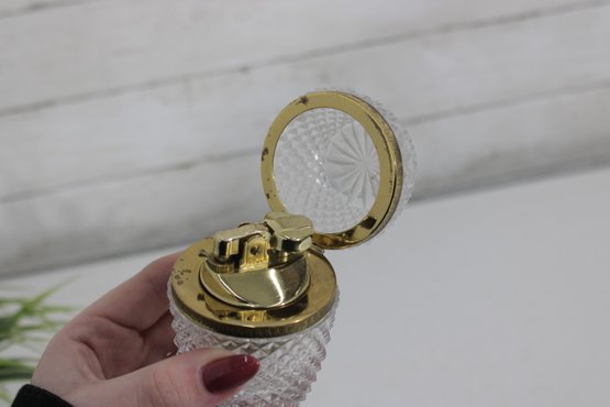 vintage cut crystal table lighter featuring a beautiful diamond-pattern glass body and brass tone metal mount. This elegant piece measures approximately 3.5 inches tall and has a substantial, quality feel.