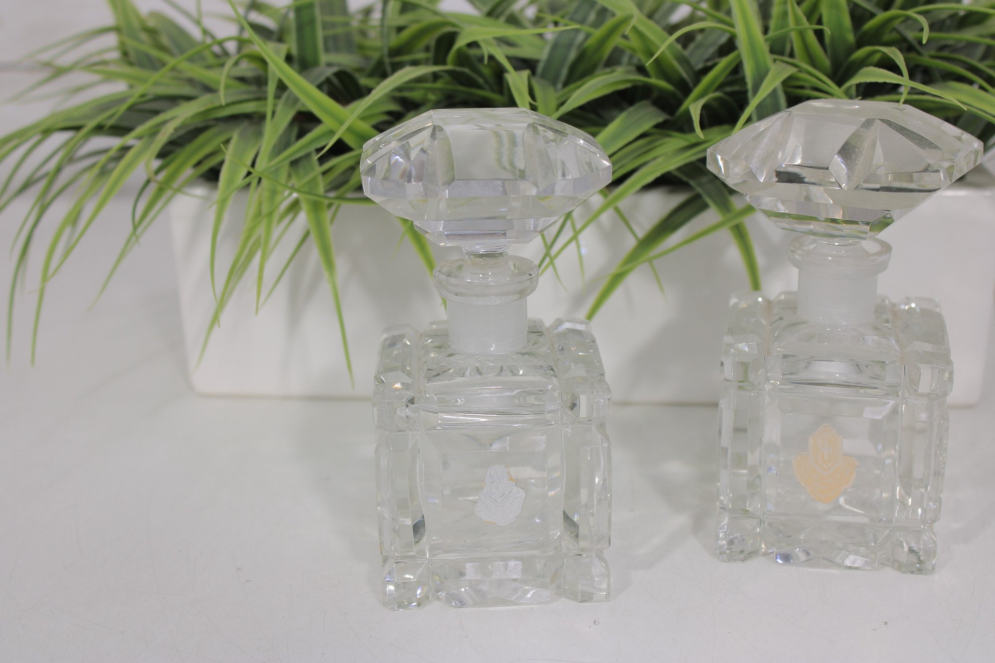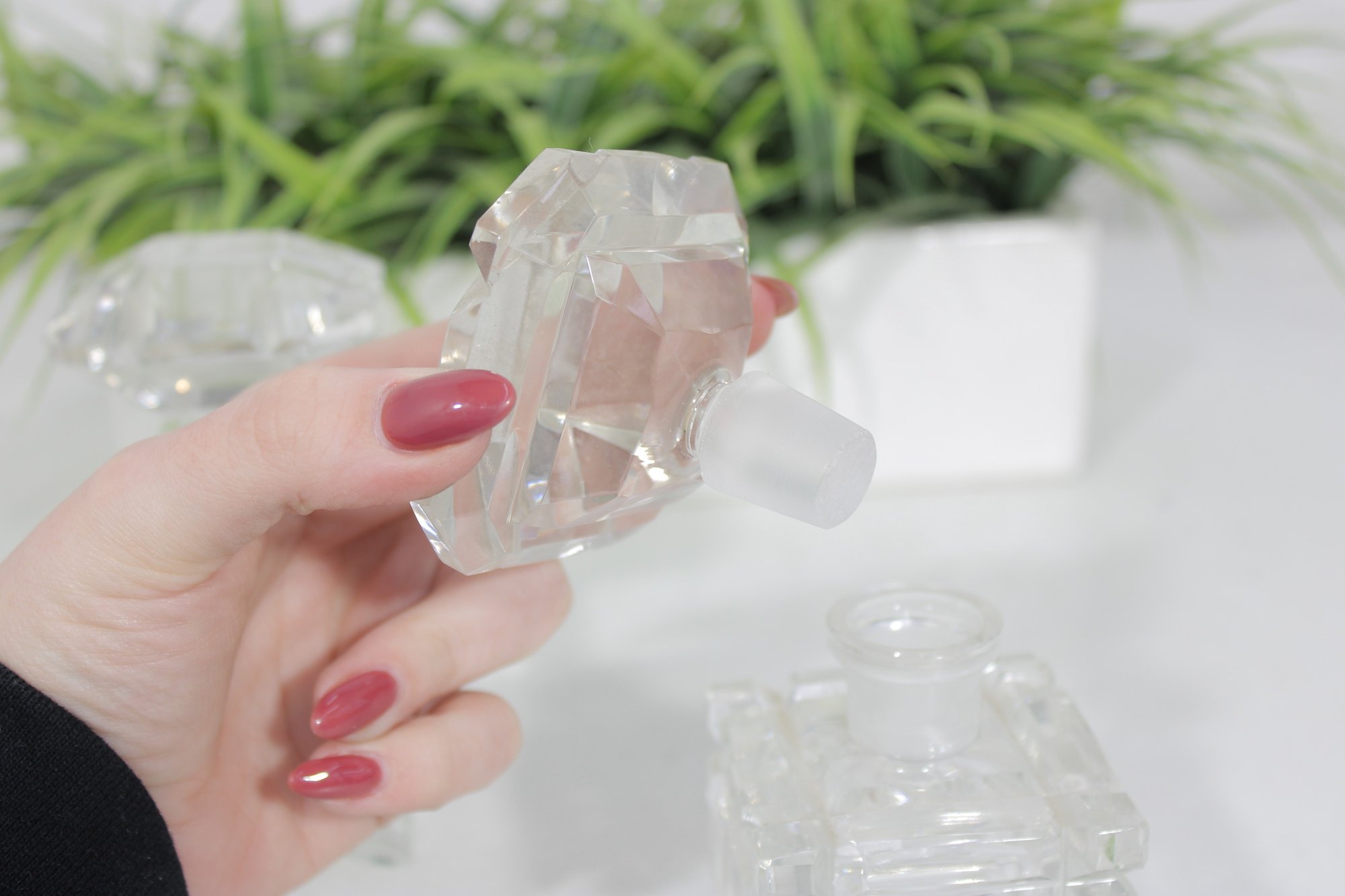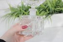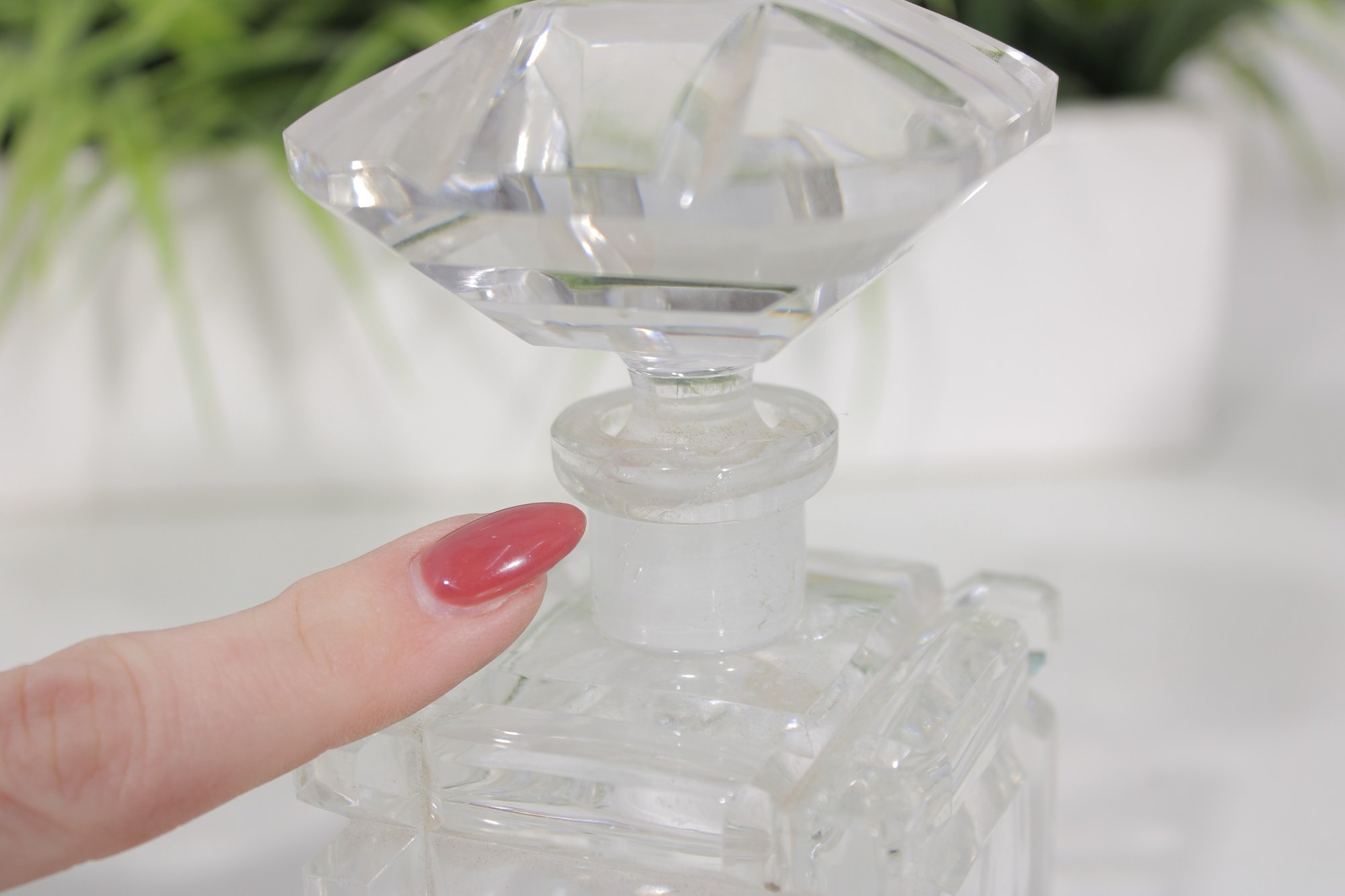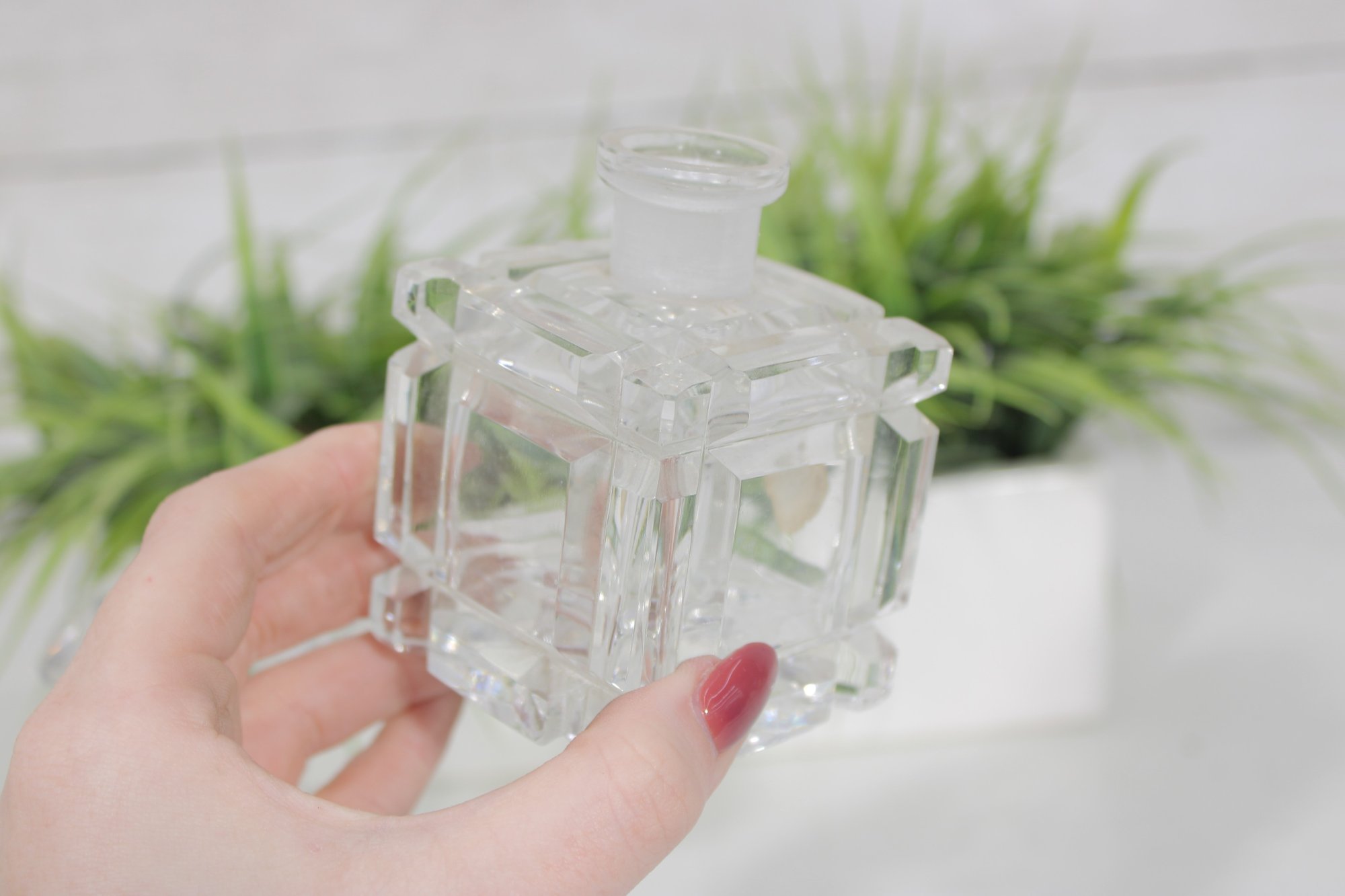 This elegant square bottle features heavy, faceted crystal glass with deeply cut geometric detailing throughout. The matching faceted stopper fits securely into the neck and complements the bold, architectural design.
