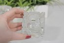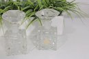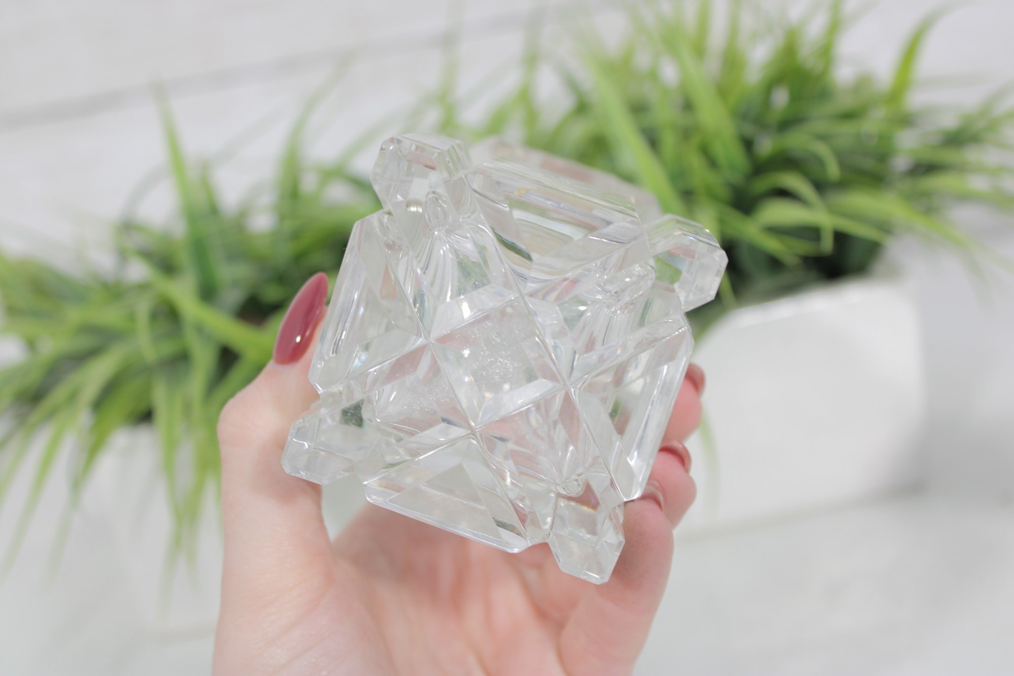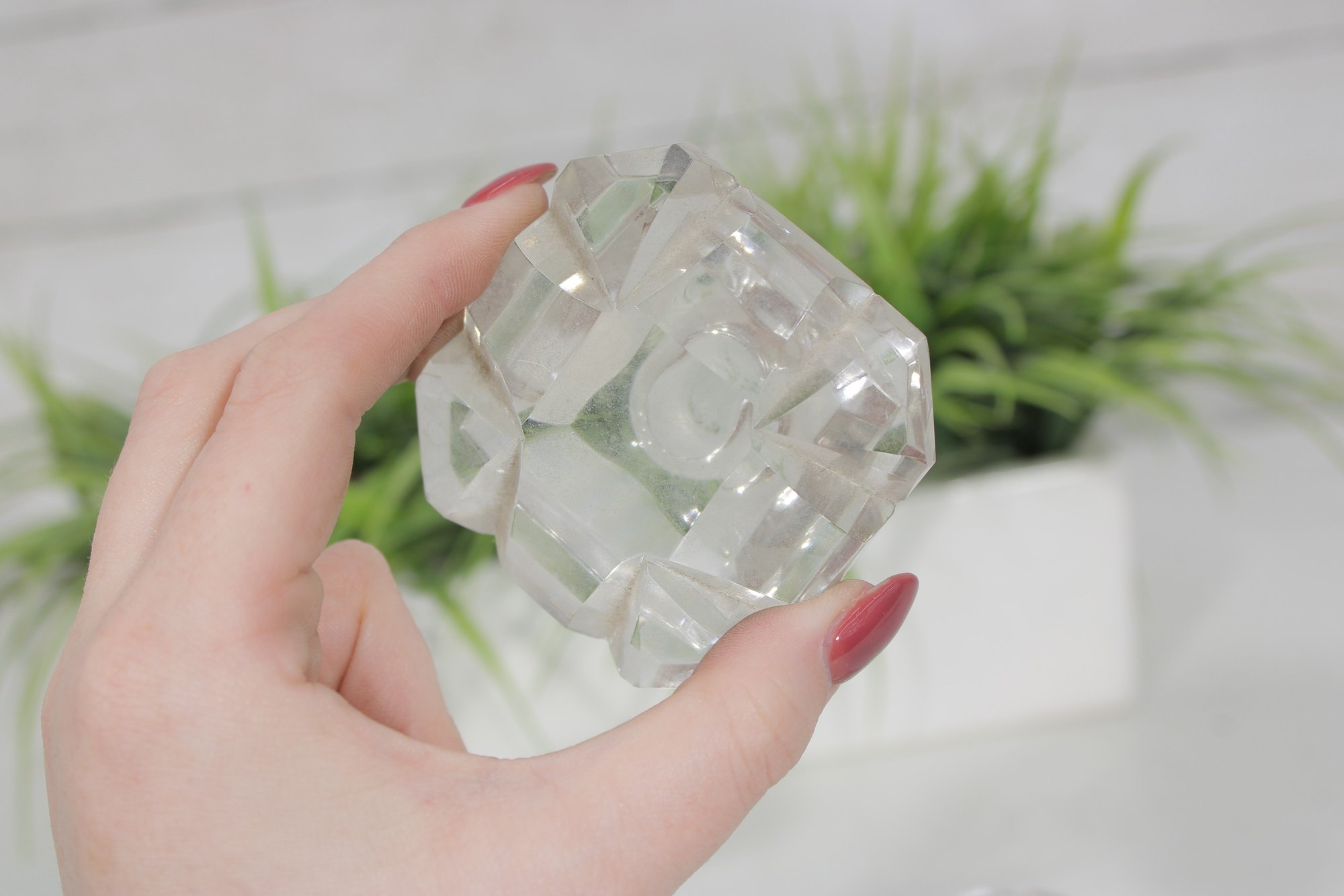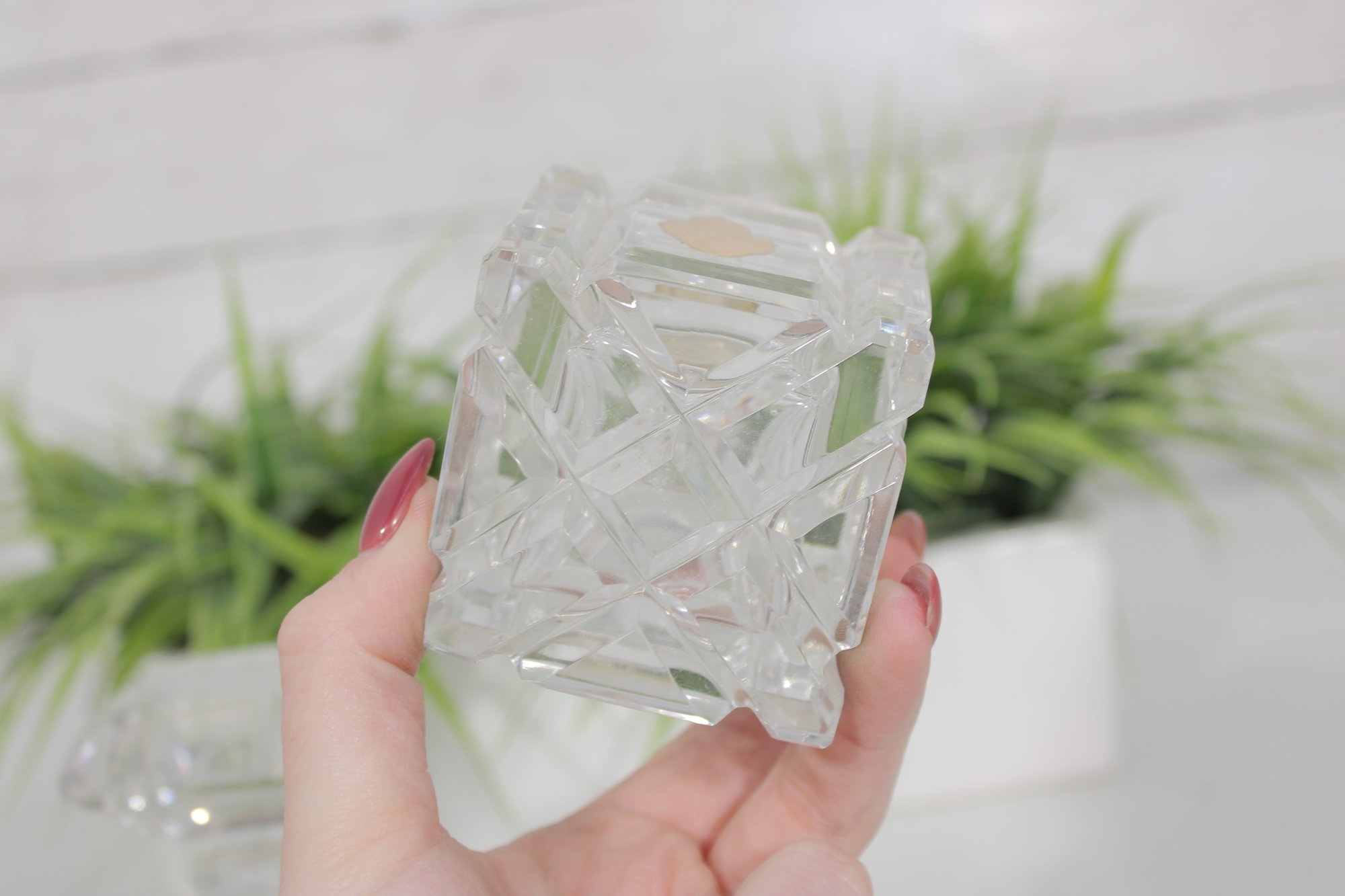 This elegant square bottle features heavy, faceted crystal glass with deeply cut geometric detailing throughout. The matching faceted stopper fits securely into the neck and complements the bold, architectural design.