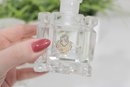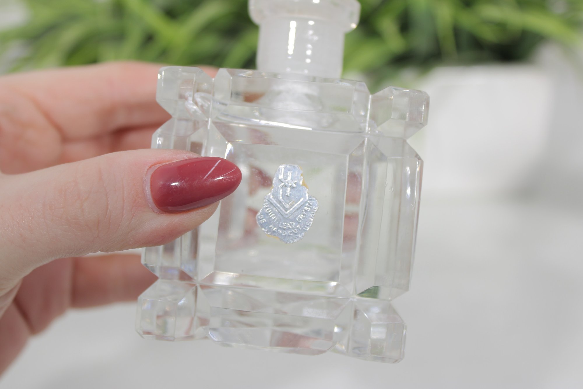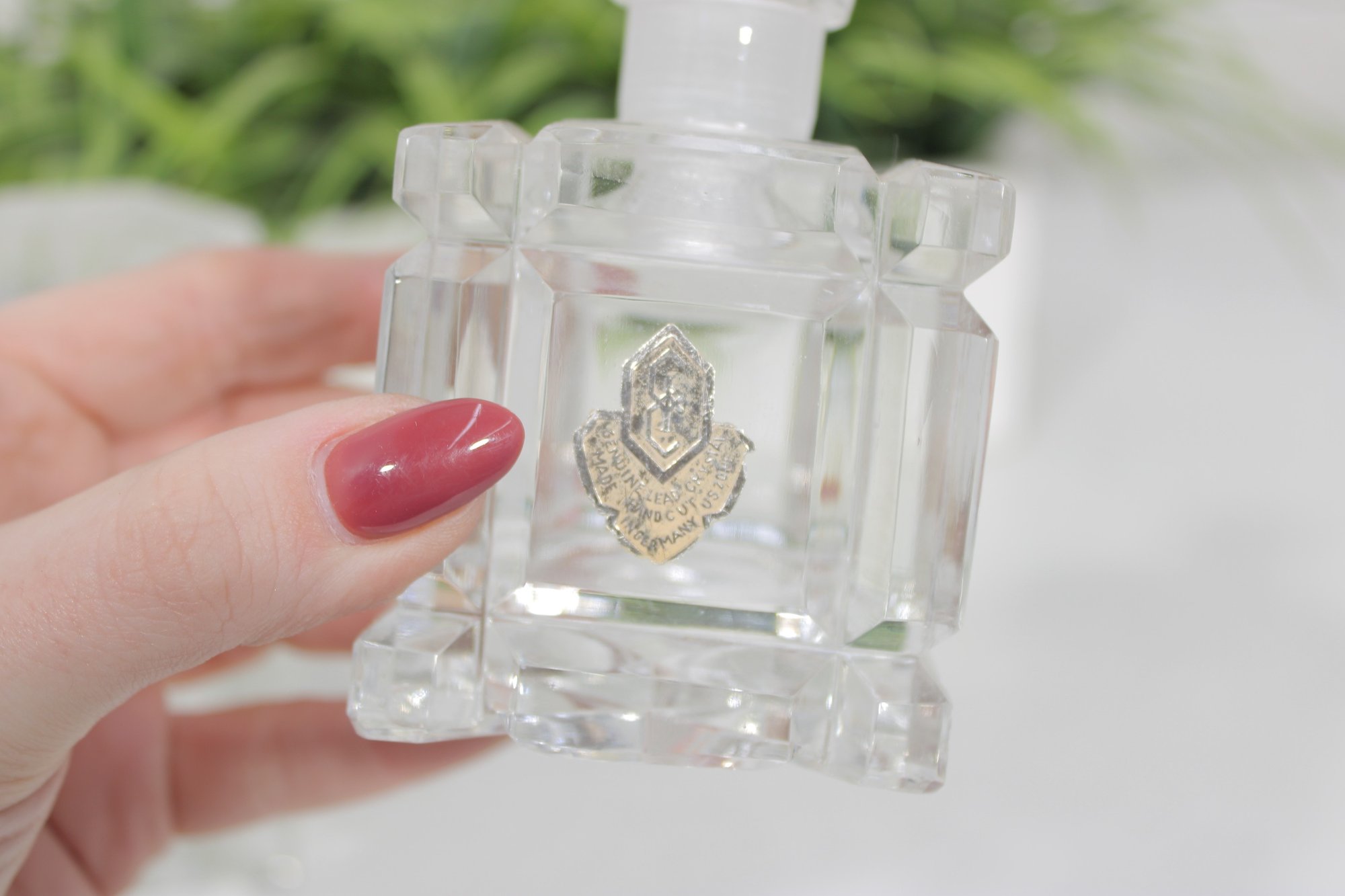 The bottle includes an applied decorative crest-style emblem on the front, adding to its classic vanity appeal.