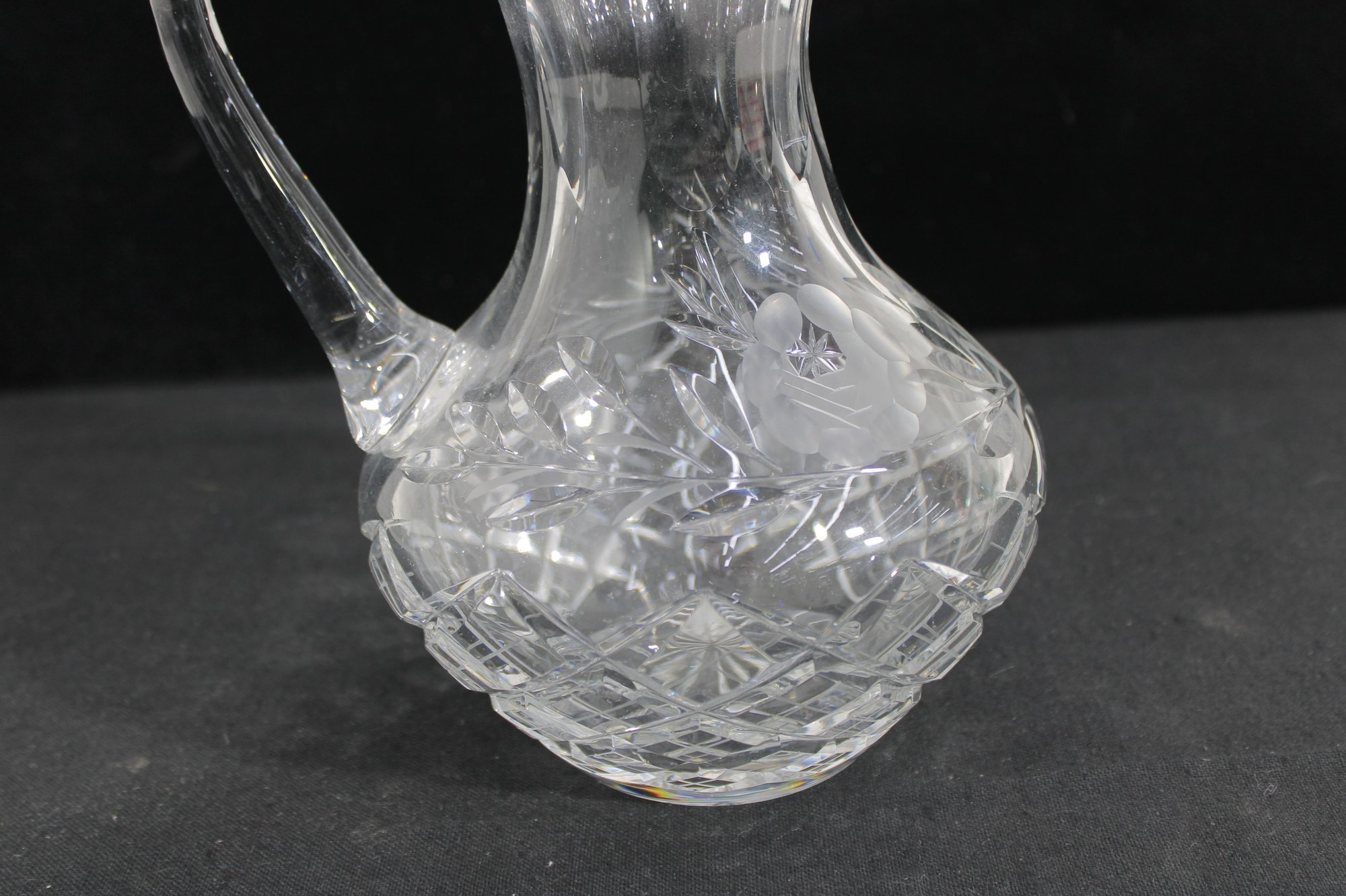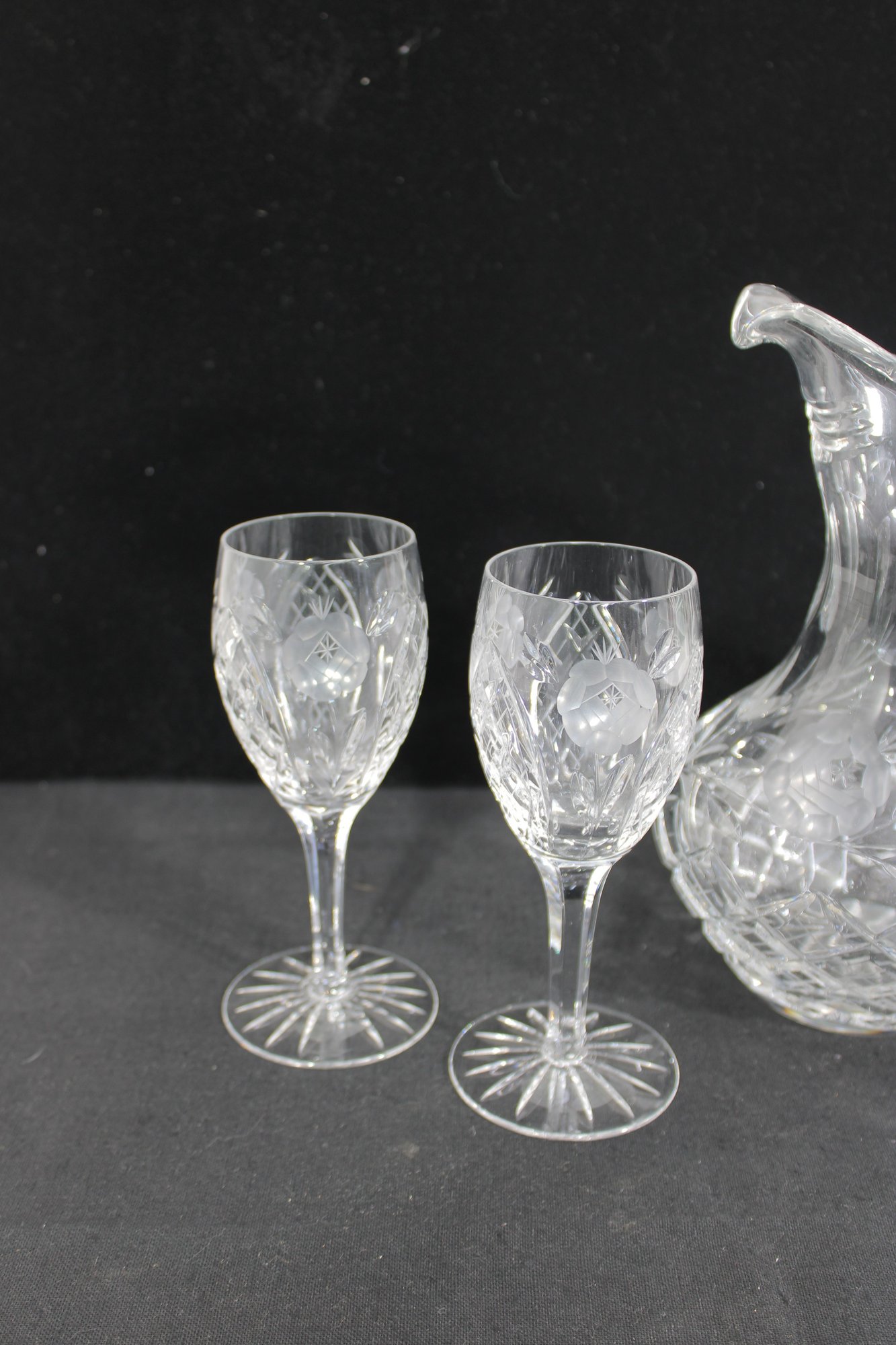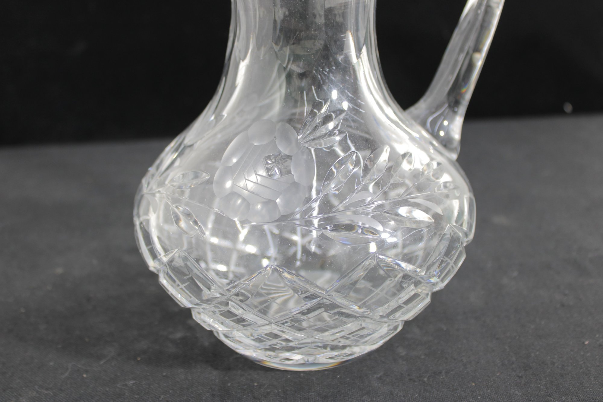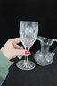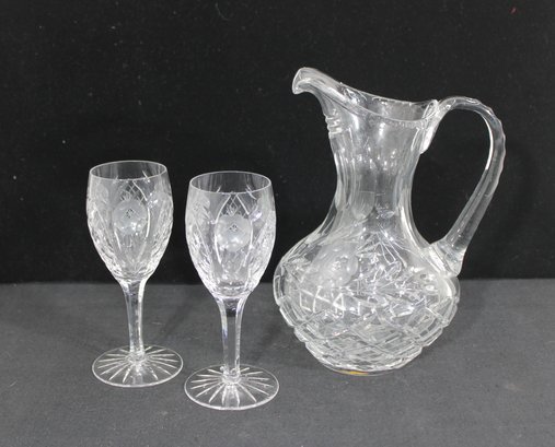 A beautiful vintage cut crystal-style serving set, featuring a decorative pitcher and two matching stemmed glasses. The pitcher showcases an elegant curved handle and spout, with intricate diamond and crosshatch patterns that catch the light beautifully. The coordinating glasses feature similar etched and cut detailing, creating a cohesive and refined presentation.