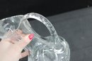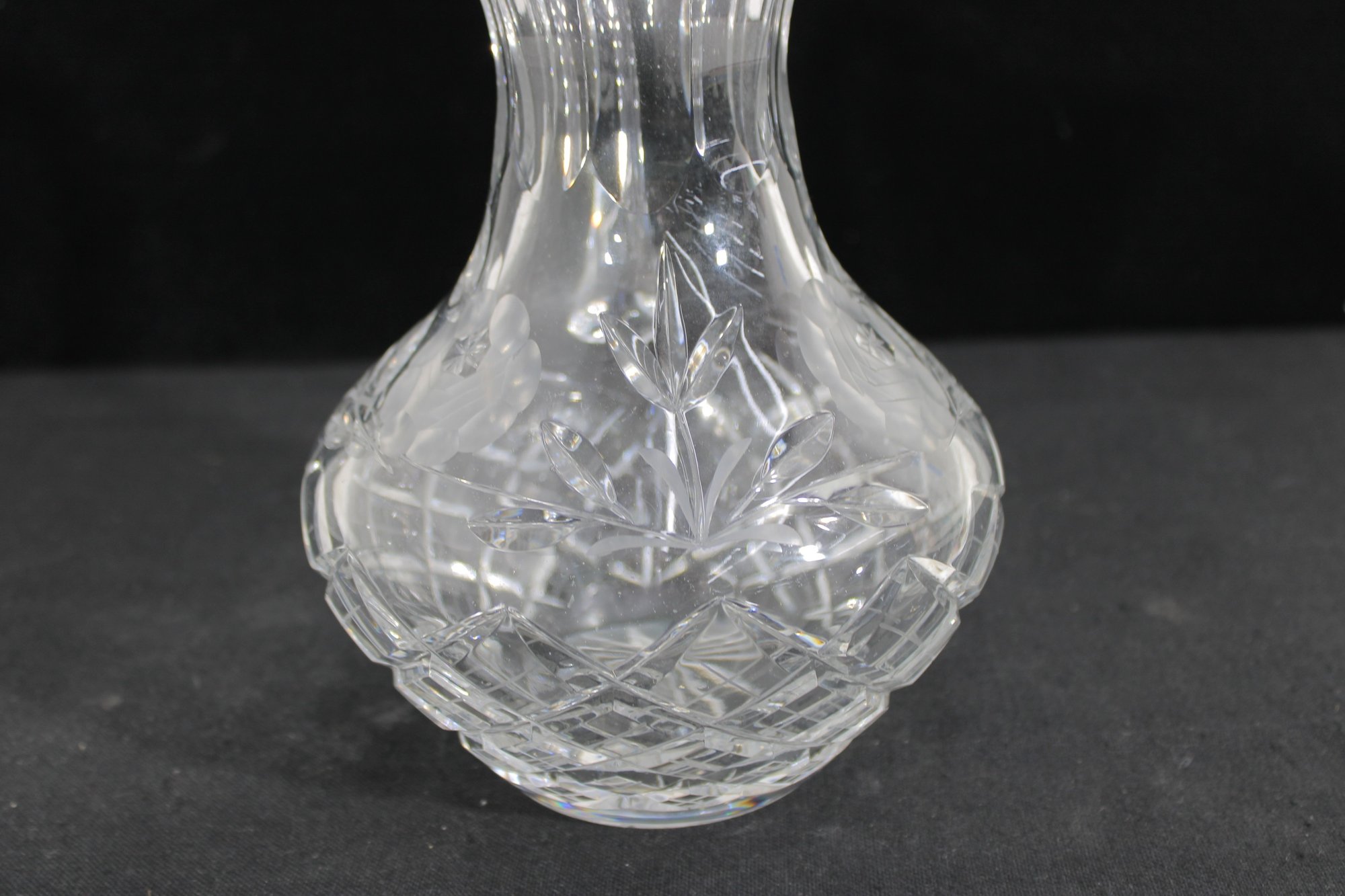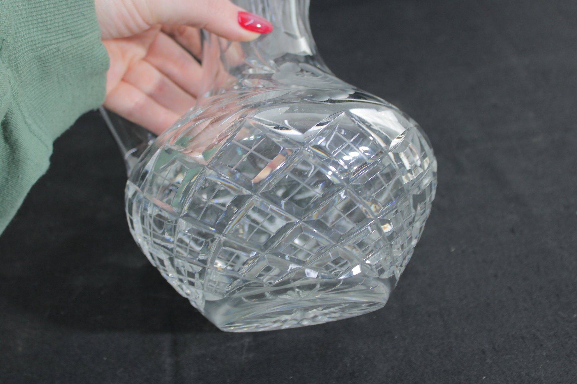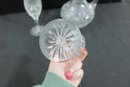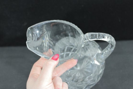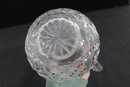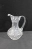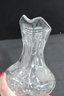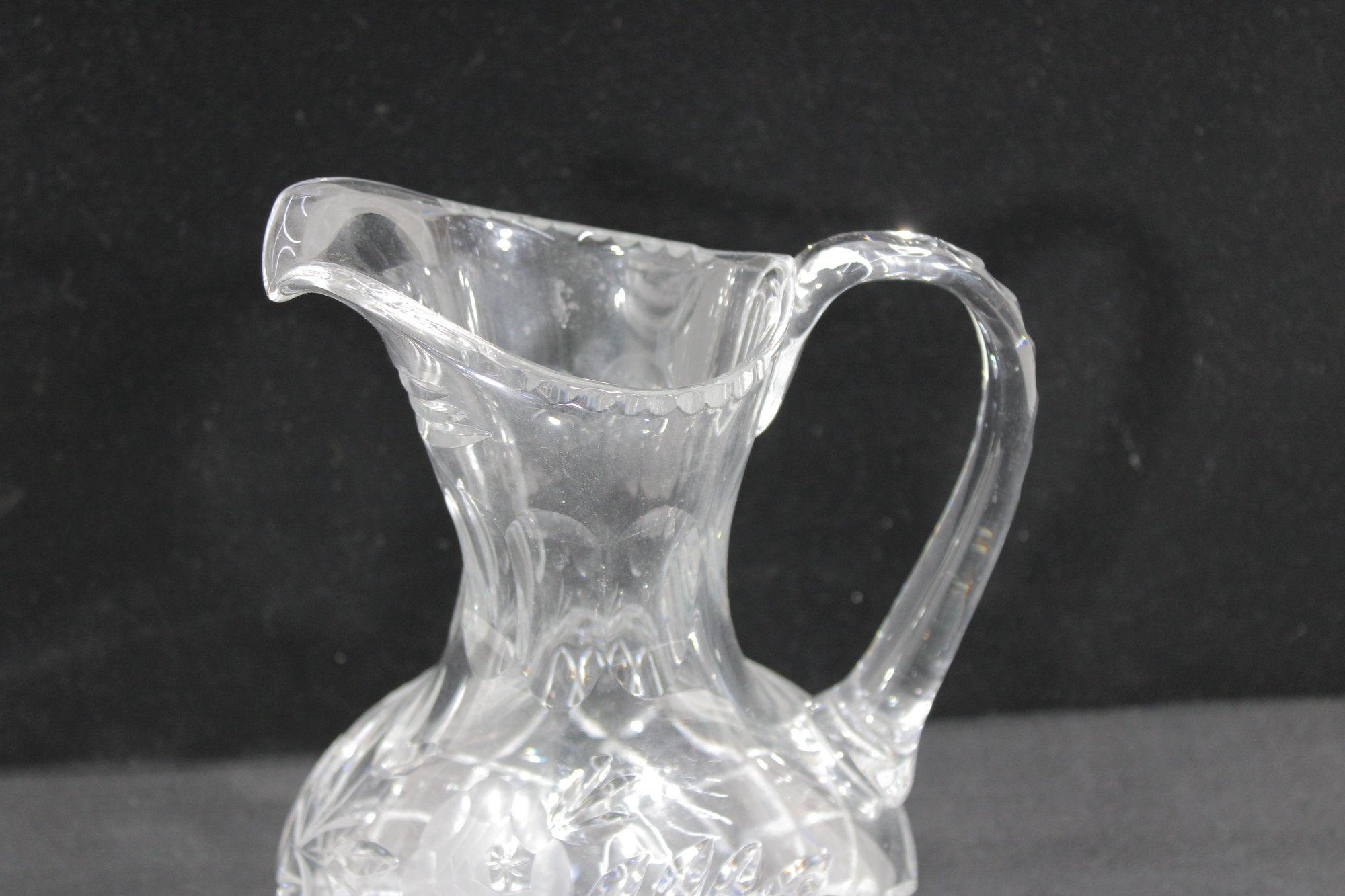 A beautiful vintage cut crystal-style serving set, featuring a decorative pitcher and two matching stemmed glasses. The pitcher showcases an elegant curved handle and spout, with intricate diamond and crosshatch patterns that catch the light beautifully. The coordinating glasses feature similar etched and cut detailing, creating a cohesive and refined presentation.