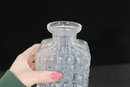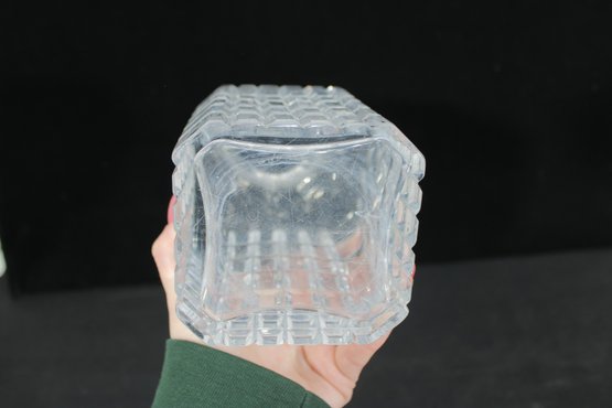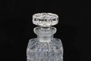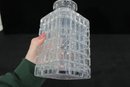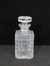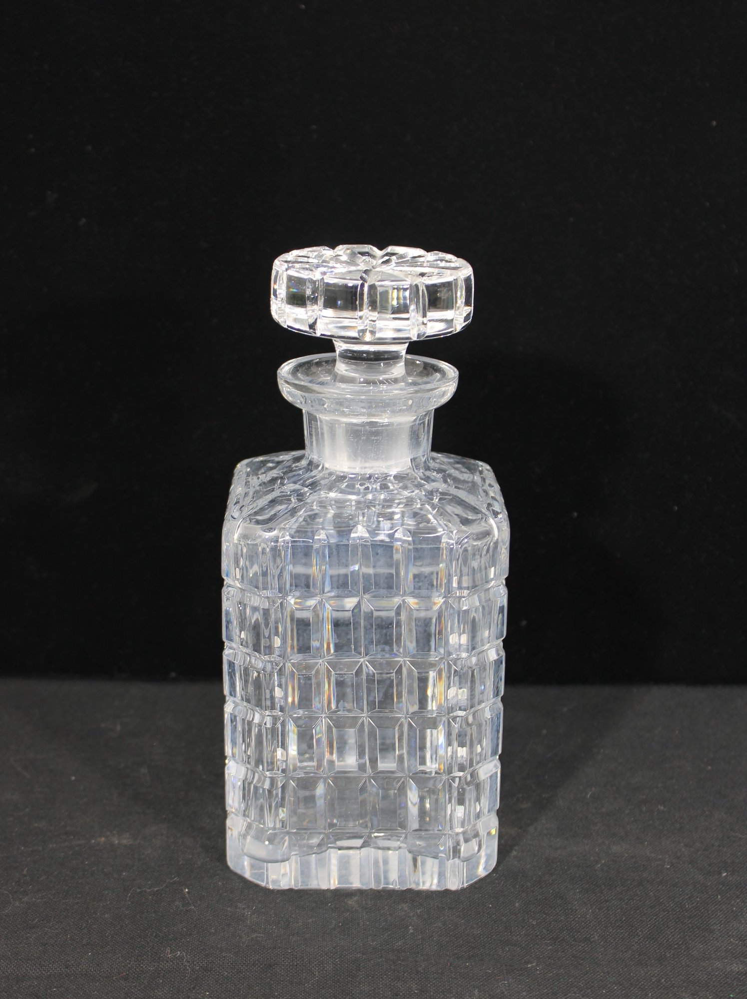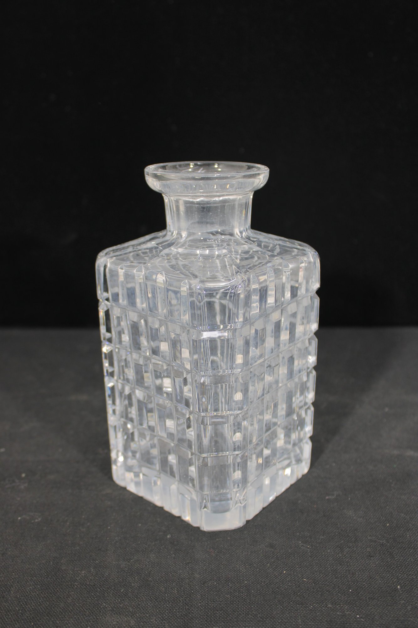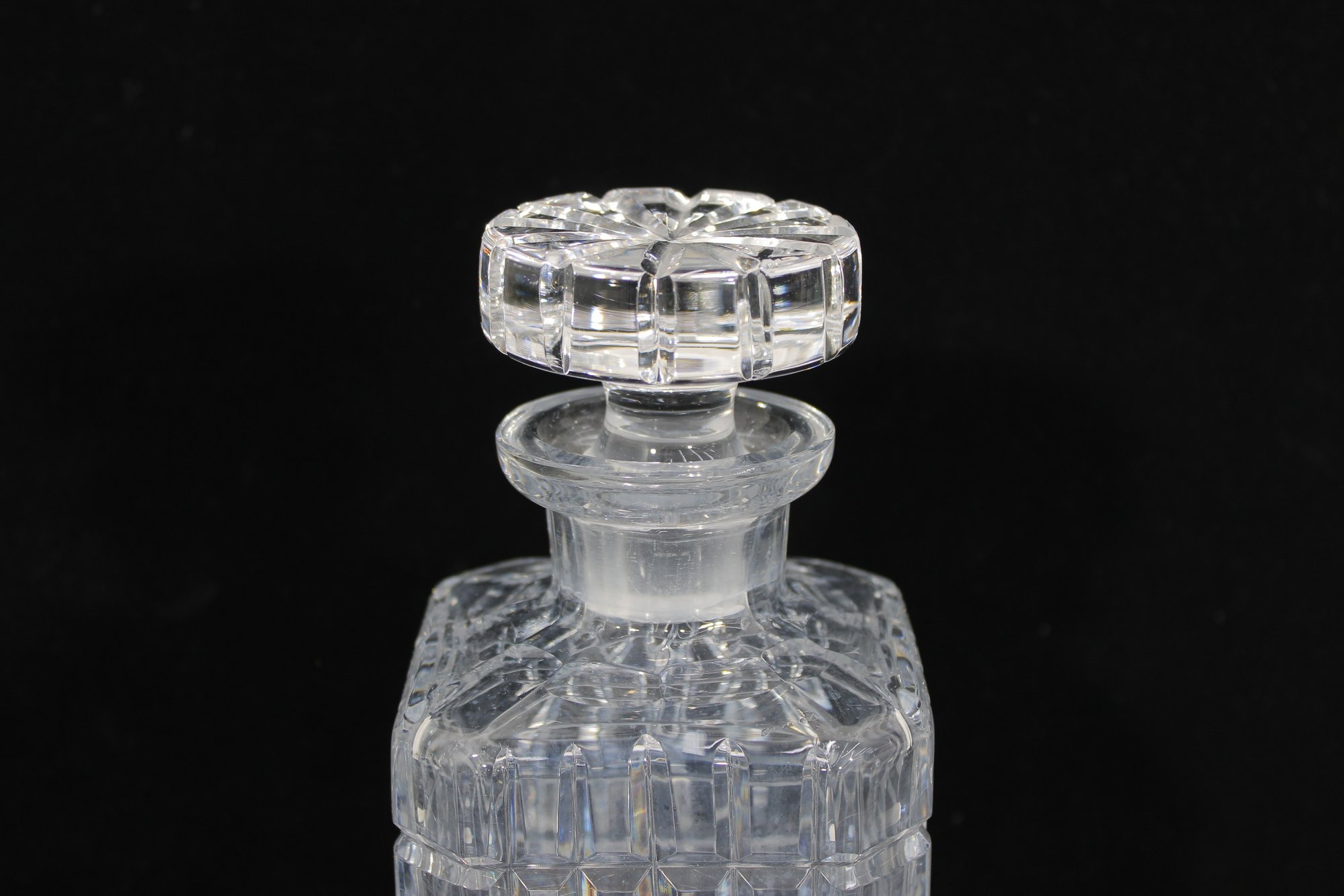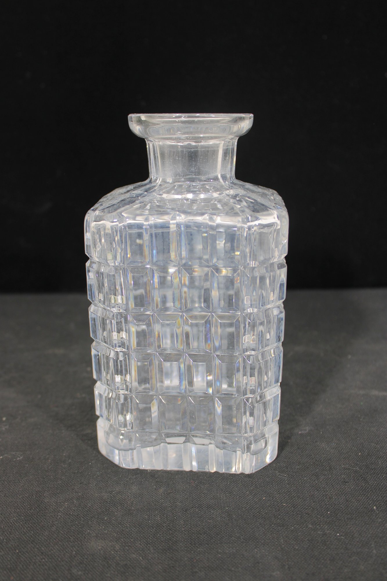 vintage cut crystal decanter featuring a striking square form and bold geometric pattern. The body displays a beautifully cut grid or block pattern that reflects light from every angle, giving the piece a classic and sophisticated appearance.