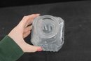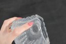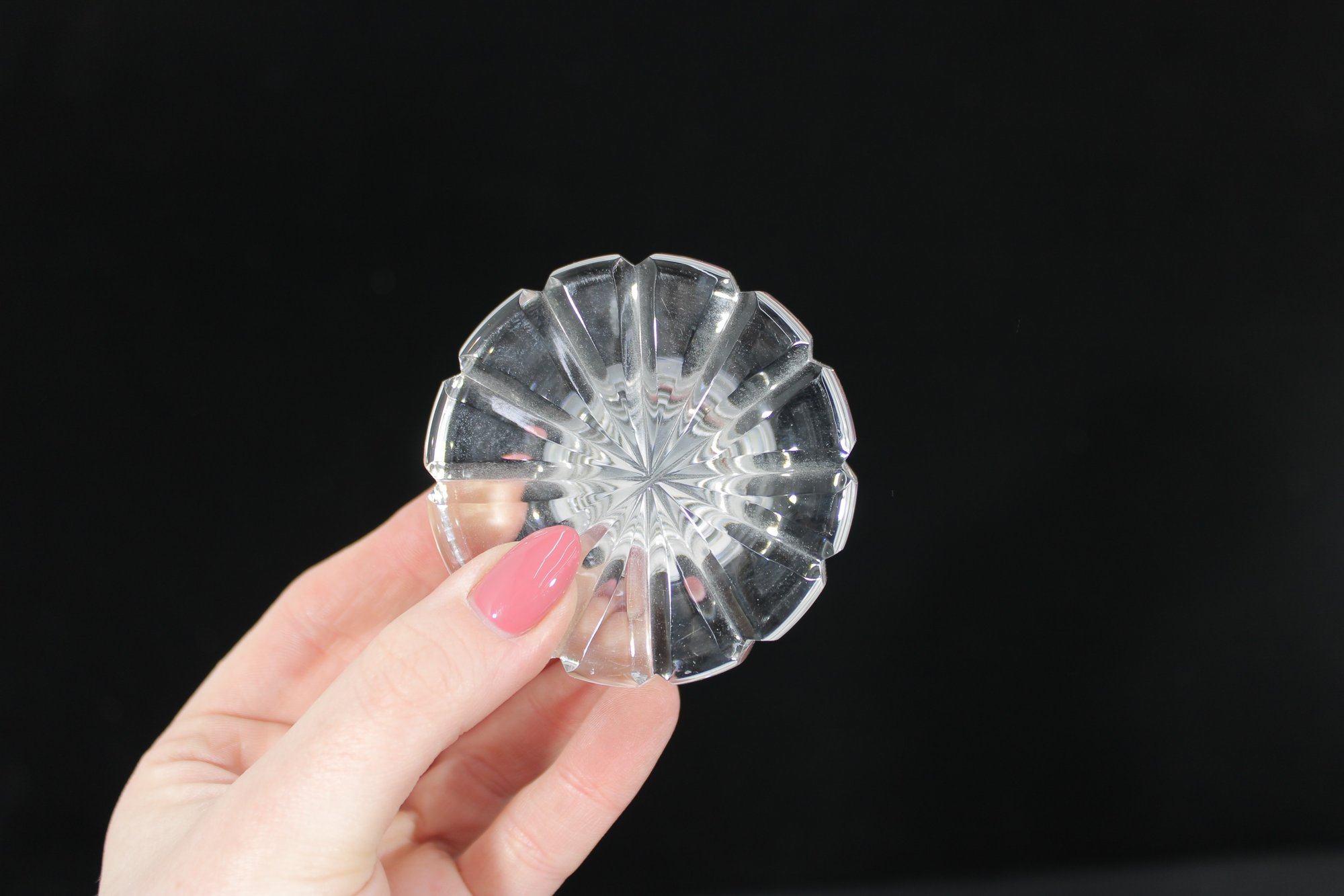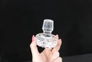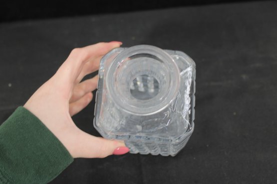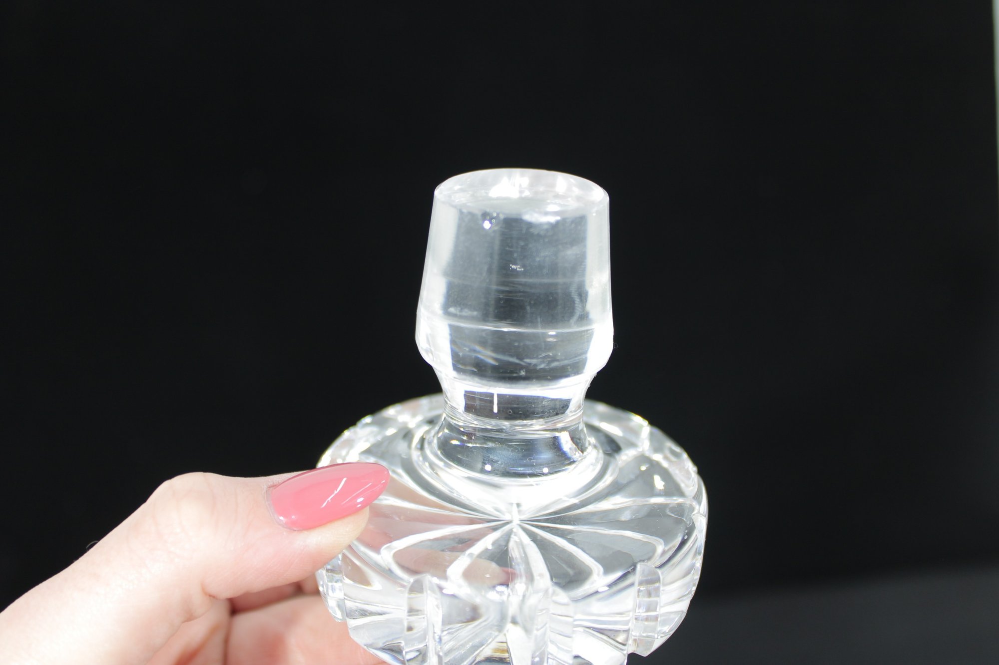 The decanter is topped with a matching faceted crystal stopper that complements the angular design of the bottle. Its compact square shape makes it both elegant and substantial, perfect for displaying on a bar cart, liquor cabinet, or dining room sideboard.