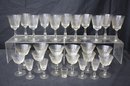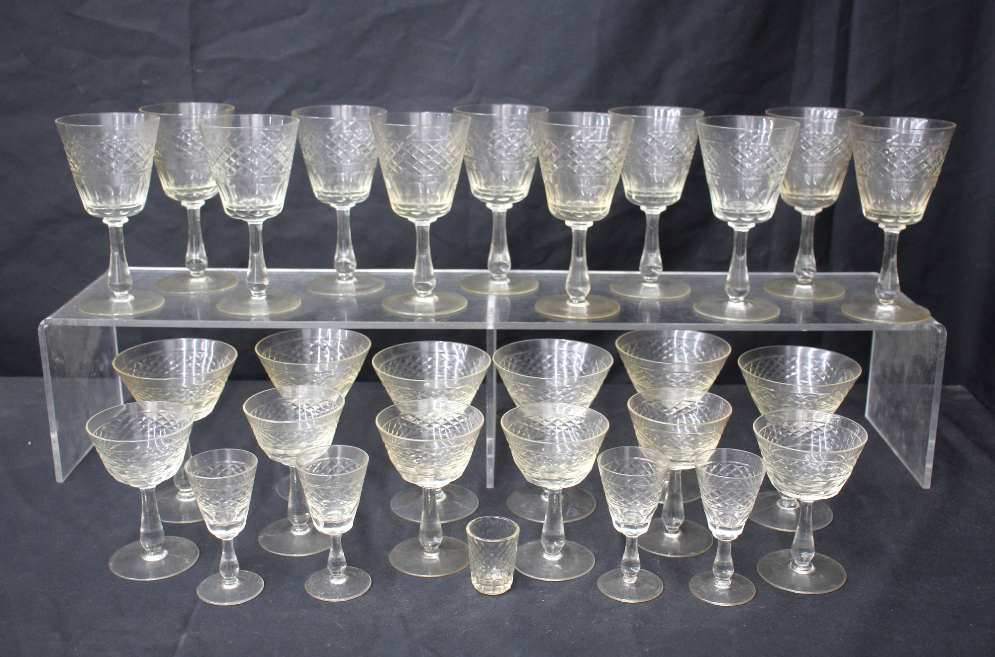 this lot includes a total of 28 pieces, showcasing a blend of elegance and craftsmanship. The set appears to be in good used condition, with each glass featuring intricate cut patterns that play with light to add sparkle to any table setting.