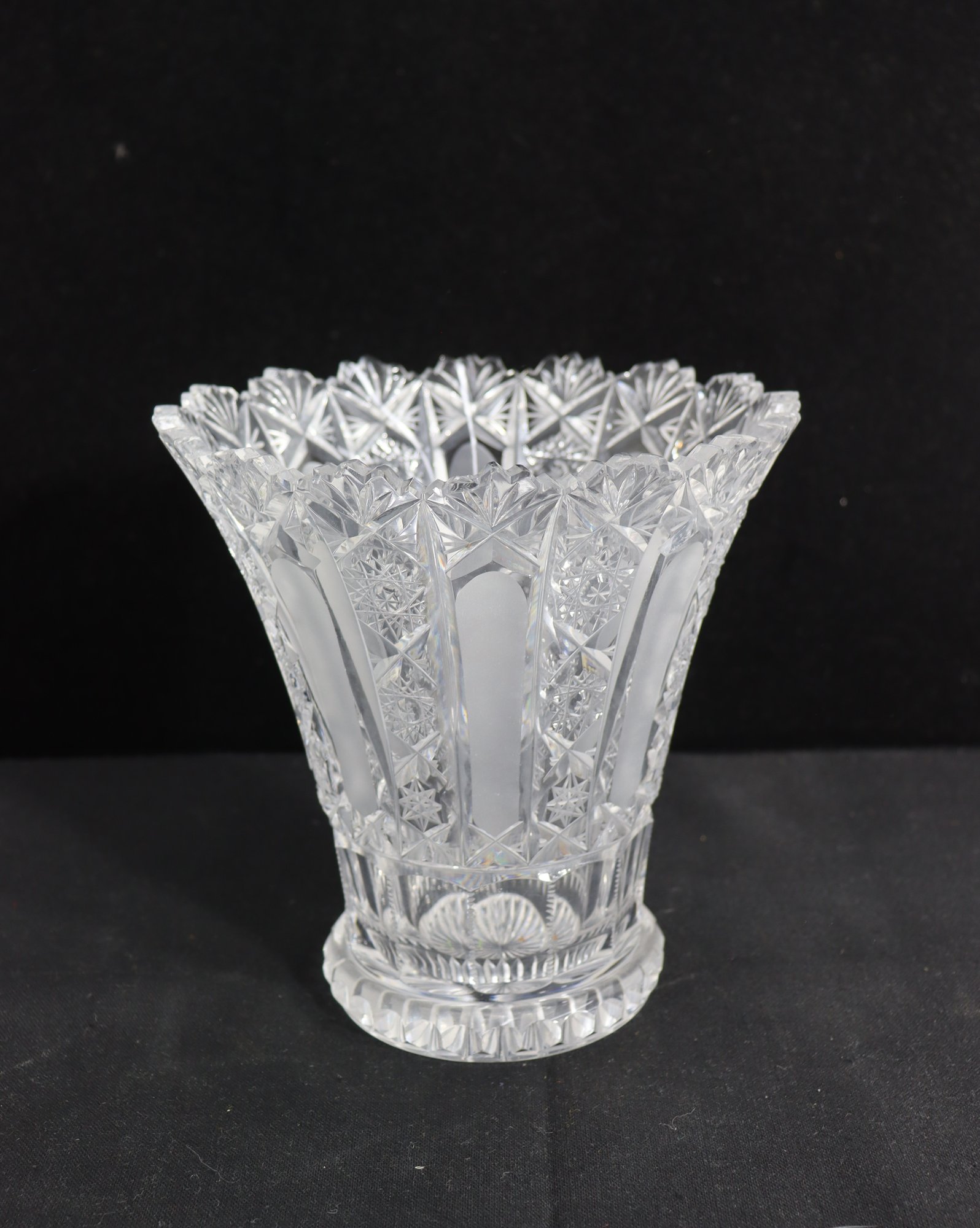 this stunning vintage cut crystal vase, featuring gorgeous hand-cut detailing and brilliant light-catching facets throughout. The flared rim, deep geometric cuts, and starburst base highlight the craftsmanship and elegance of classic cut crystal.