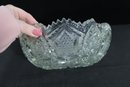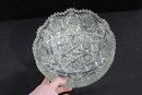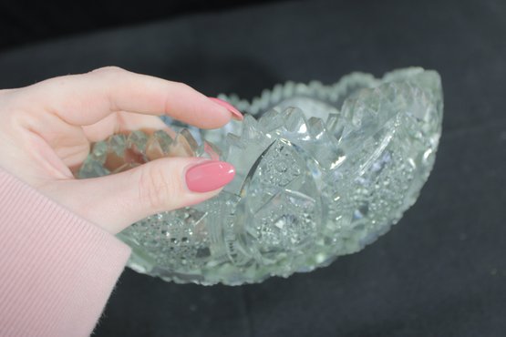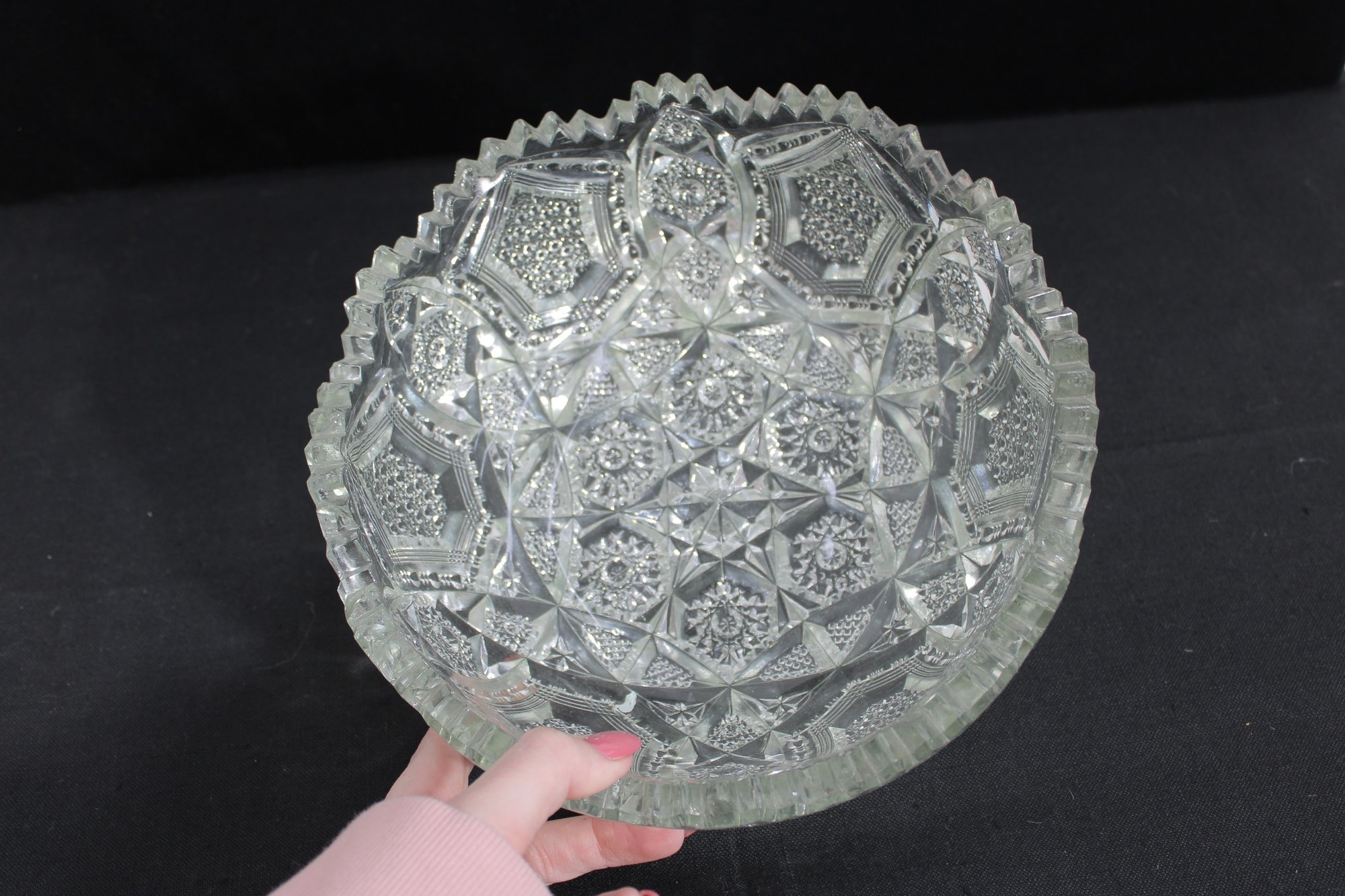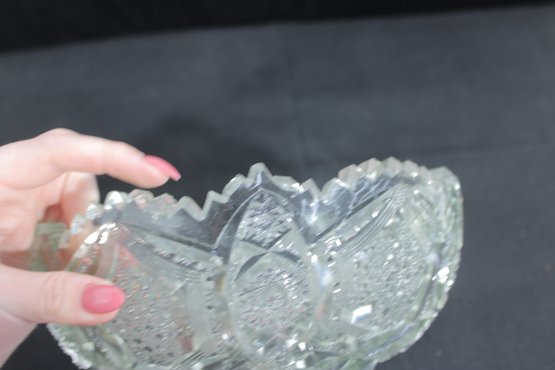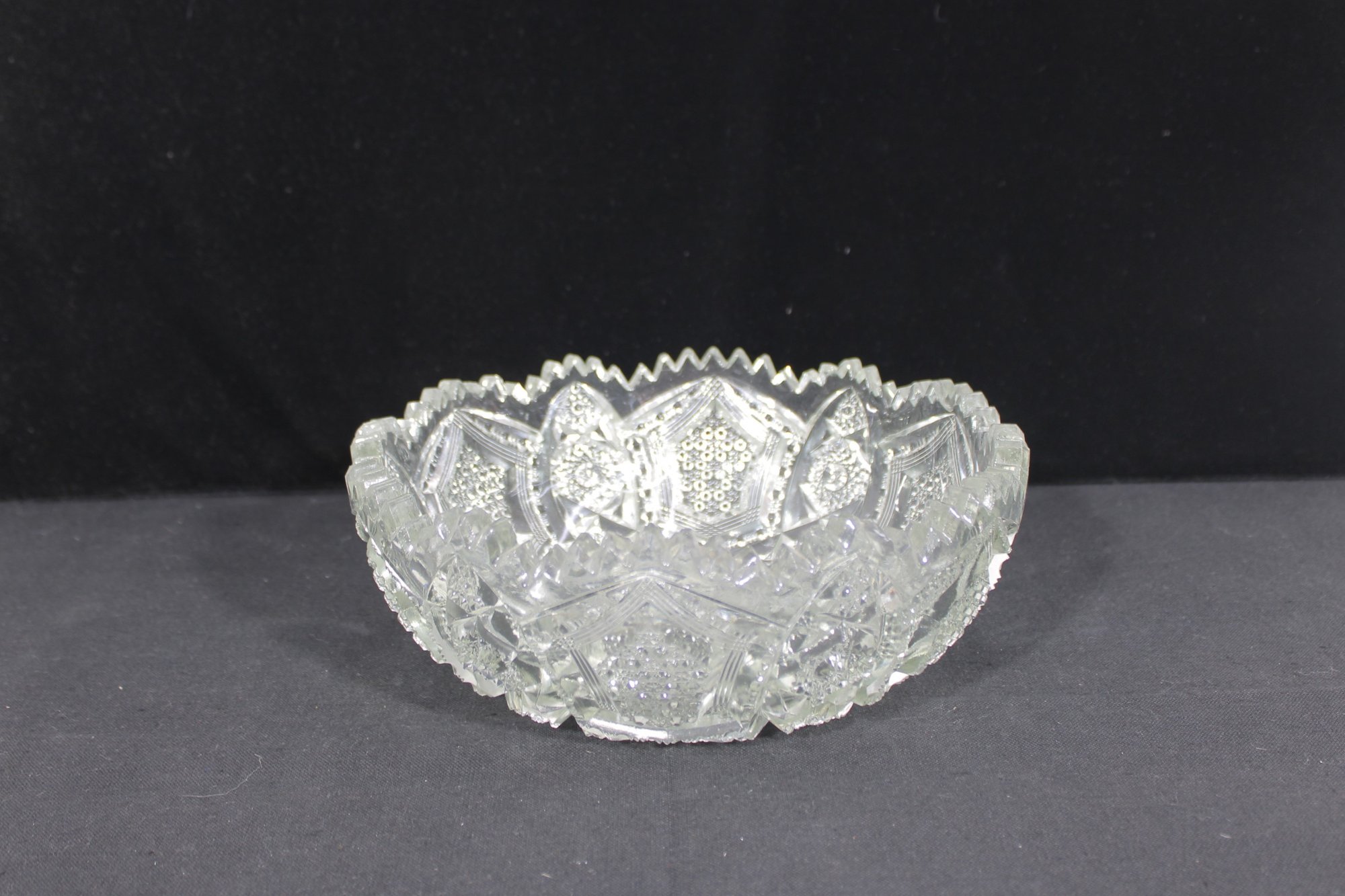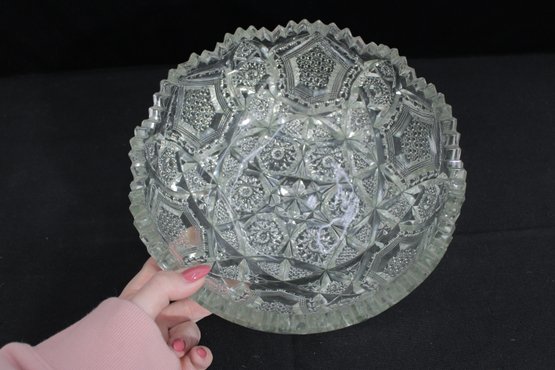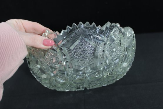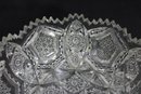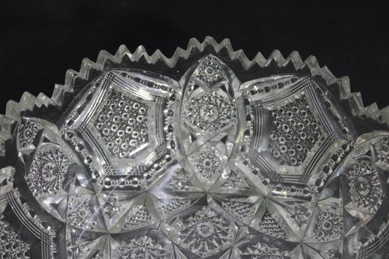 Striking vintage cut glass bowl featuring an intricate geometric and starburst pattern with a bold sawtooth rim. The deeply cut design includes panels of crosshatching, hobstar, and diamond motifs, creating beautiful light reflection and texture throughout.