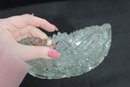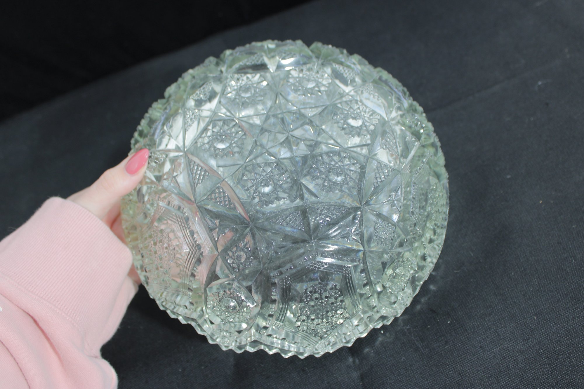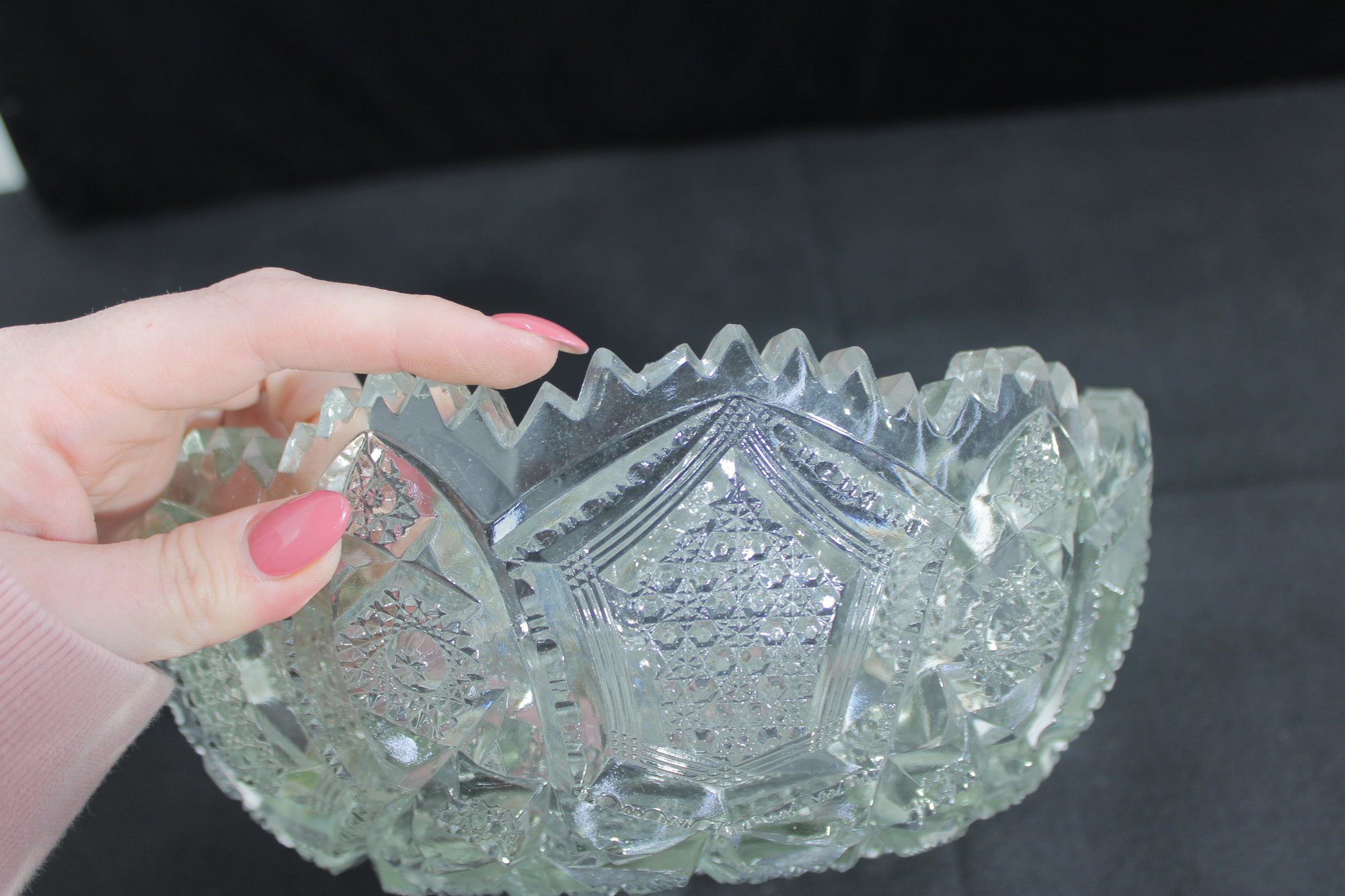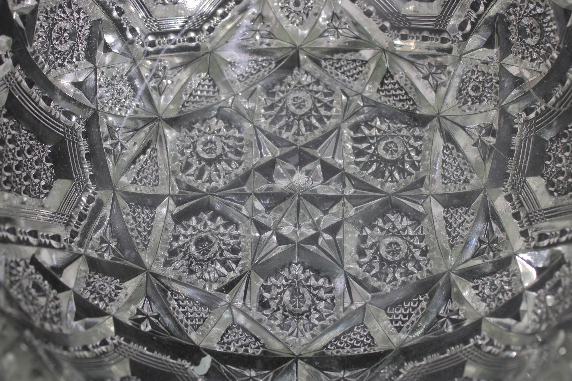 Striking vintage cut glass bowl featuring an intricate geometric and starburst pattern with a bold sawtooth rim. The deeply cut design includes panels of crosshatching, hobstar, and diamond motifs, creating beautiful light reflection and texture throughout.