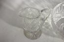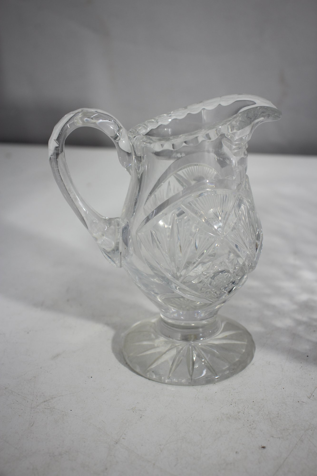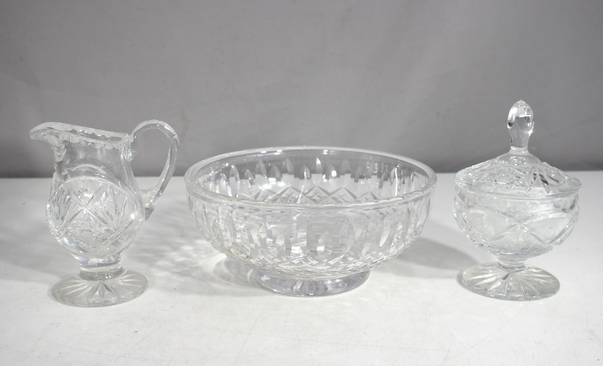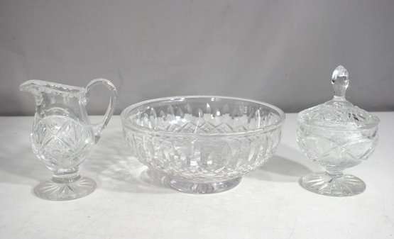 vintage cut glass crystal serving set includes three beautifully designed pieces: a footed creamer pitcher, a lidded candy dish, and a decorative serving bowl. Each piece features intricate cut patterns that catch and reflect light, making this set perfect for display or entertaining.