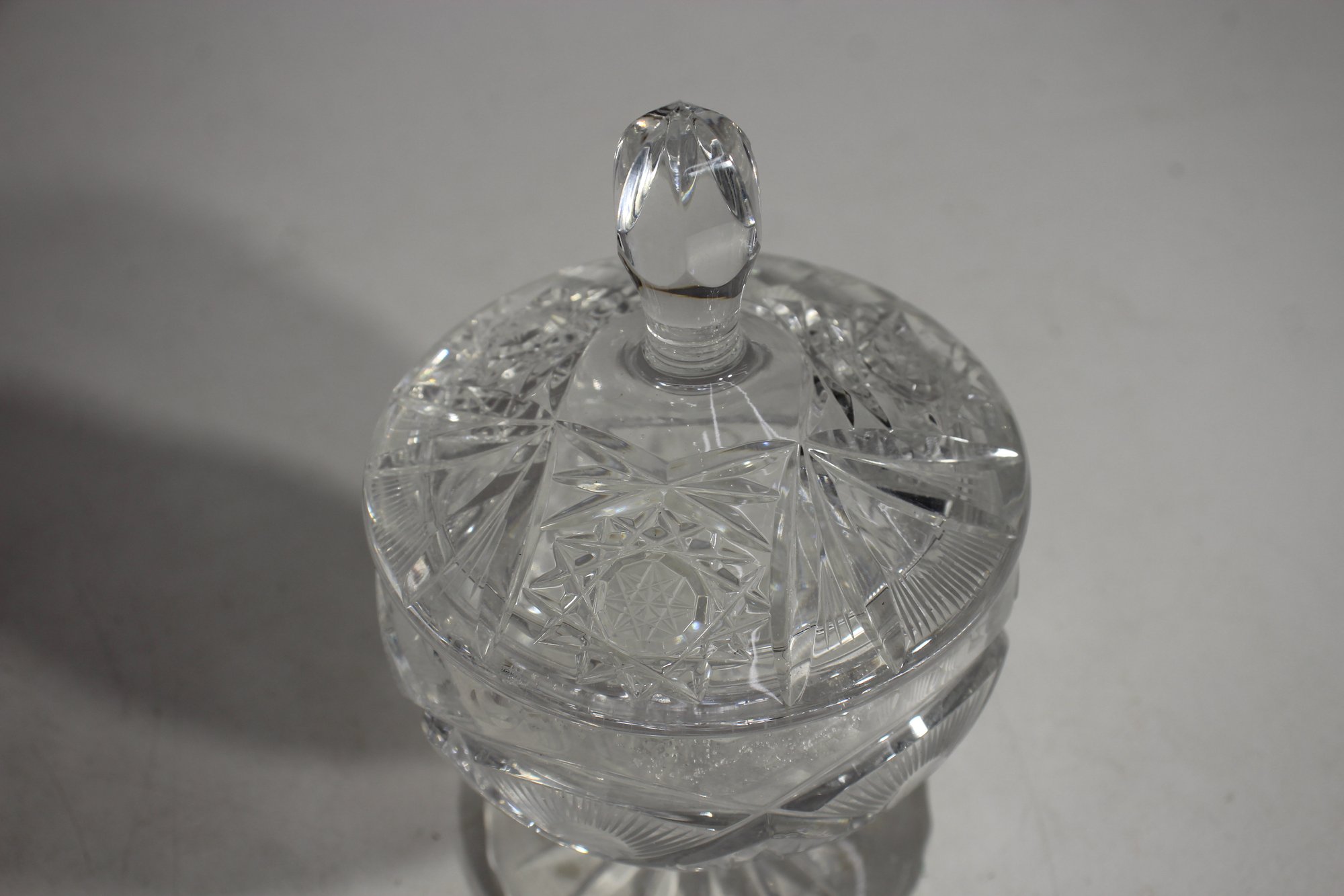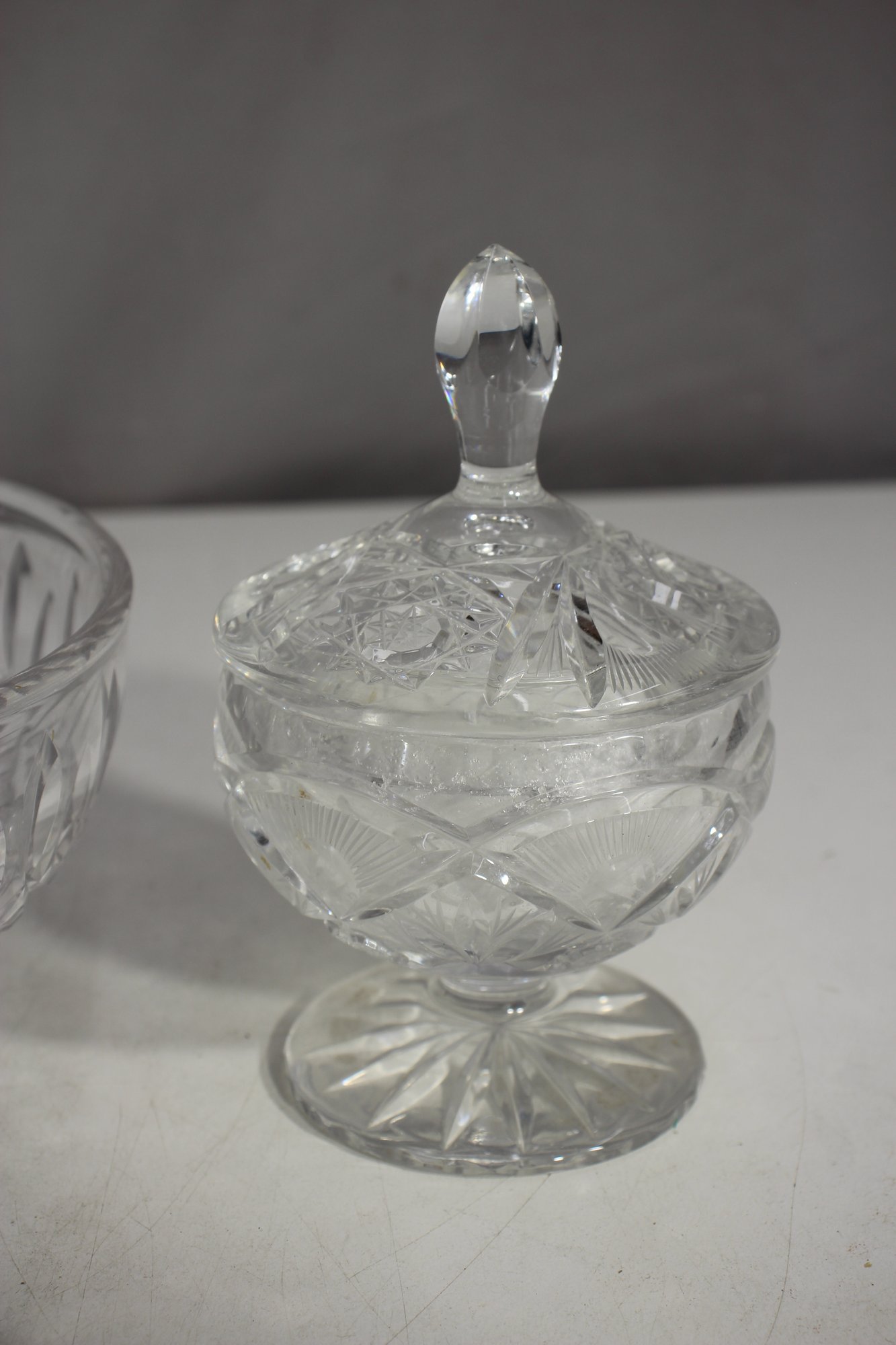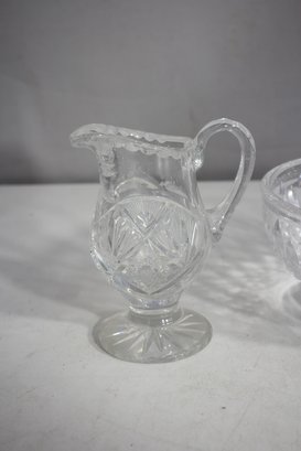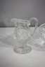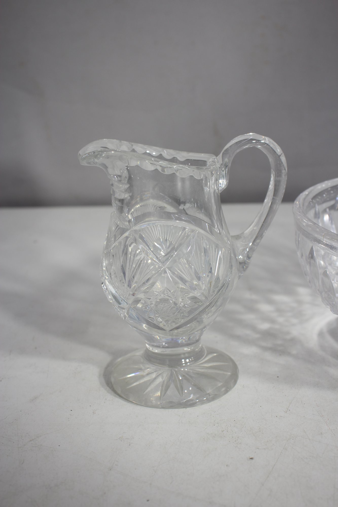 vintage cut glass crystal serving set includes three beautifully designed pieces: a footed creamer pitcher, a lidded candy dish, and a decorative serving bowl. Each piece features intricate cut patterns that catch and reflect light, making this set perfect for display or entertaining.
