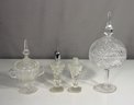 This stunning collection of vintage cut glass crystal tableware includes an elegant assortment of covered compotes, sugar bowls, and salt & pepper shakers, each featuring intricate geometric patterns and decorative finials.