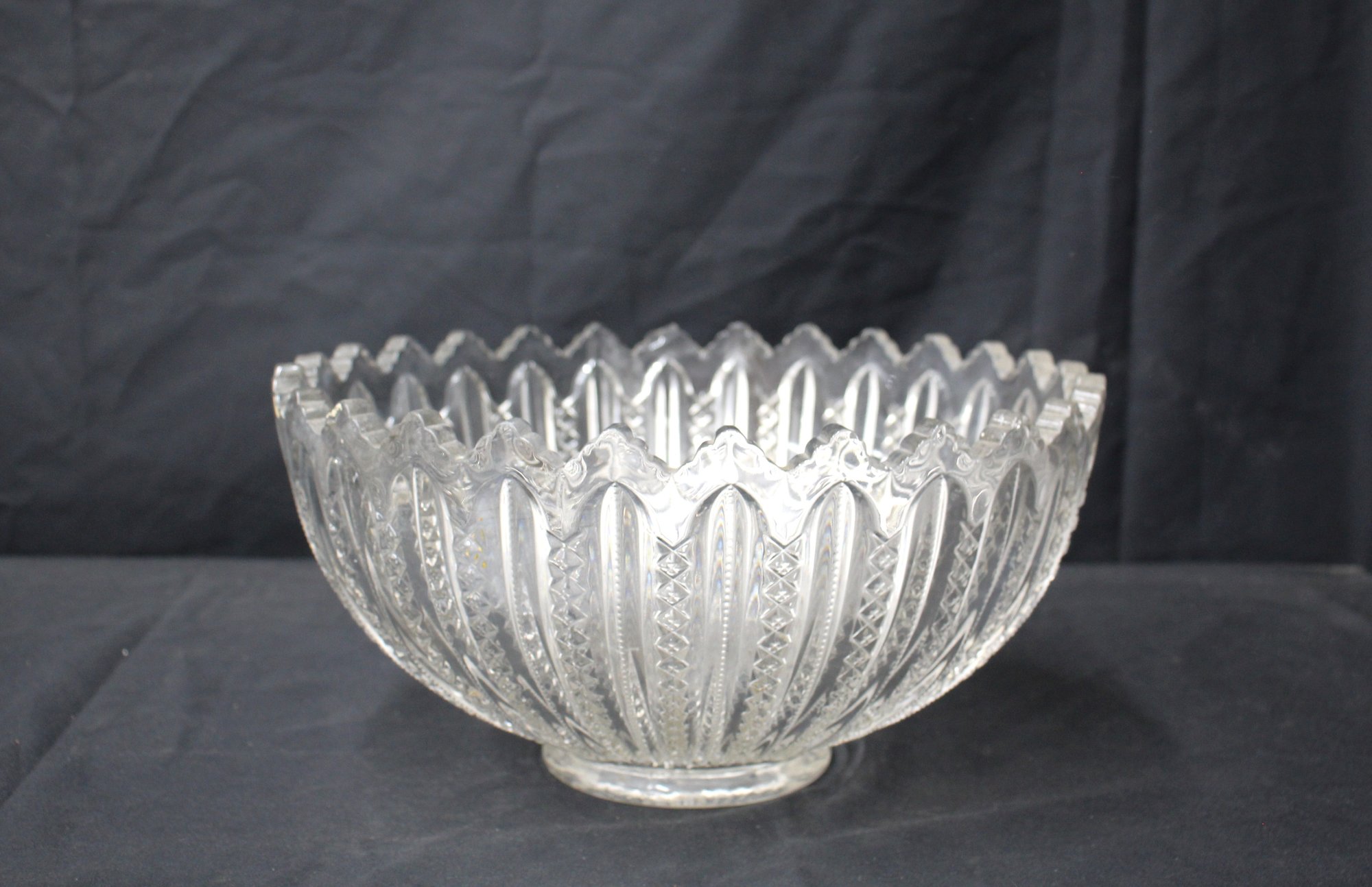 The bowl features a harmonious symphony of cut glass patterns, including diamond cuts that beautifully catch and reflect light, and elongated vertical cuts that add depth and texture. The fluted edges are meticulously scalloped, contributing to its classic aesthetic.