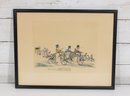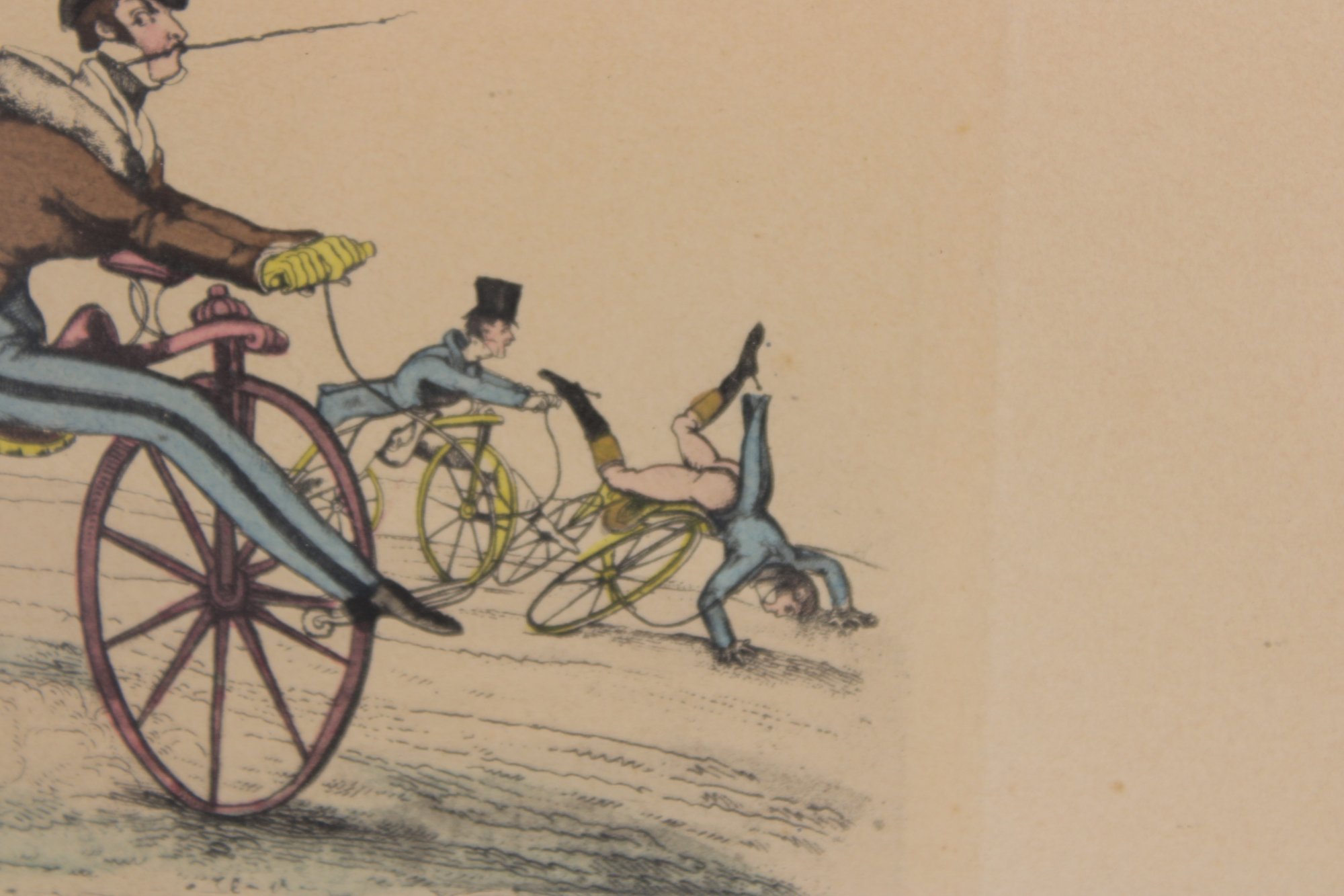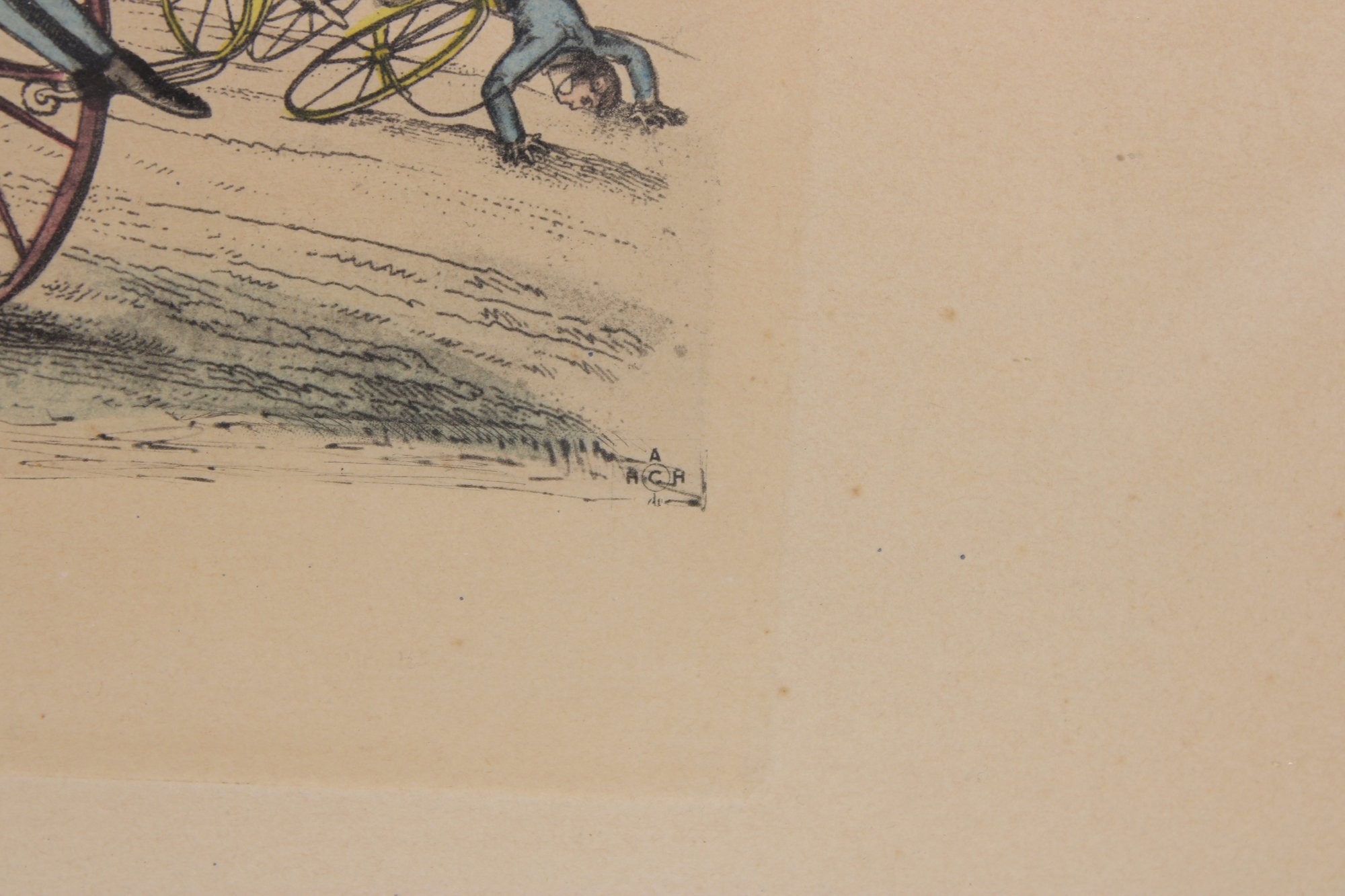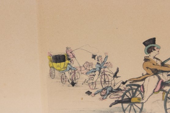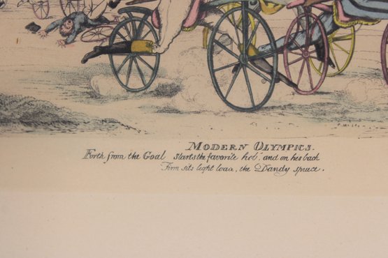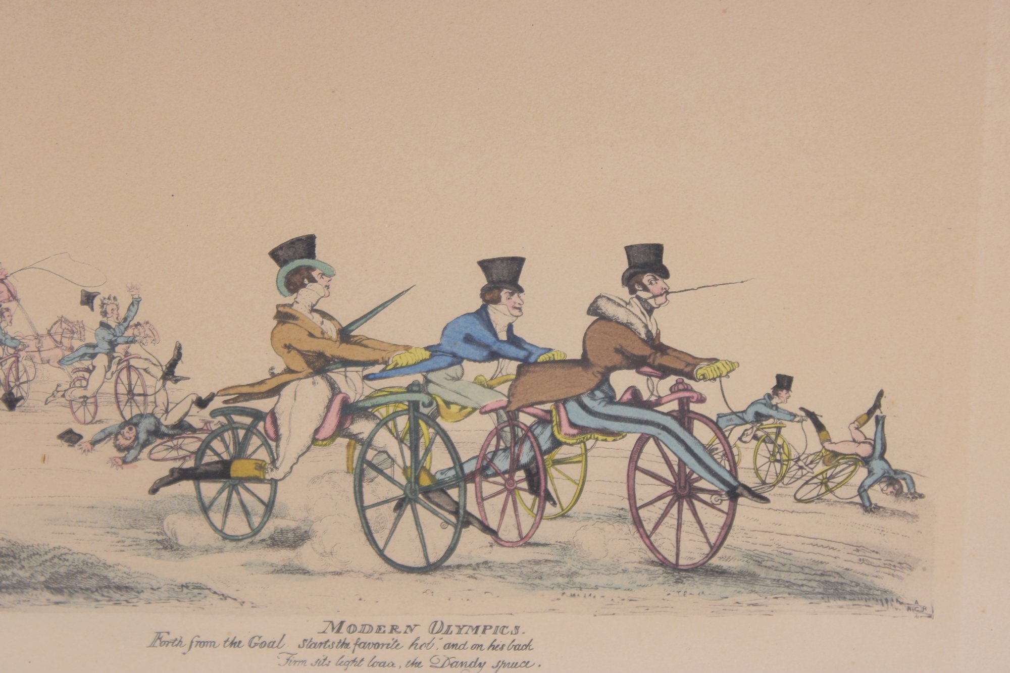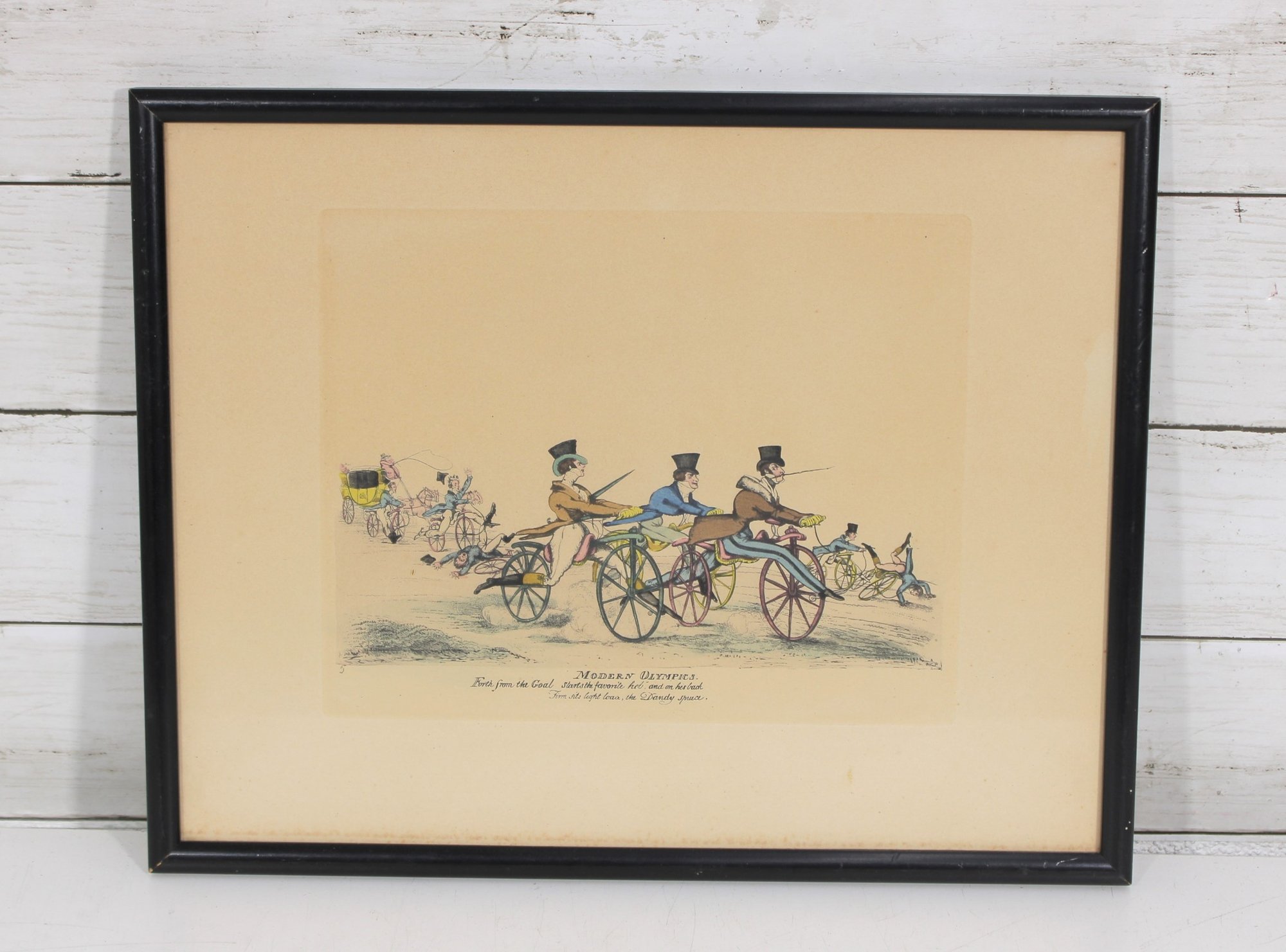Fun vintage cycling-themed humorous print titled “Modern Olympics.” The illustration shows several Victorian-era gentlemen racing unusual early bicycles and velocipedes, capturing the playful experimentation and enthusiasm surrounding the early days of cycling.