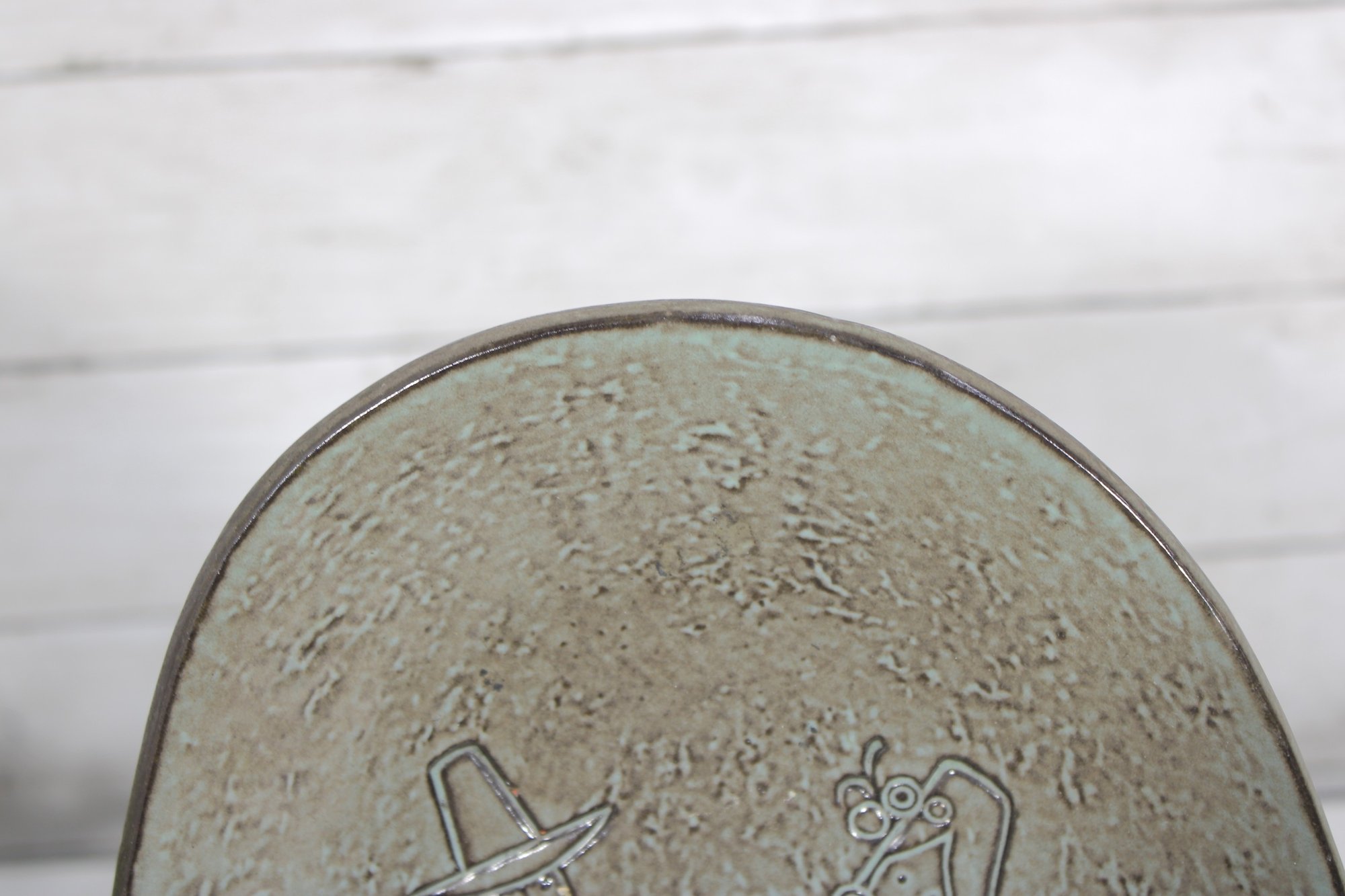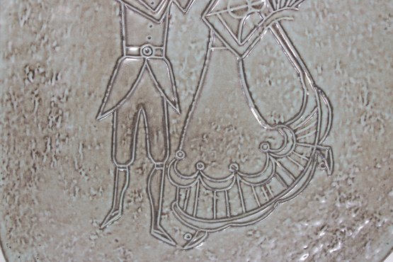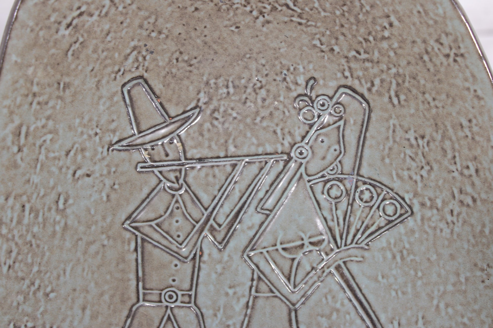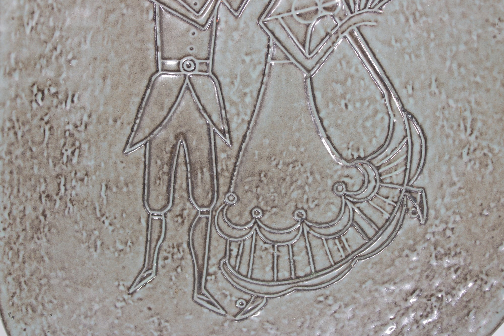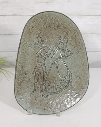 Vintage Danish modern decorative metal tray featuring a unique asymmetrical organic shape and an etched figural design of a stylized couple in mid-century modern form. The textured surface and minimalist line work reflect classic Scandinavian design aesthetics.