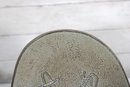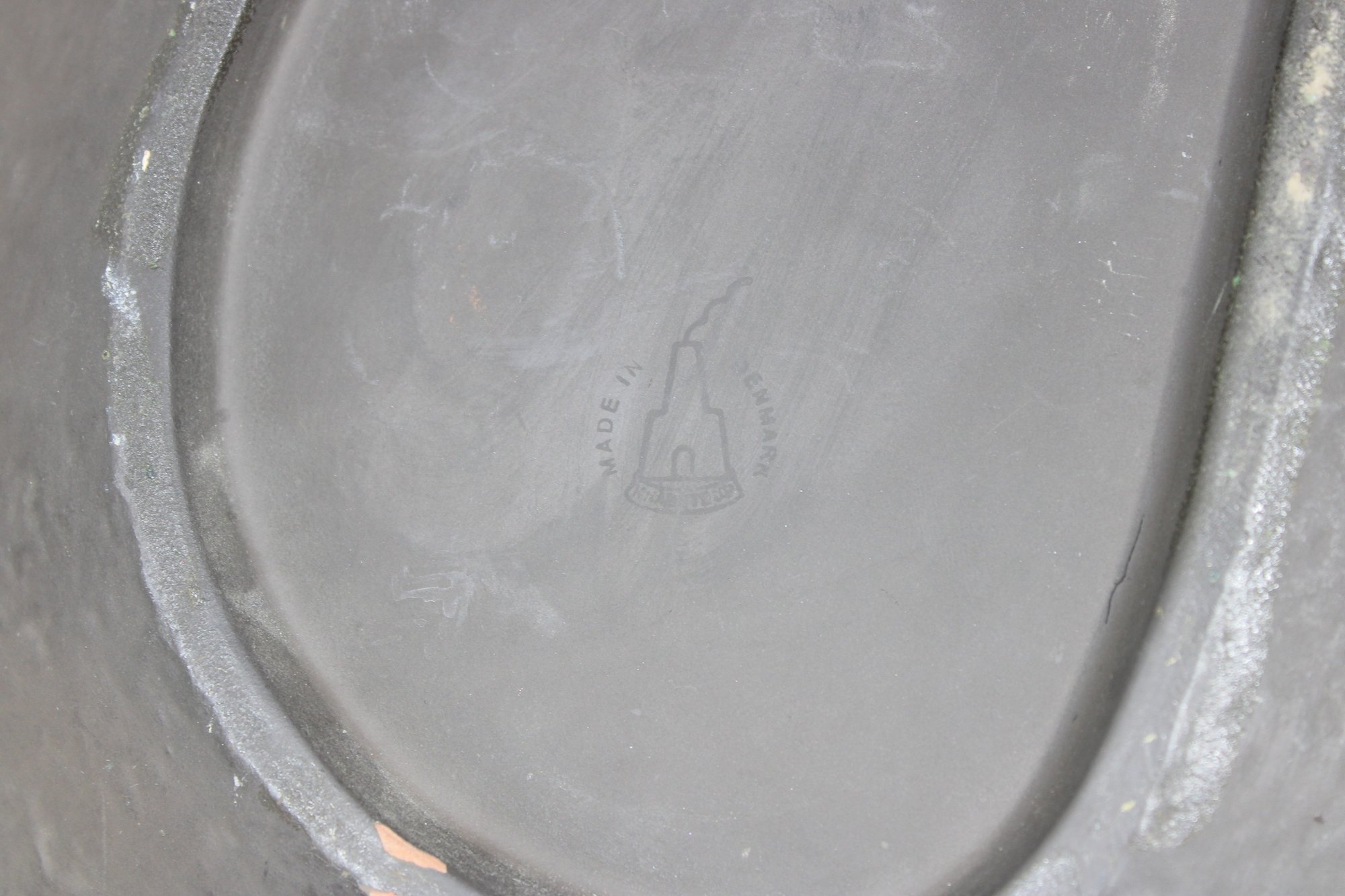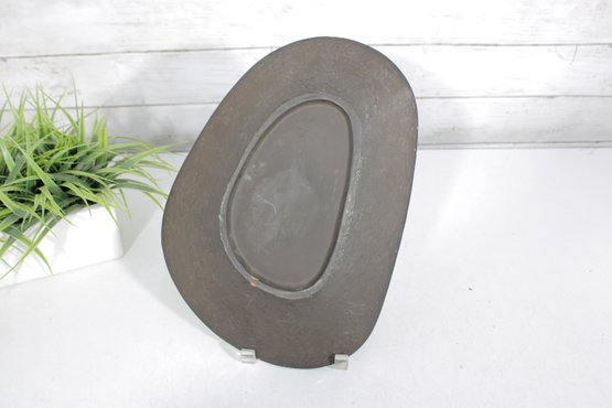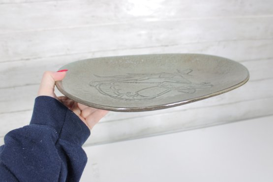 Marked “Made in Denmark” on the reverse, this piece measures approximately 13 inches by 9.5 inches. The tray has a softly hammered finish with a subtle metallic tone, giving it a refined yet artistic presence.