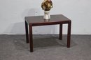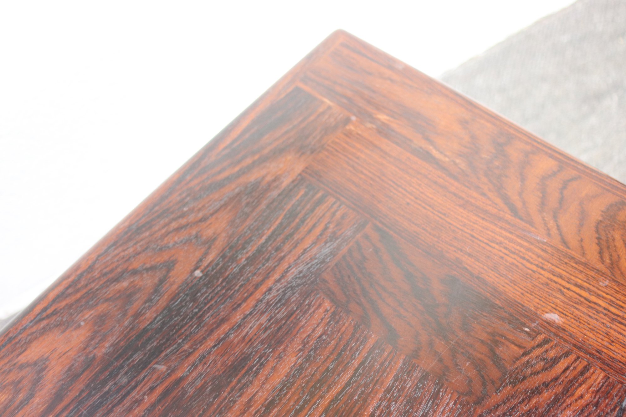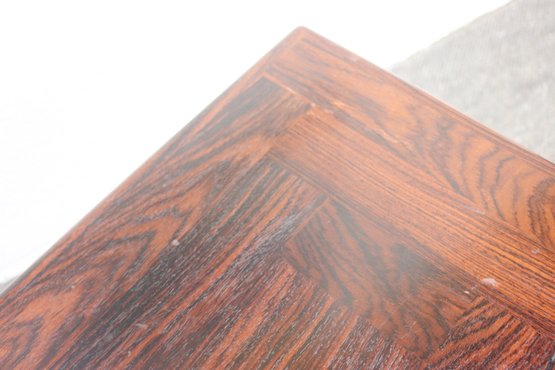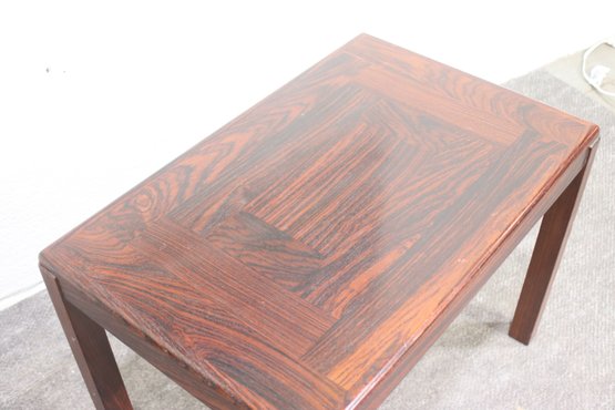 This exquisite Danish modern side table by Vejle Stole & Møbelfabrik is a stunning example of mid-century craftsmanship. Made in Denmark, it features a richly grained rosewood veneer with a striking geometric pattern on the tabletop, showcasing the beauty of Scandinavian design.