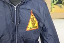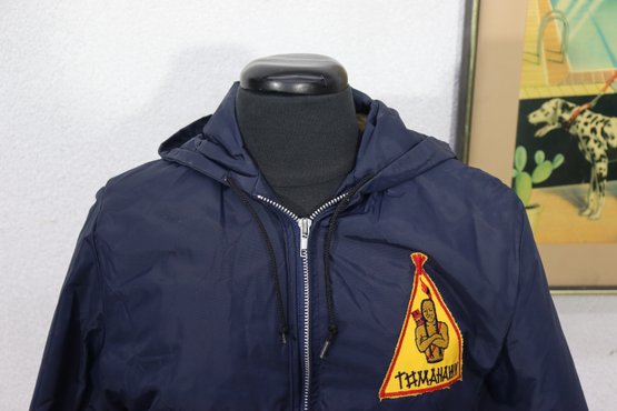 Features include a front zip closure, two side pockets, ribbed cuffs, and a unique embroidered “Teepee” patch on the chest that gives it a nostalgic, mid-century charm.