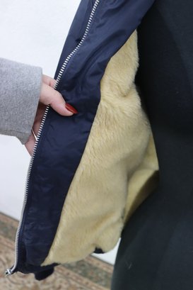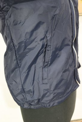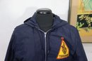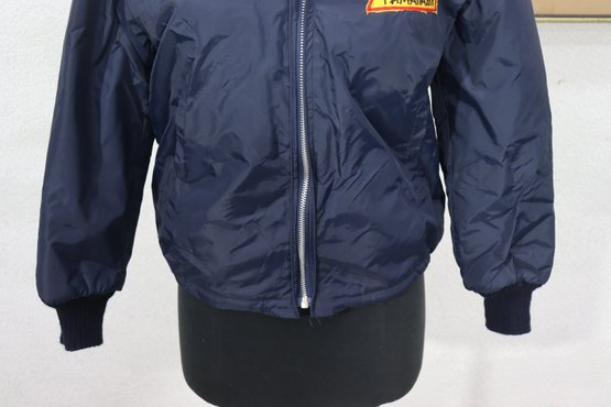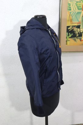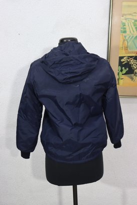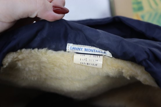 This vintage navy blue hooded jacket by Danny Montague combines warmth and classic retro style. Made with a durable nylon shell and fully lined with soft faux sherpa fleece, this piece is perfect for cool-weather wear.