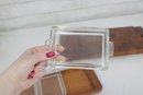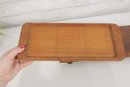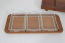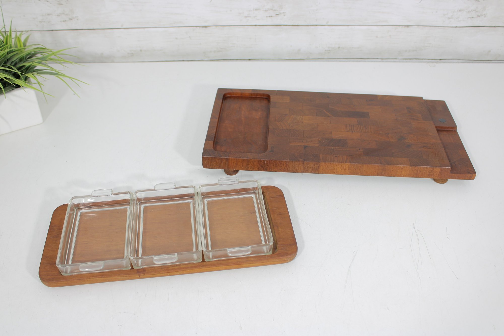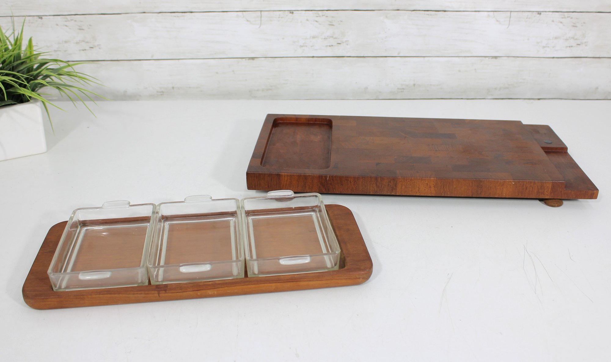 Offered is a stylish vintage Dansk teak serving set, featuring a larger serving tray and a matching smaller tray with three glass lidded inserts. This mid-century modern set showcases the clean lines and warm tones that Dansk designs are known for.