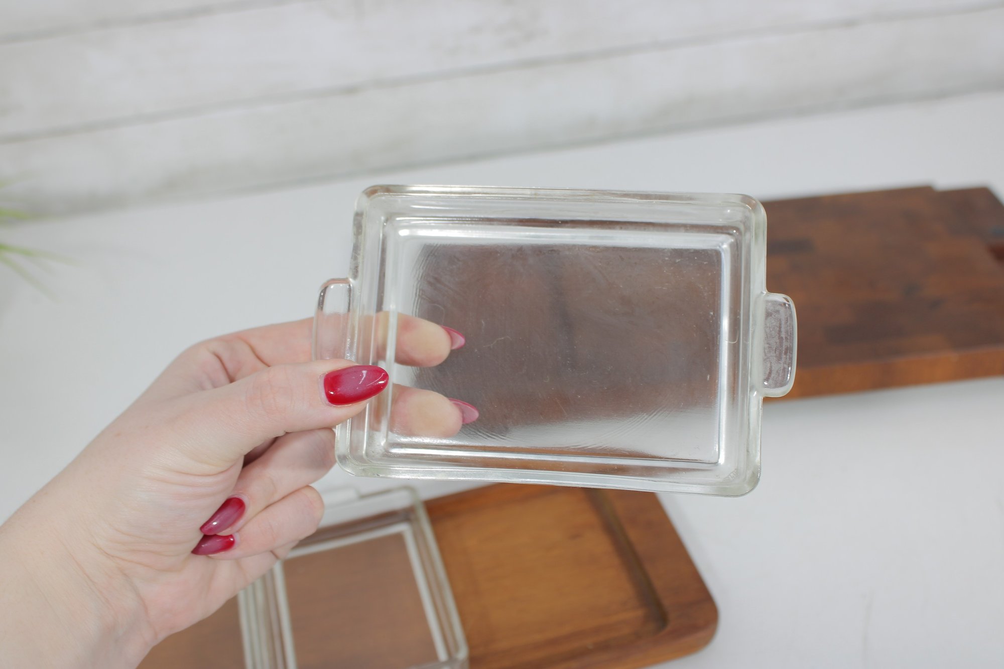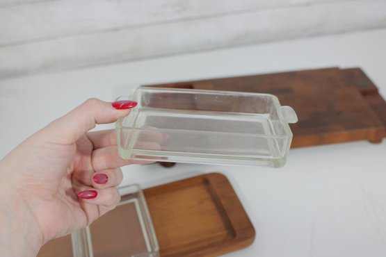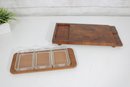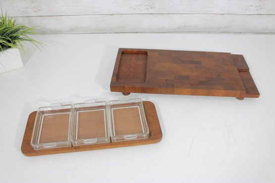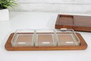 The larger tray measures approximately 17.5" x 8.5" and features a beautifully patterned teak surface with a recessed corner compartment—perfect for serving or display. The smaller tray measures approximately 13.5" x 6" and holds three individual rectangular glass dishes, each with its own fitted lid, ideal for condiments, spreads, or appetizers.