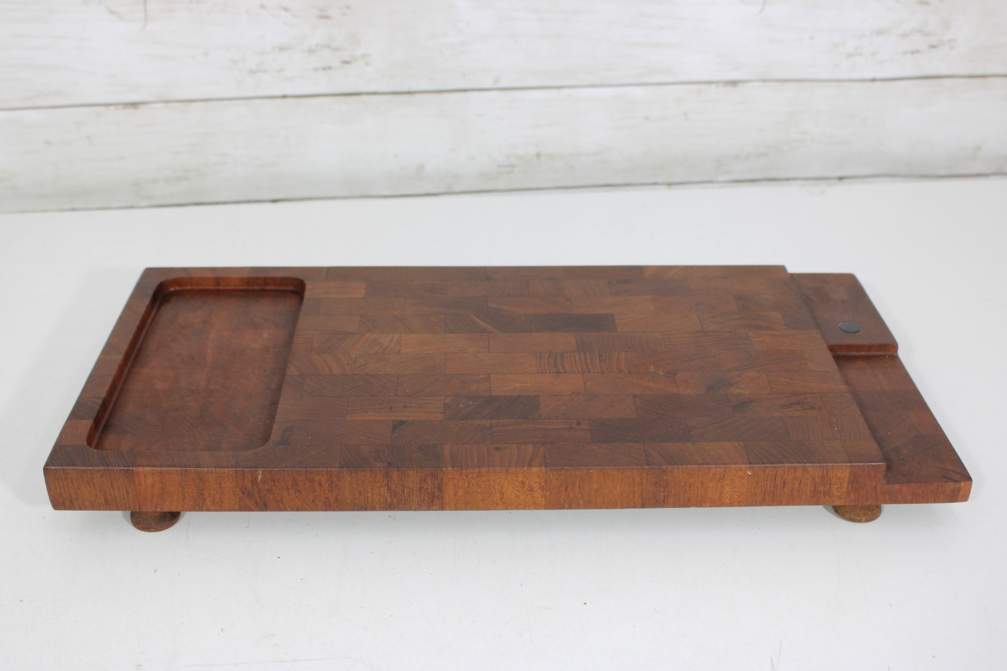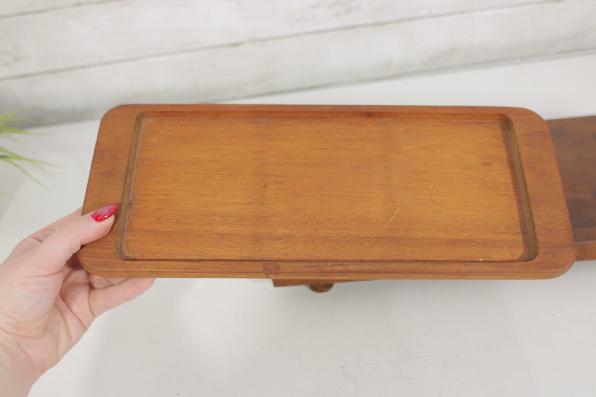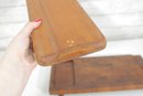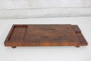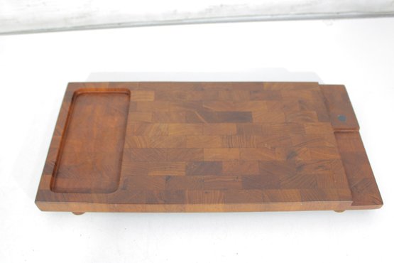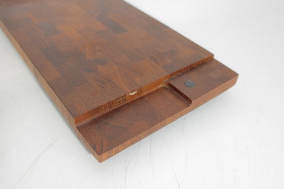 Crafted from quality teak wood, both trays display a rich grain pattern and timeless appeal. The underside retains original markings/labels indicating Dansk origin.
